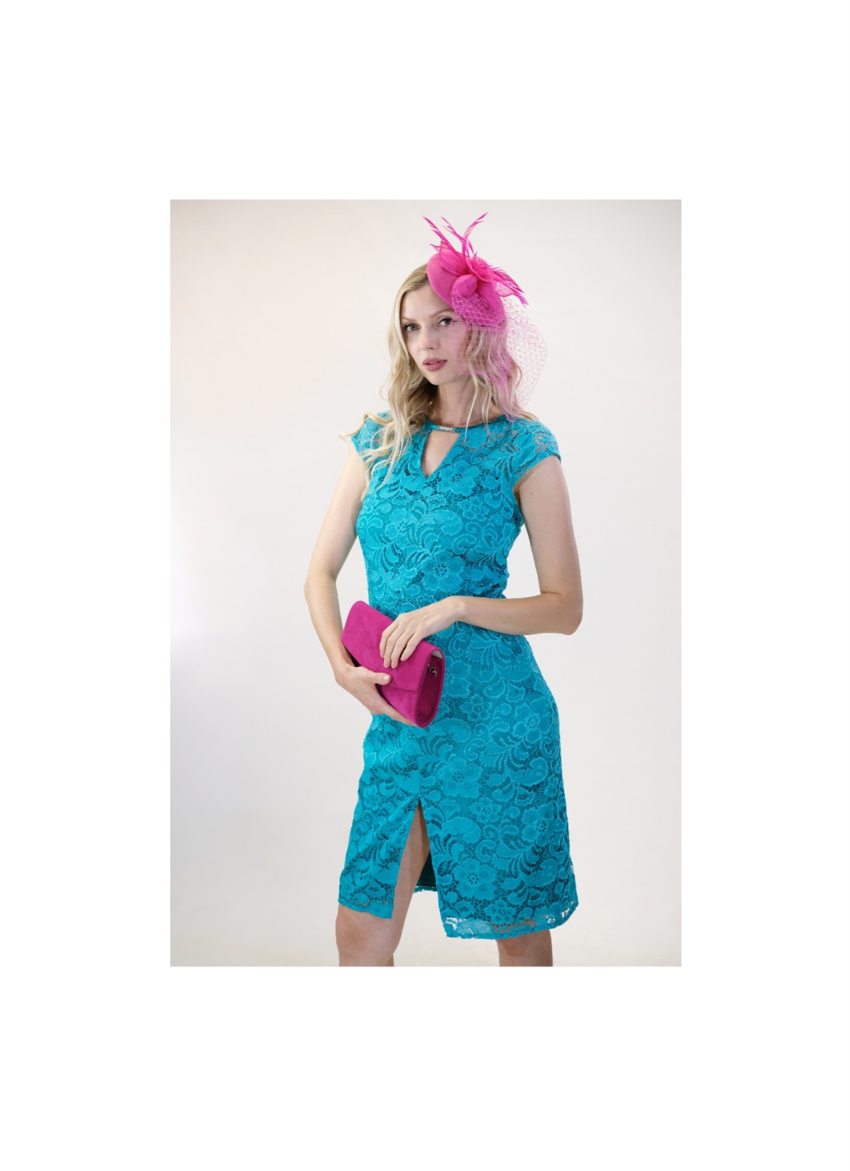 Šaty sú ušité v úzkom strihu z talianskej krajky, ktorá má nadherný jemný vzor. Šaty sú podšité saténom, čo im dodáva pevnosť a lesk. Šaty sú ako stvorené na oslavy každého druhu. Šaty sú ušité vo výraznej tyrkysovej farbe. Šaty môžete kombinovať ako naša aranžérka s cyklaménovými doplnkami.