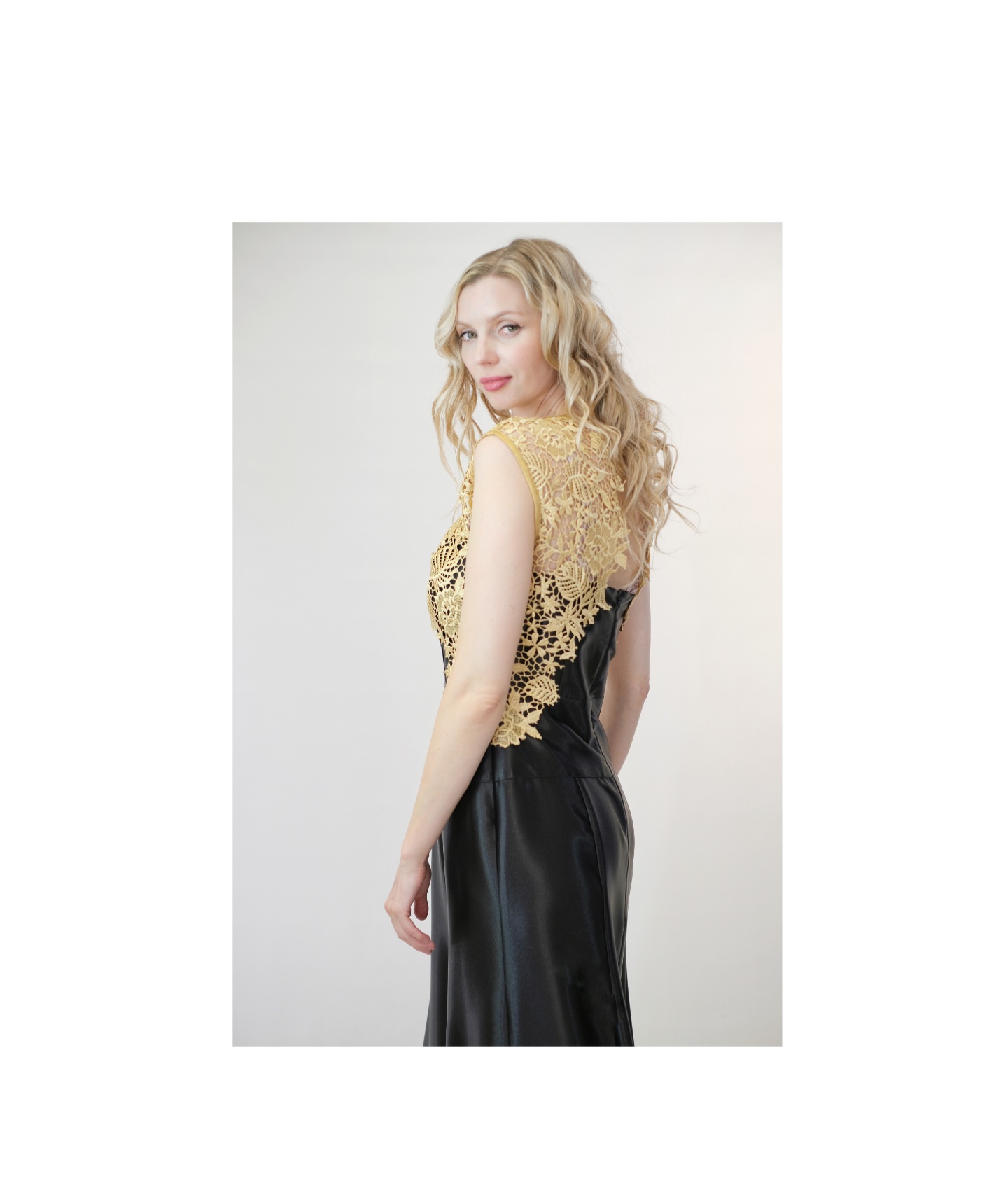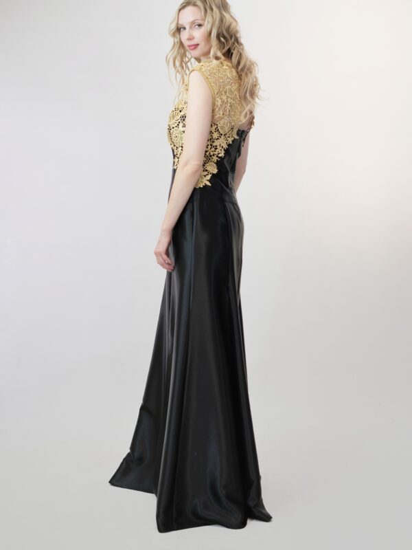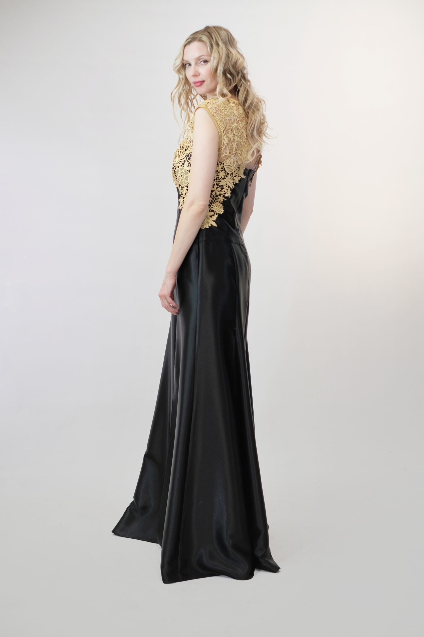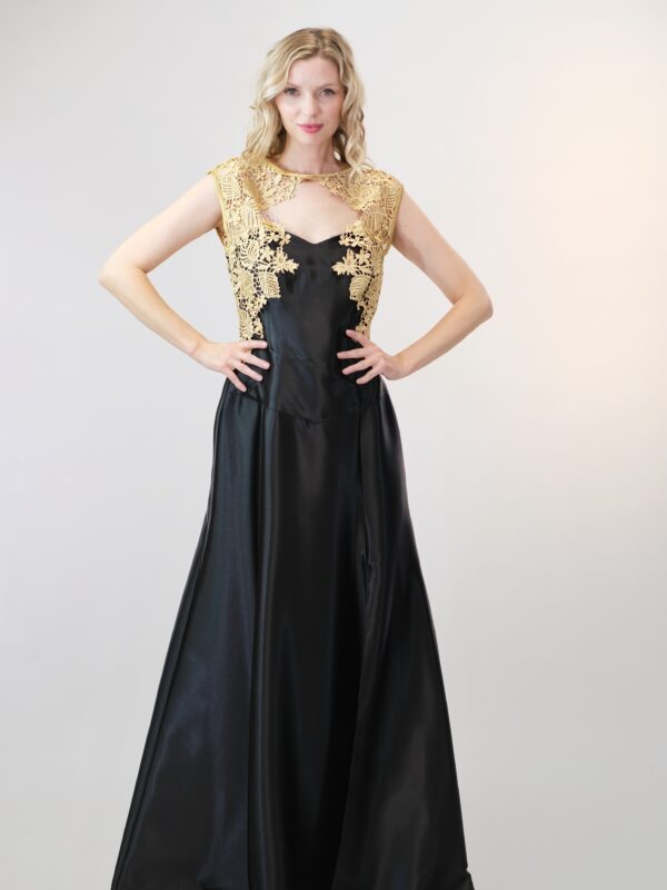 Šaty sú ušité v lesklom saténe, ktorý im dodáva eleganciu. Vrchný diel šiat je ušitý v úzkom strihu, ktorý Vám sadne na postavu a v kombinácii s voľnejšou áčkovou suknicou vytvára pekný kontrast. Zaujímavým detailom na šatách je našitá elegantná krajka, ktorá krásne podtrhuje ženskosť šiat.