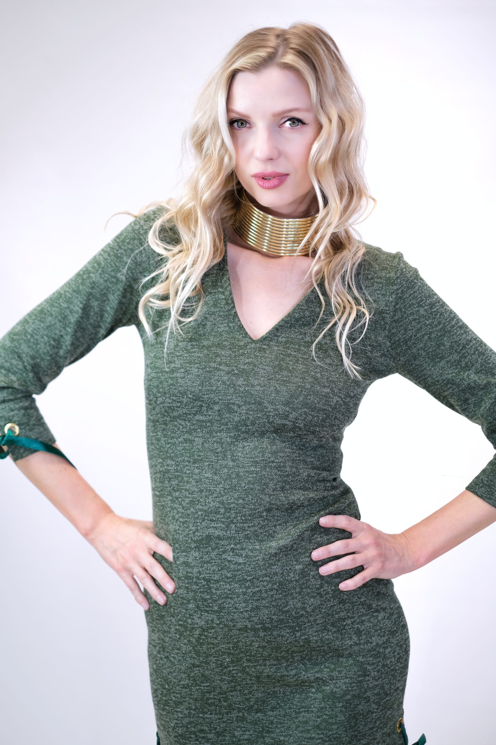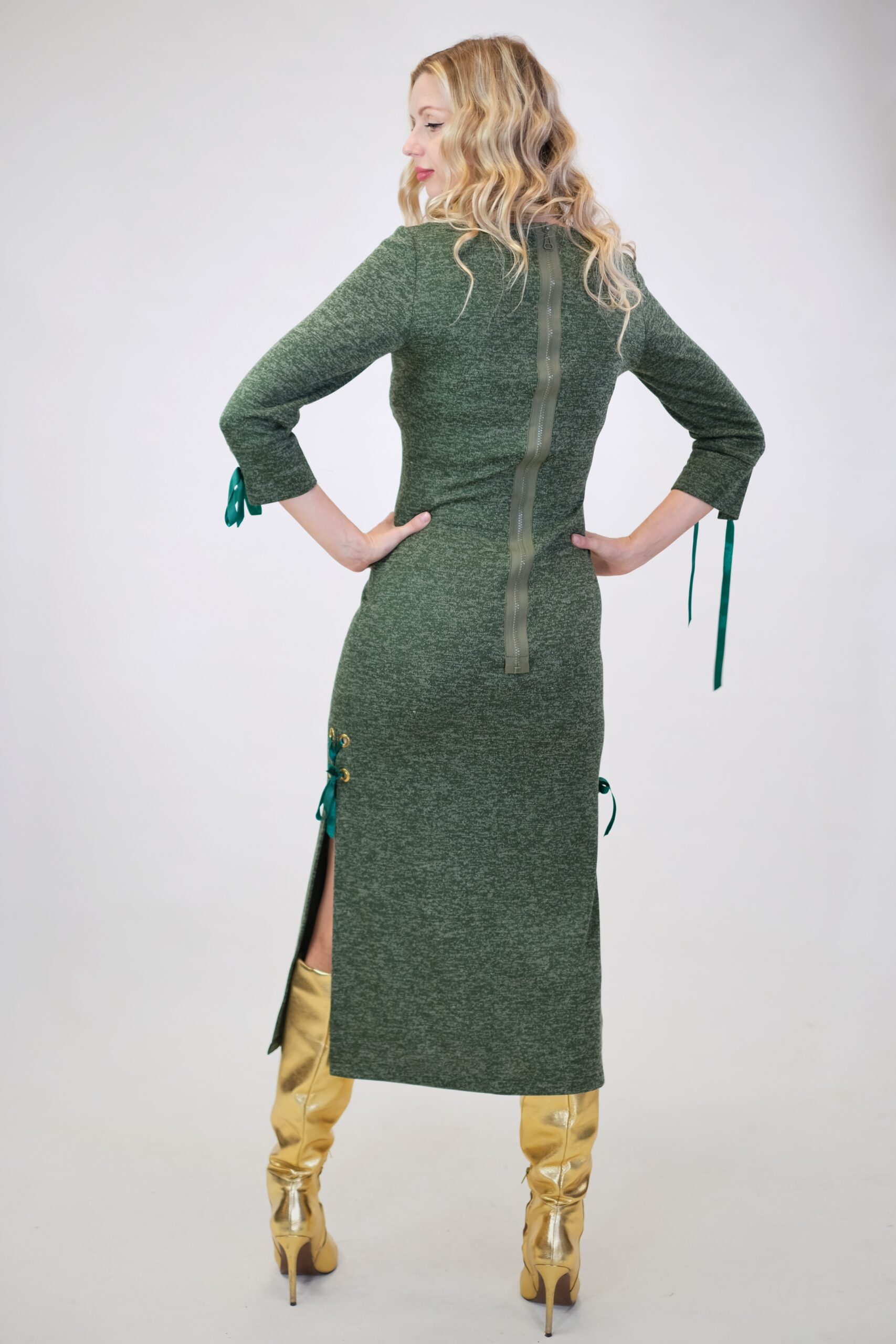 Šaty sú navrhnuté v jednoduchom prispôsobivom strihu z úpletového materiálu, ktorý vám sadne ako druhá koža. Šaty sú ušité z hrejivého svetrového materiálu, ktorý sa obzvlášť hodí do chladných jesenných alebo zimných dní. Šaty sú ušité v olivovo zelenej farbe, ktorá sa výborne kombinuje s typickými farbami jesene, ako okrová žltá alebo bordová. Zaujímavým detailom na šatách sú rozstrihy na bokoch, ktoré im dodávajú šmrnc. Šaty sú ušité v midi dĺžke.