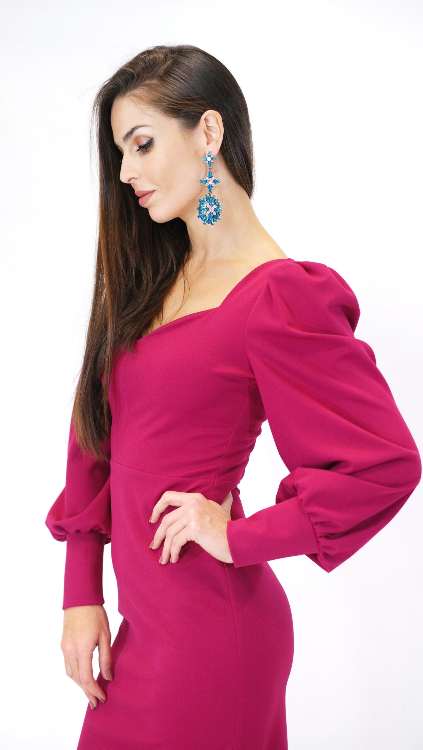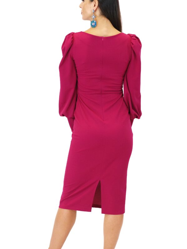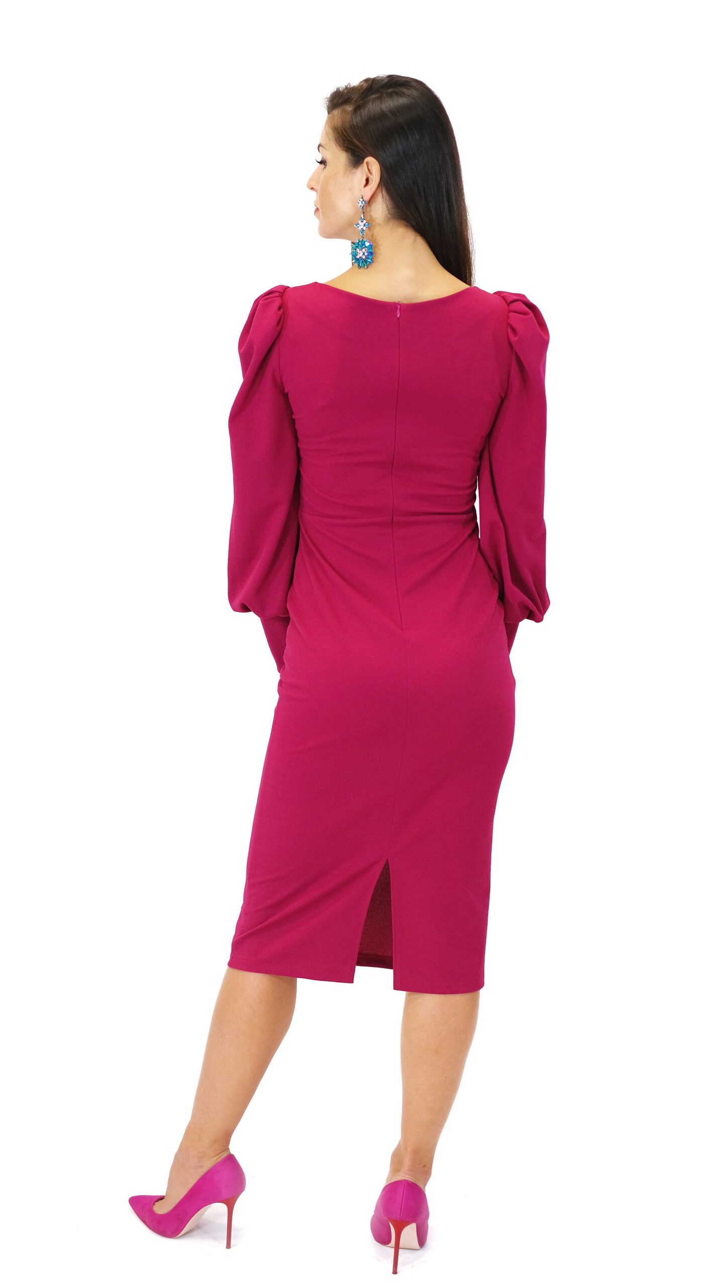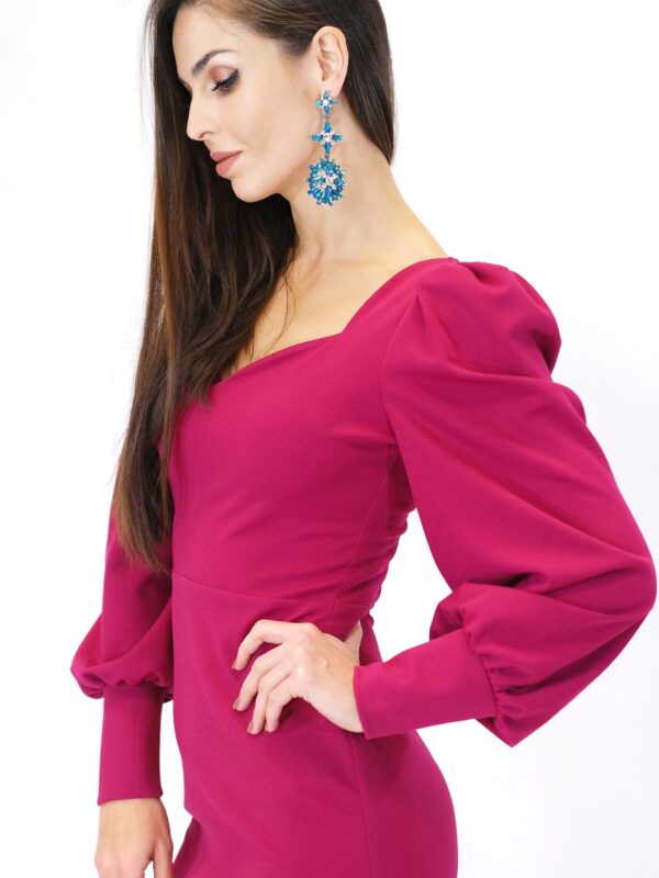 Šaty sú navrhnuté v puzdrovom strihu, ktorý aj vďaka pohodlnému úpletovému materiálu obomkne Vašu postavu. Šaty sú ušité z vysoko elastického materiálu, ktorý Vám zabezpečí komfort. Šaty sú ušité v dĺžke midi, takže sa hodia do práce aj na večierky, kde je predpísaná dĺžka šiat. Zaujímavým detailom šiat sú bohato nazberané rukávy ukončené elastickou manžetou, ktoré šatám dodávajú šmrnc a eleganciu. Šaty sú ušité v sýtej cyklámenovej farbe skvele sa k nim hodia strieborné alebo čierne doplnky. Nezaváhajte a experimentujte aj s doplnkami v odtieňoch modrej.