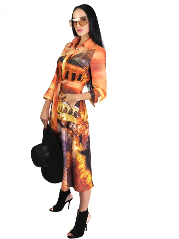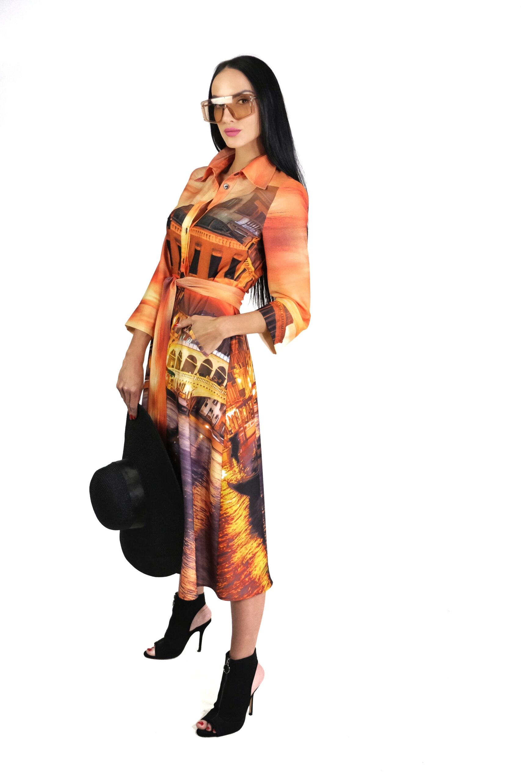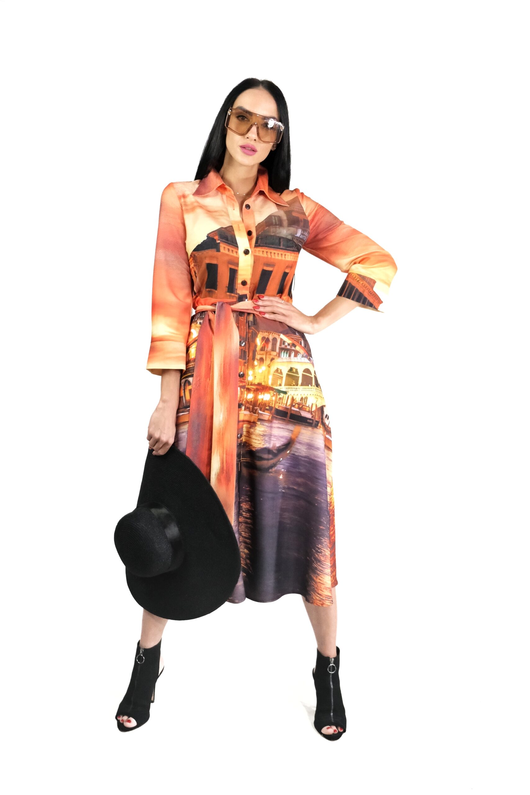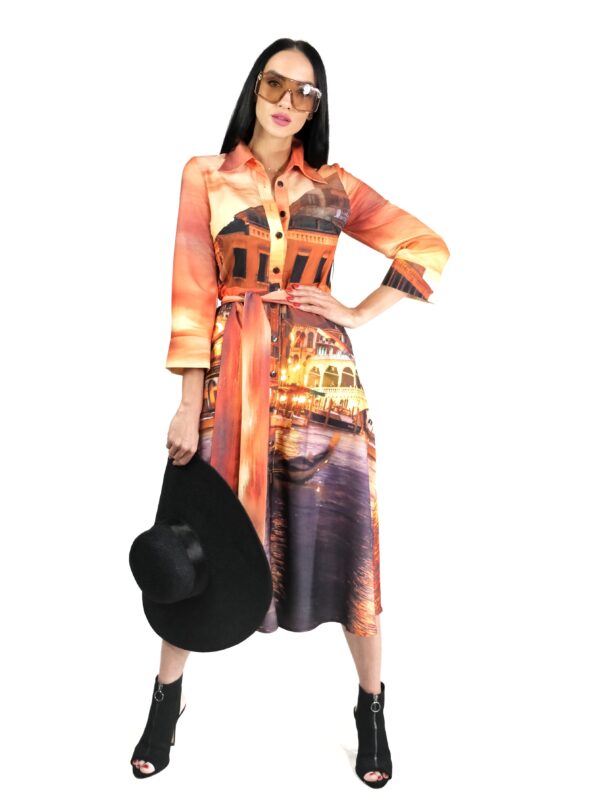 Šaty sú ušité v obľúbenom košeľovom strihu, ktorý výborne sadne na každý typ postavy. Šaty sú ušité v midi dĺžke a hodia sa ako na oslavy, tak aj do práce. Šaty sú dych vyrážajúce hlavne kvôli zobrazeniu svetovo známeho mesta gondolierov a milencov Benátok. Skvelé zobrazenie talianskeho skvostu hrá všetkými farbami zapadajúceho slnka. Oranžová predstavuje jednu z top farieb sezóny a ľahko ju skombinujete s tmavšími farbami ako čierna aj výraznými letnými ako napríklad slniečkovo žltá.