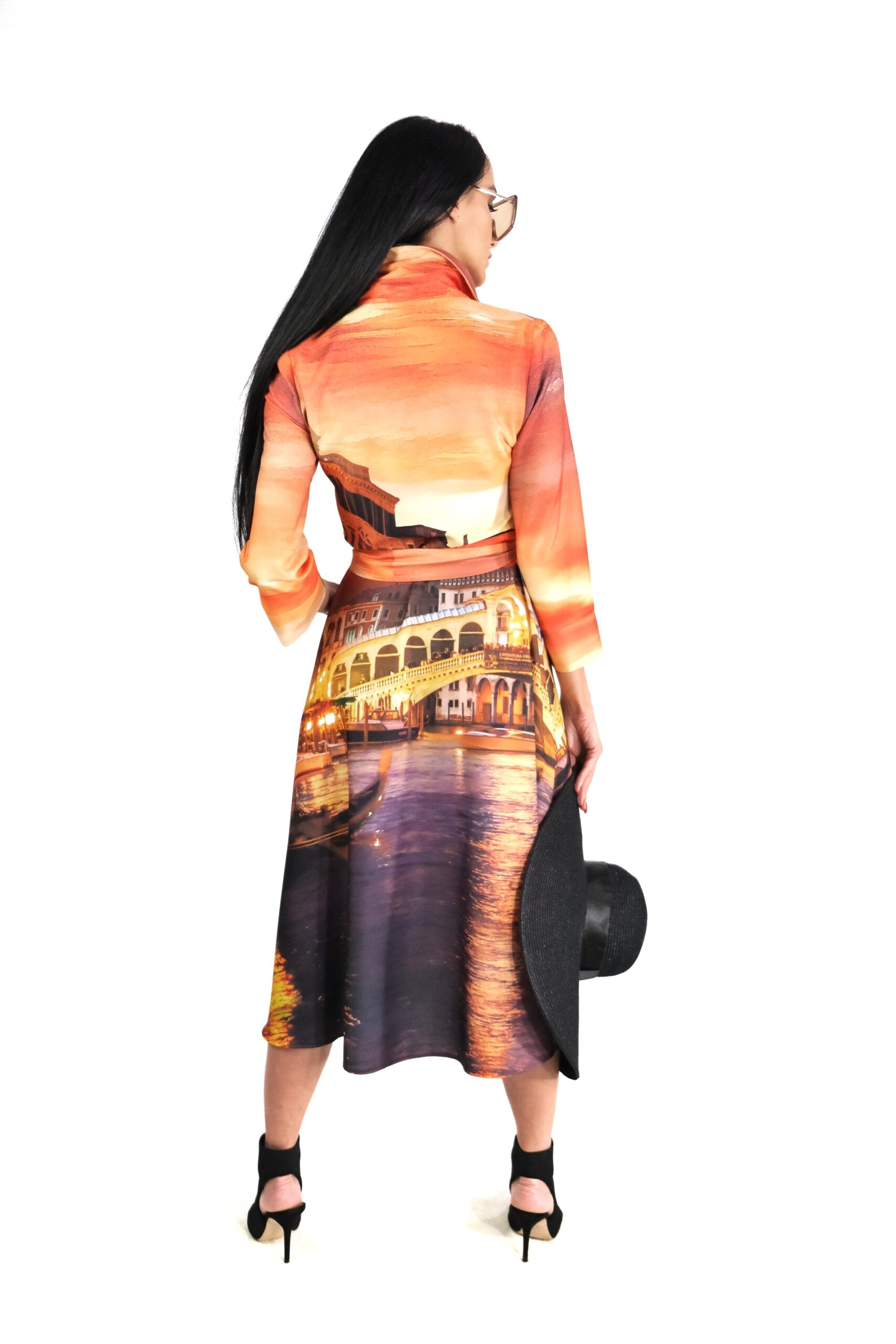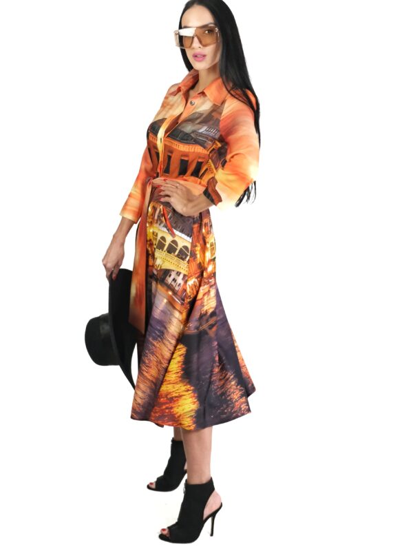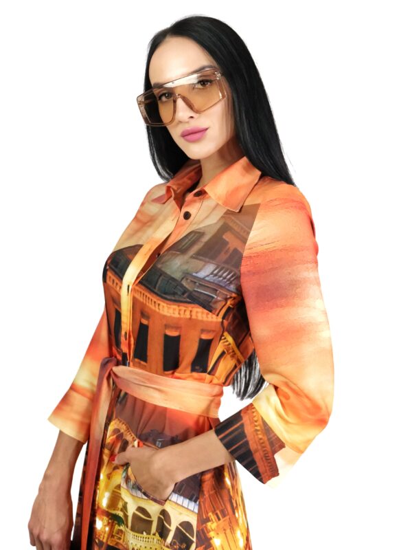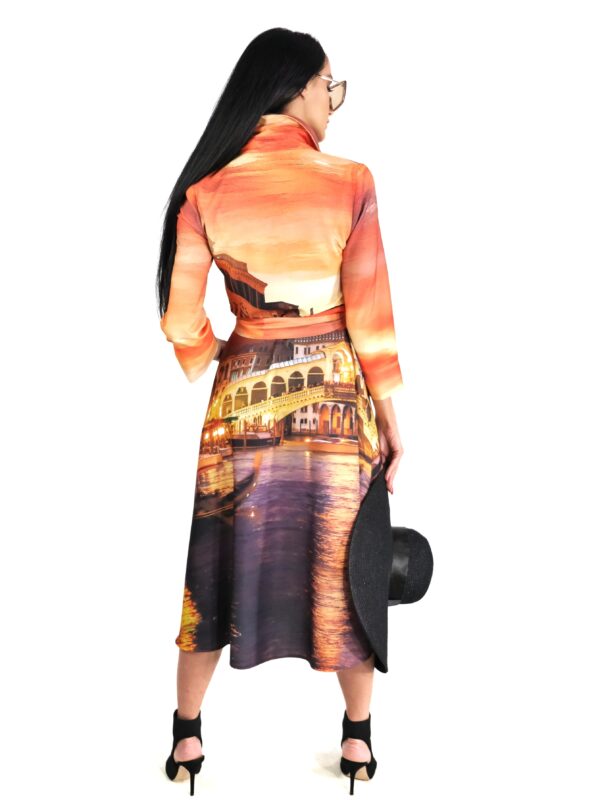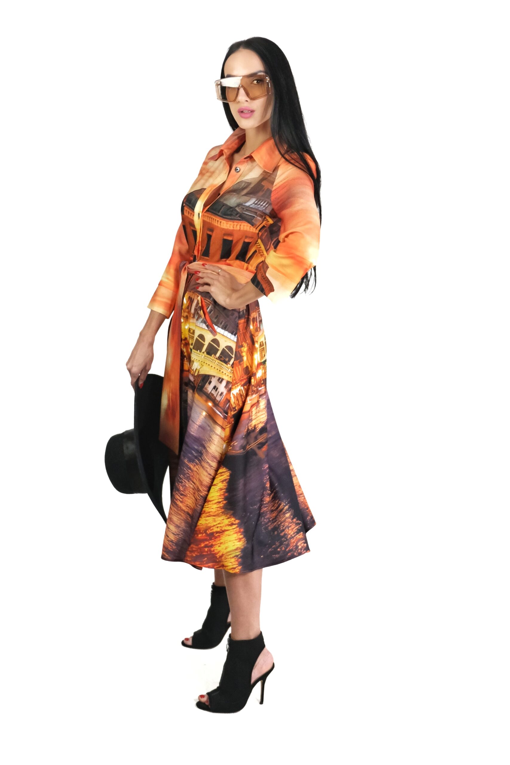 Šaty sú ušité v obľúbenom košeľovom strihu, ktorý výborne sadne na každý typ postavy. Šaty sú ušité v midi dĺžke a hodia sa ako na oslavy, tak aj do práce. Šaty sú dych vyrážajúce hlavne kvôli zobrazeniu svetovo známeho mesta gondolierov a milencov Benátok. Skvelé zobrazenie talianskeho skvostu hrá všetkými farbami zapadajúceho slnka. Oranžová predstavuje jednu z top farieb sezóny a ľahko ju skombinujete s tmavšími farbami ako čierna aj výraznými letnými ako napríklad slniečkovo žltá.