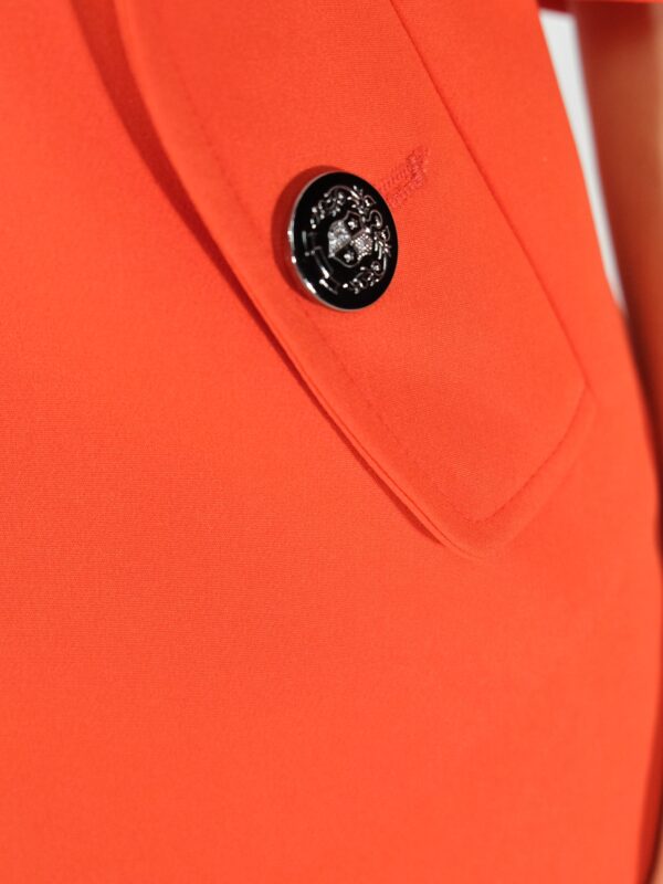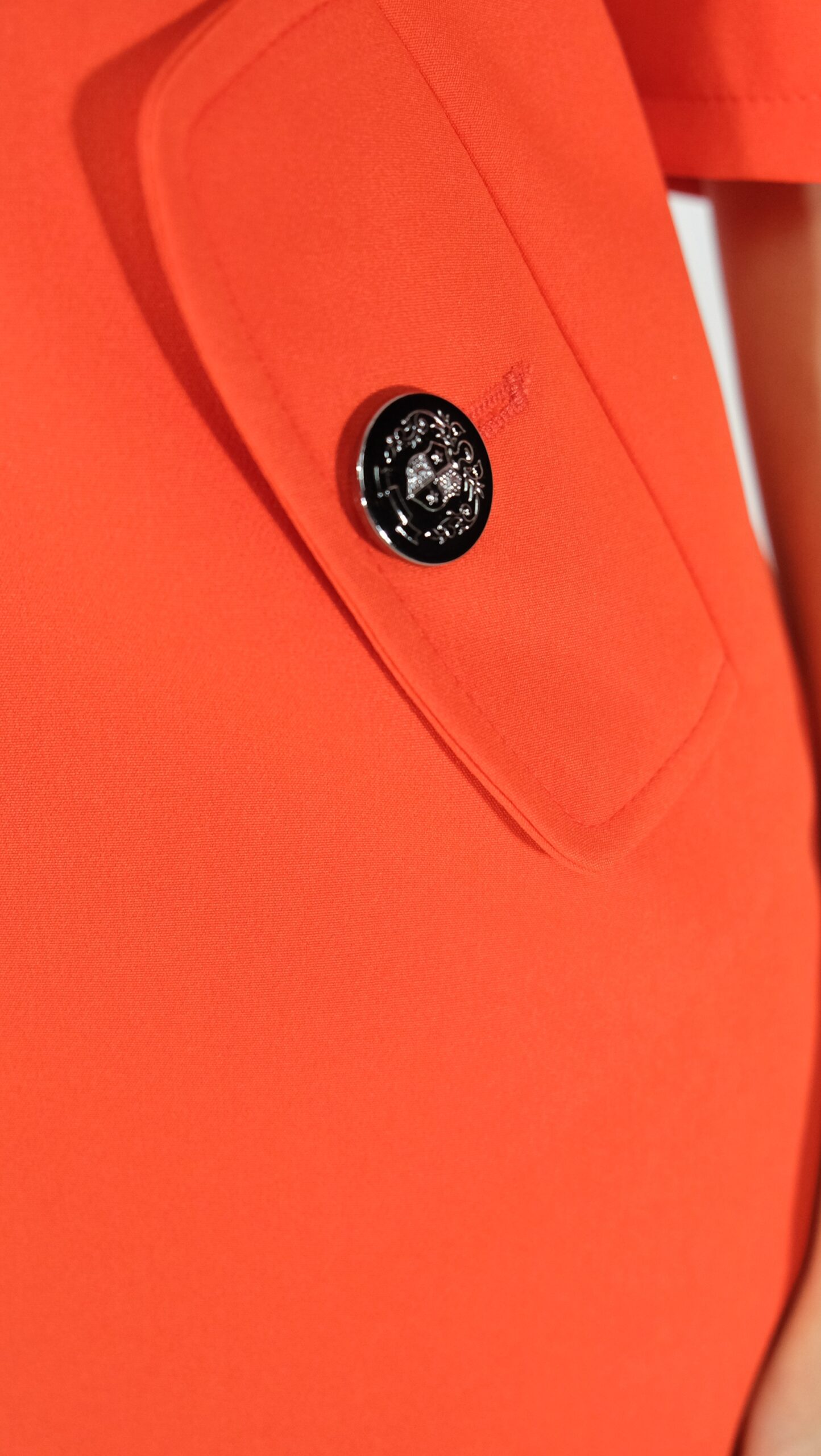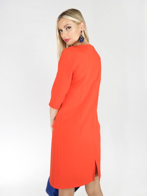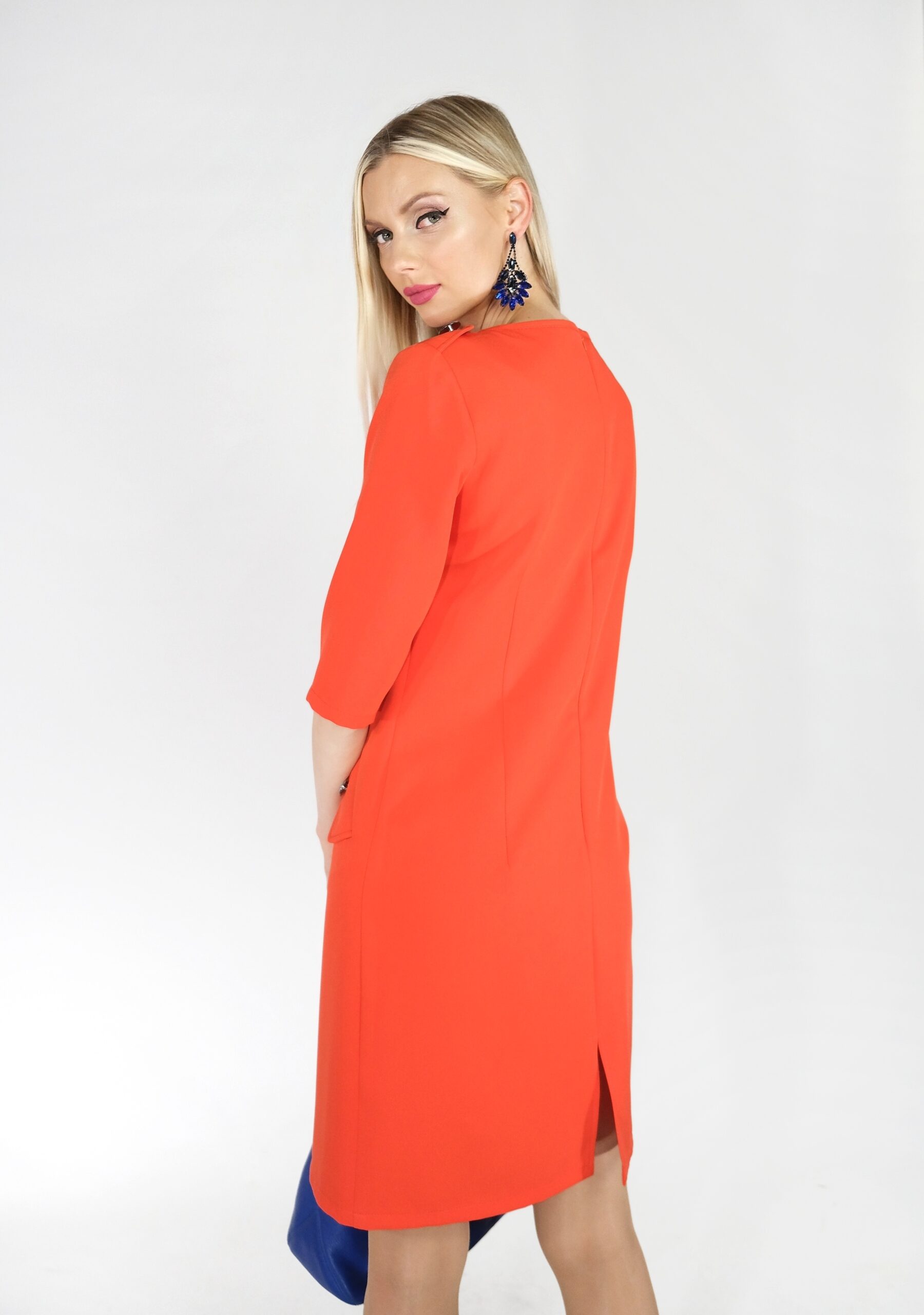 Šaty sú navrhnuté v pohodlnom áčkovom strihu, ktorý výborne sadne na každú postavu . Šaty sú ušité s falošnými vreckami a zaujímavým detailami v podobe našitých gombíkoch na ramenách. Šaty majú rukávy dlhé po lakte. Šaty sú navrhnuté v trendy oranžovej farbe, ktorá je farbou tohto leta a oživia každý Váš outfit. Skombinujte ich s kráľovsky modrými doplnkami ako naša stylistka pre wau effekt.