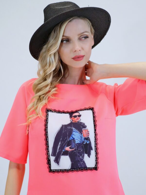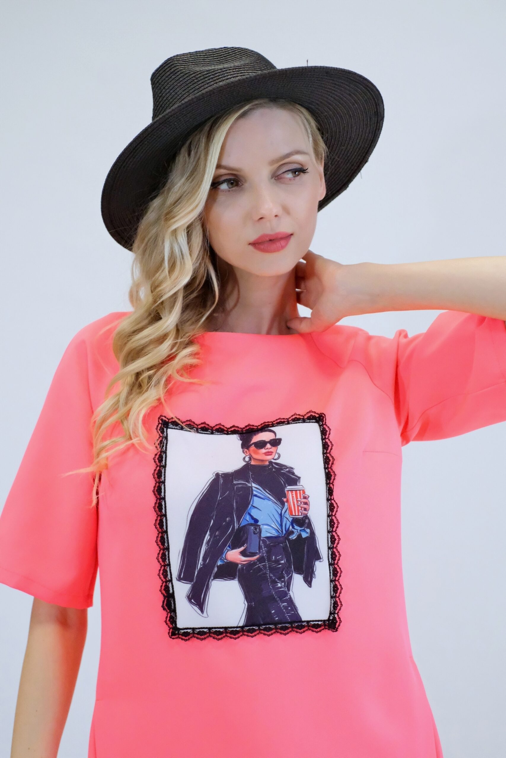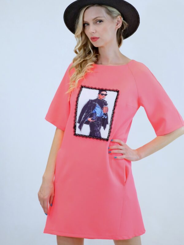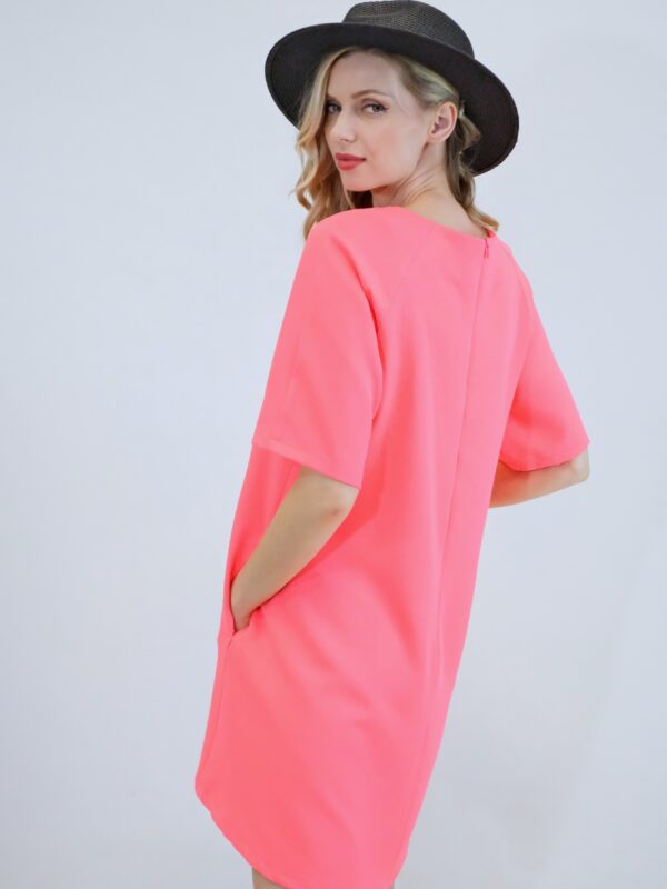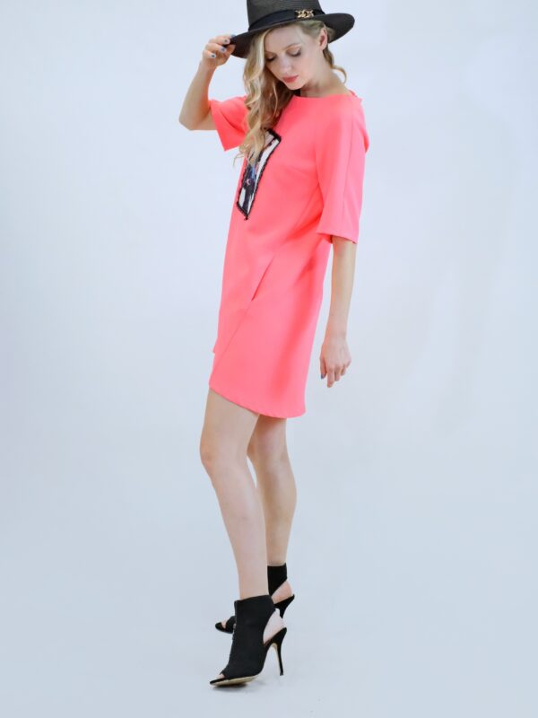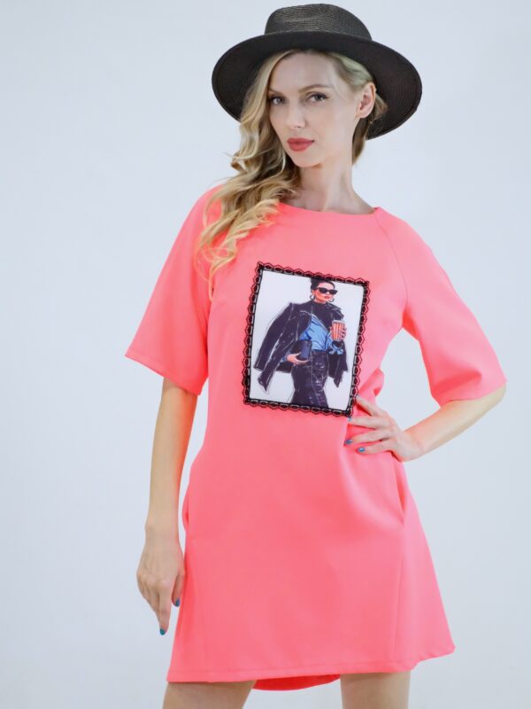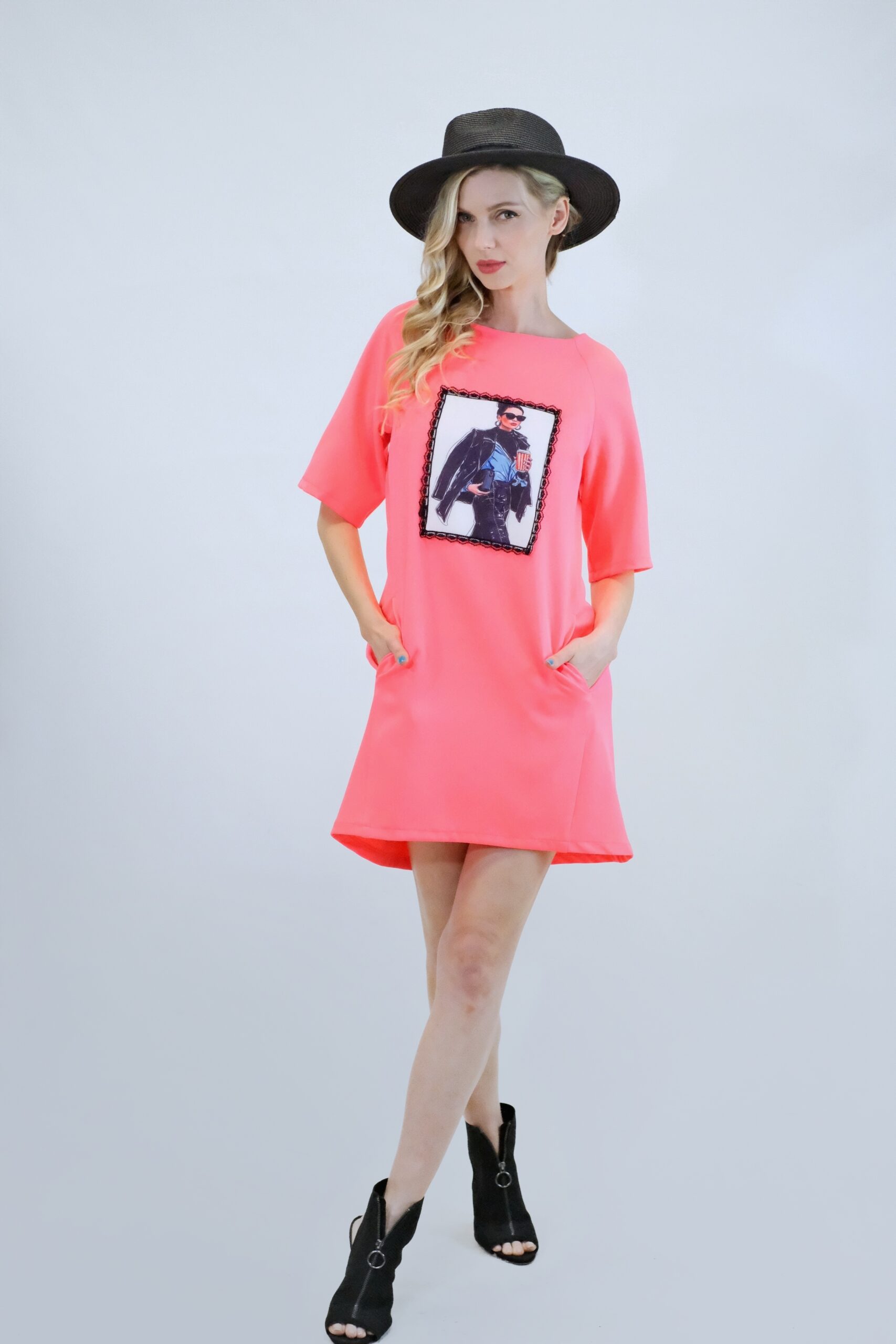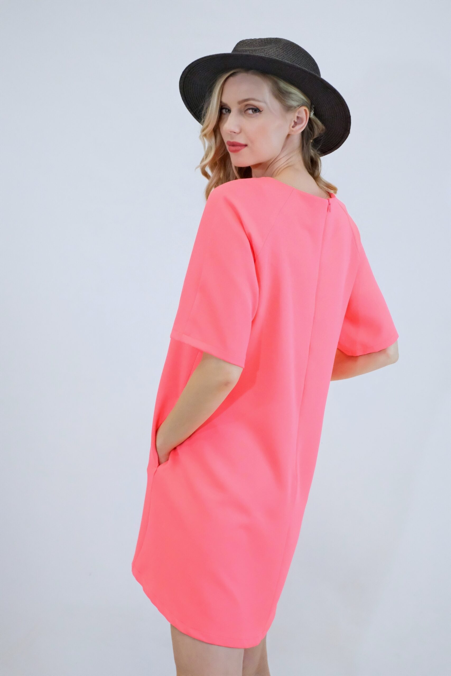Šaty sú navrhnuté v pohodlnom oversize strihu, v ktorom sa budete cítiť komfortne počas celého dňa. Strih šiat je doplnený o praktické vrecká, ktoré šaty predurčujú na ležérnejšie nosenie. Šaty môžete kombinovať elegantne s opätkami alebo ležérne napríklad s bielymi teniskami. Šaty majú na prednom dieli našitú nášivku. Šaty majú volné padavé rukávy, ktoré skvele doplňajú ich celkový uvolnený tón. Šaty sú ušité vo výraznej neónovej farbe, v ktorej zažiarite kdekoľvek.