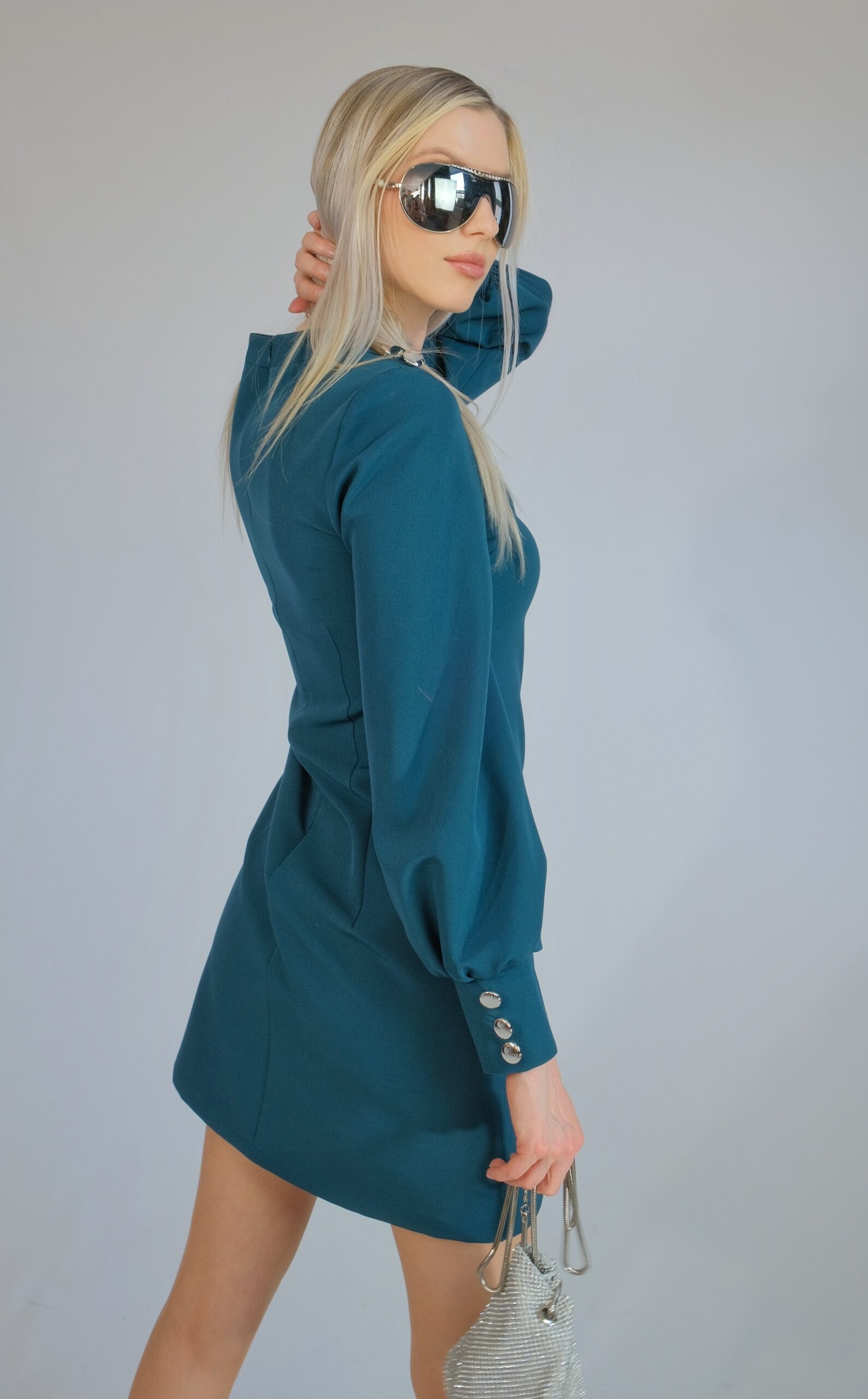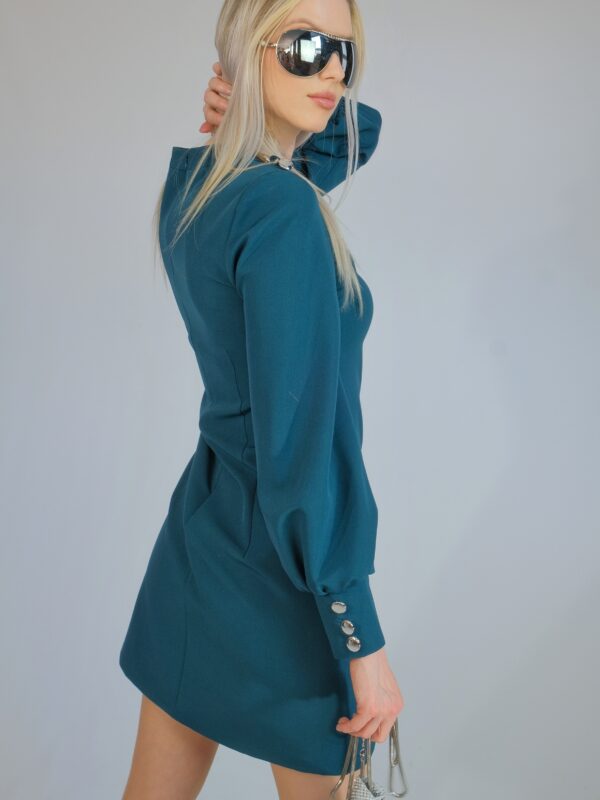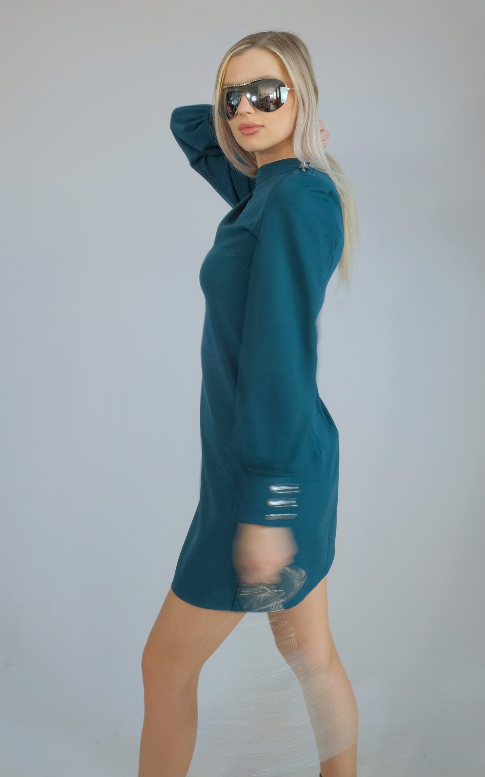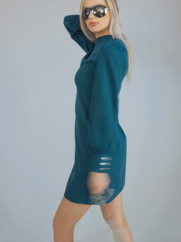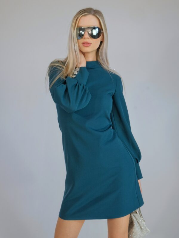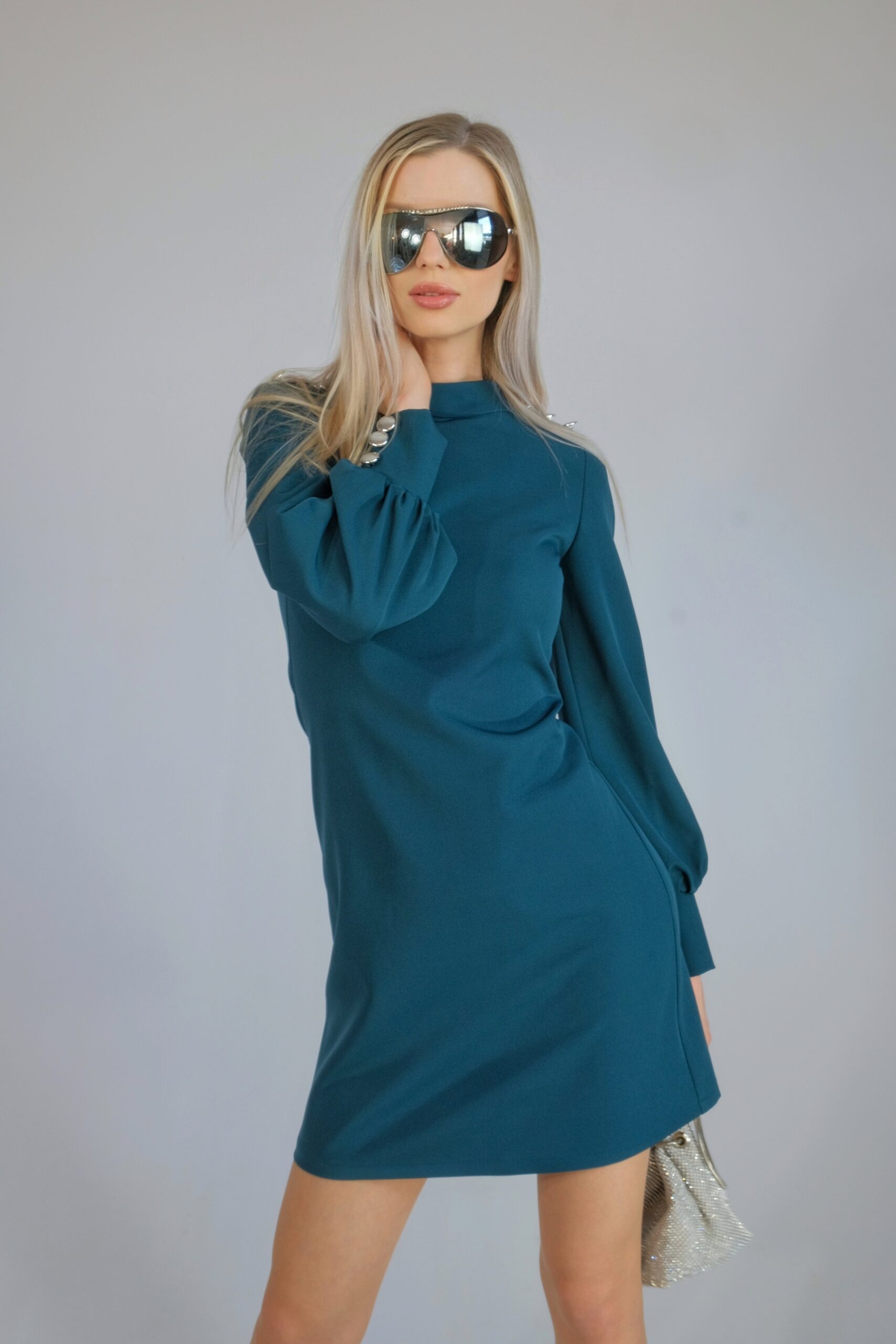Šaty ušité v jednoduchom mierne rozširujúcom sa strihu, ktorý sadne na každú postavu ako uliaty. Šaty sú navrhnuté v tyrkysovej farbe so zaujímavým detailom manžiet zakončených ozdobnými gombíkmi. Pri vhodnej kombinácii doplnkov sú šaty vhodné do práce aj do spoločnosti.