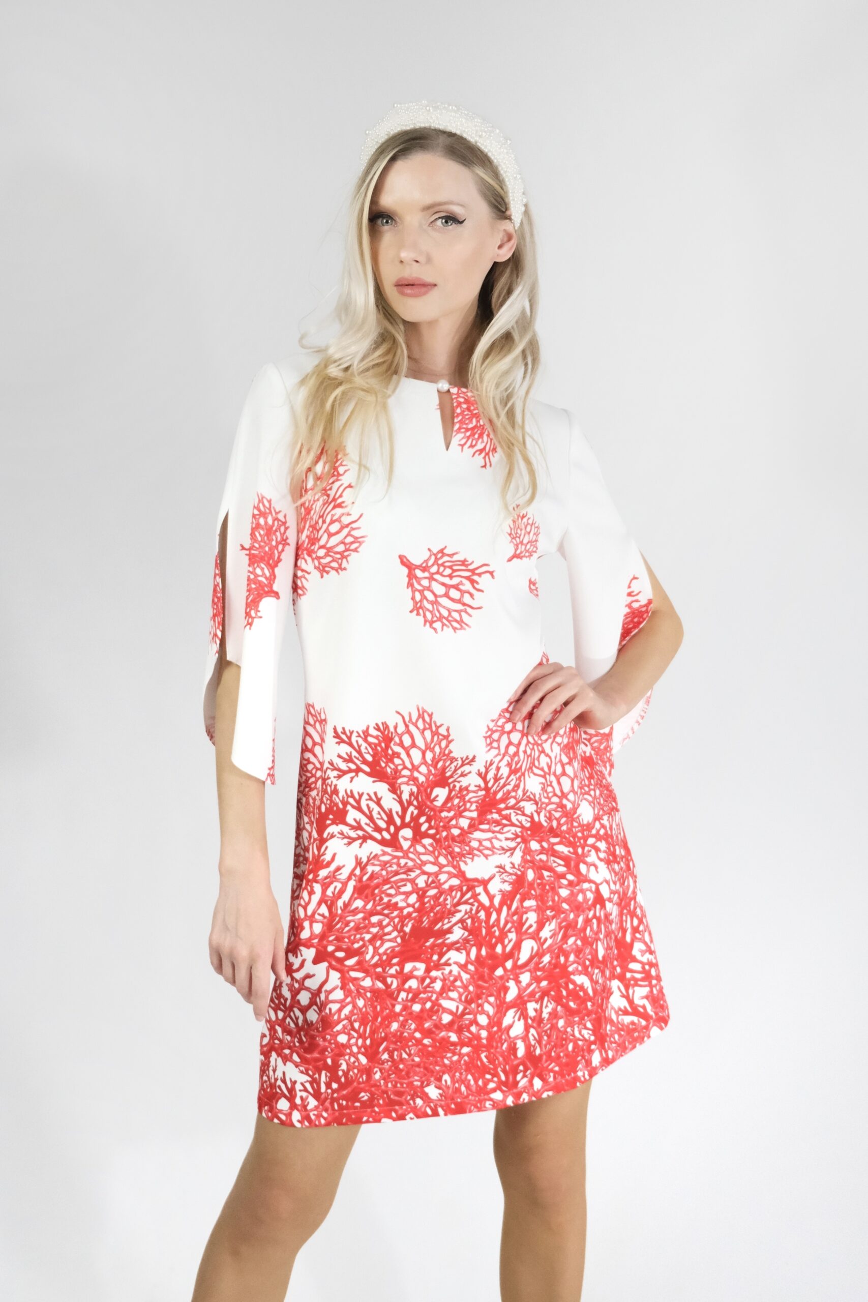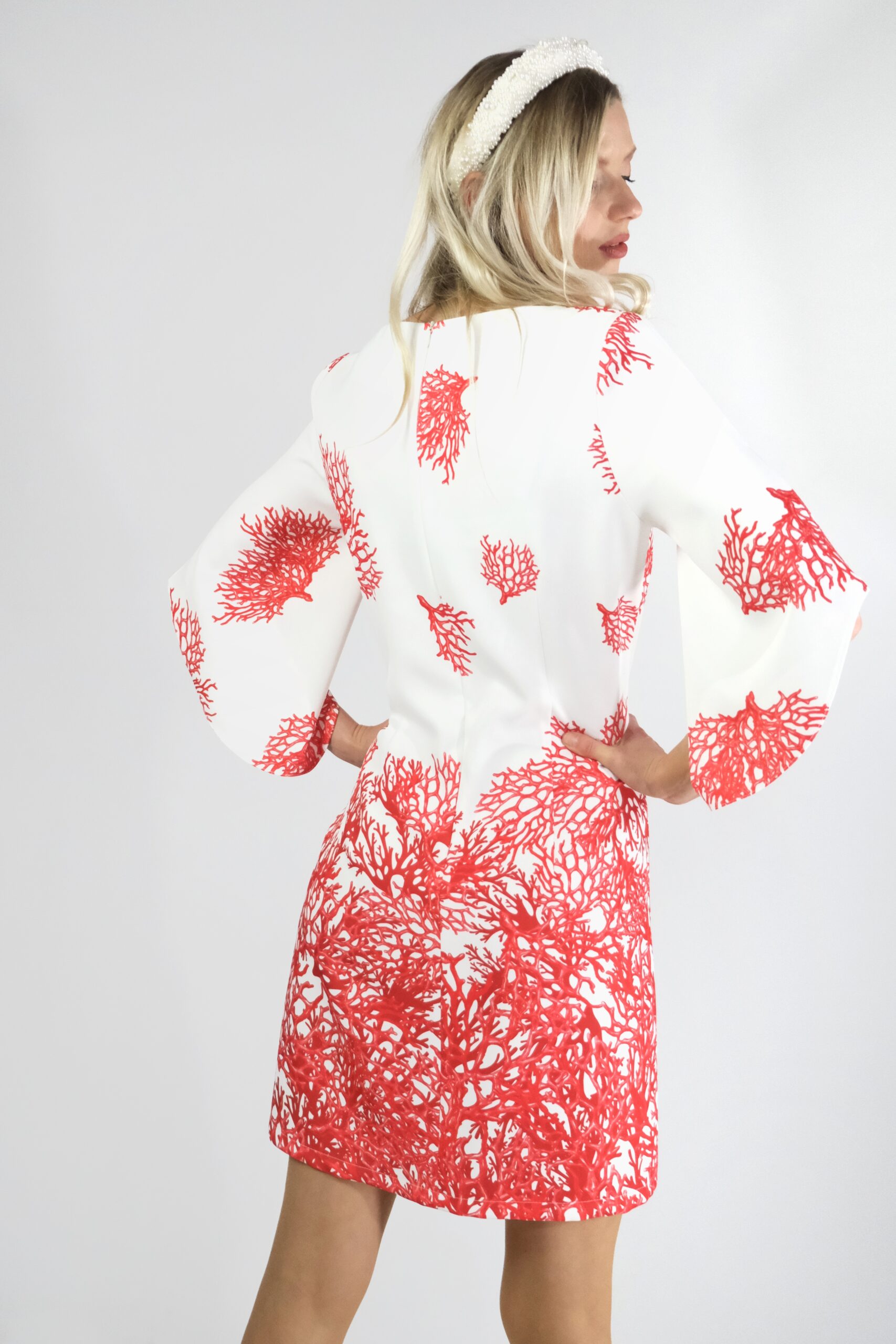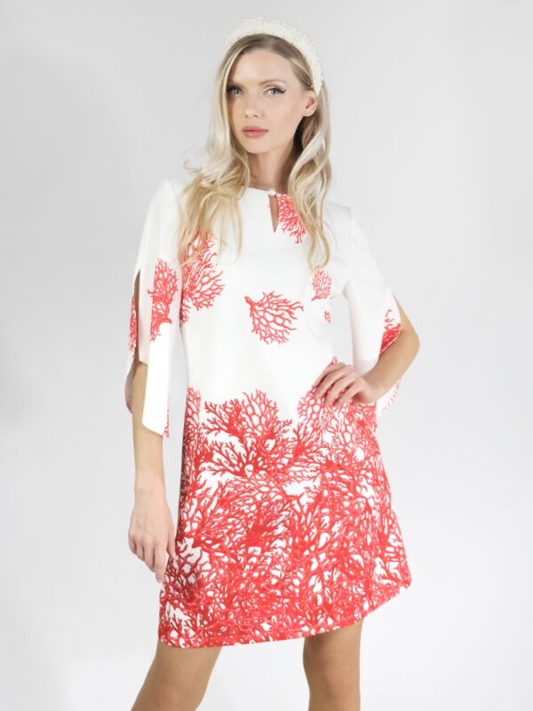 Šaty sú navrhnuté v jednoduchom áčkovom strihu, ktorý skvele padne na každú postavu. Šaty sú ušité v autorskej potlači pripomínajúcej korálový útes, ktorá hrá farbami leta a skvele vynikne na letnej pokožke. Šaty majú romantické zvonové rukávy s prestrihmi. Zaujímavým detailom je perla vo výstrihu, ktorá im dodáva na elegancii.