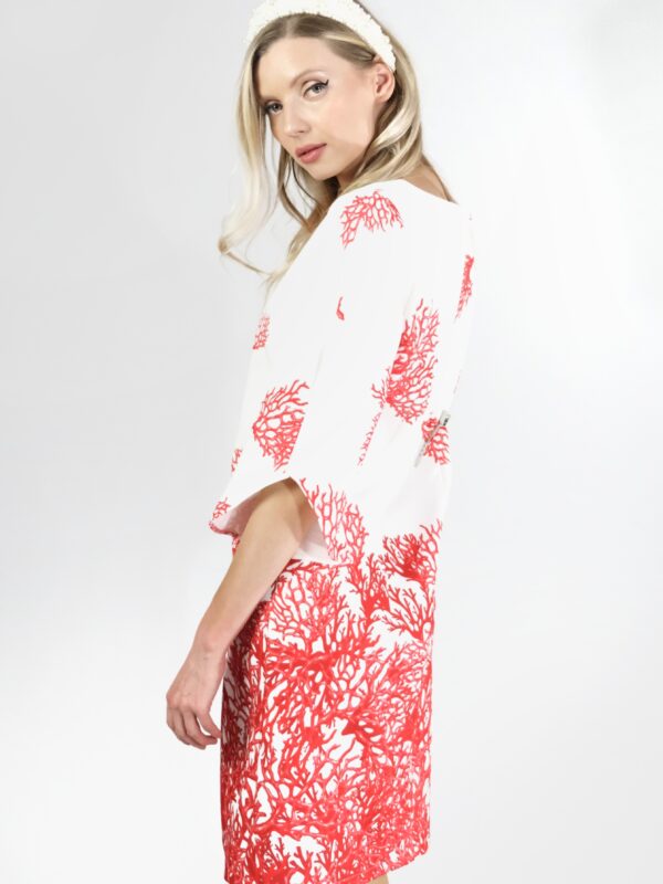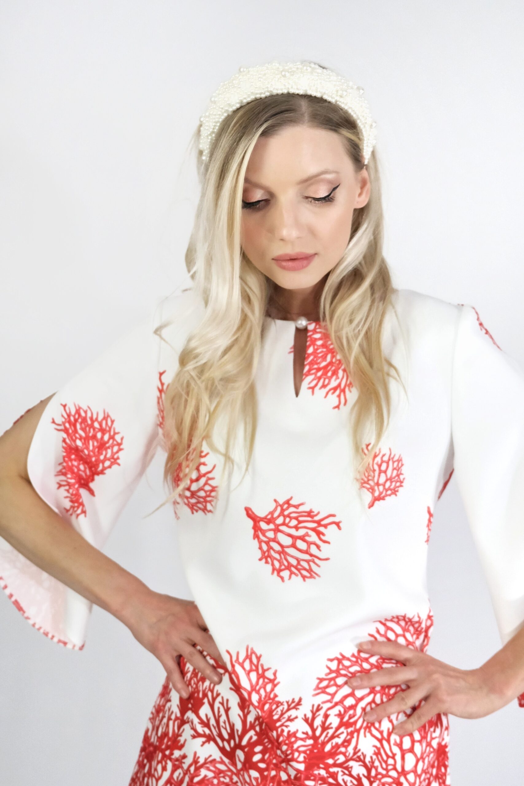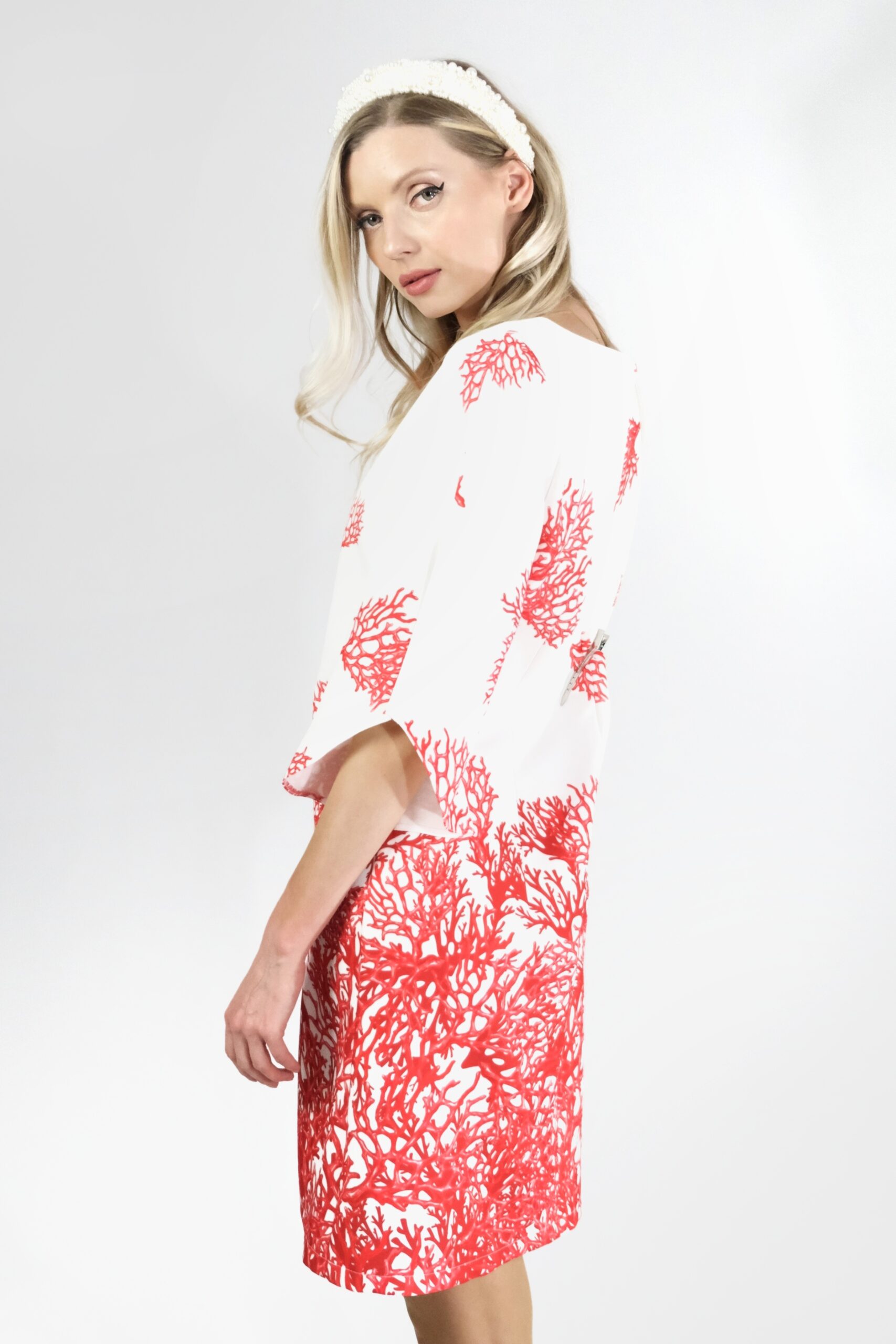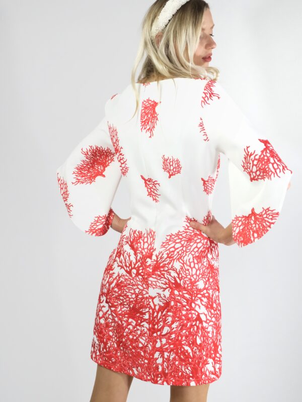 Šaty sú navrhnuté v jednoduchom áčkovom strihu, ktorý skvele padne na každú postavu. Šaty sú ušité v autorskej potlači pripomínajúcej korálový útes, ktorá hrá farbami leta a skvele vynikne na letnej pokožke. Šaty majú romantické zvonové rukávy s prestrihmi. Zaujímavým detailom je perla vo výstrihu, ktorá im dodáva na elegancii.