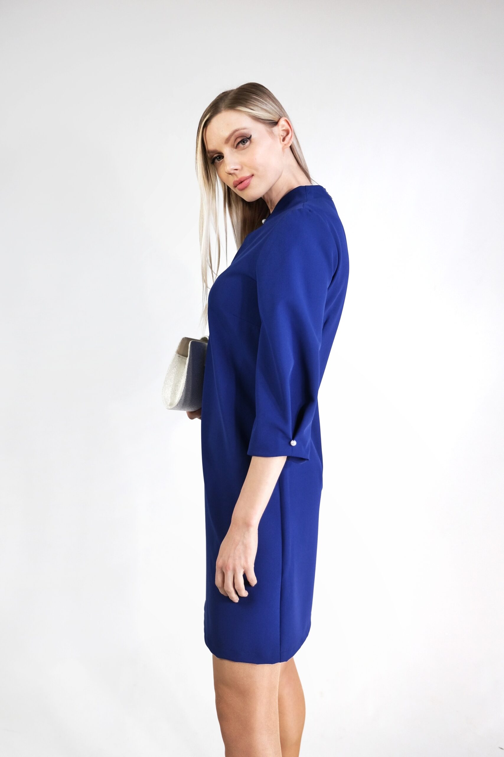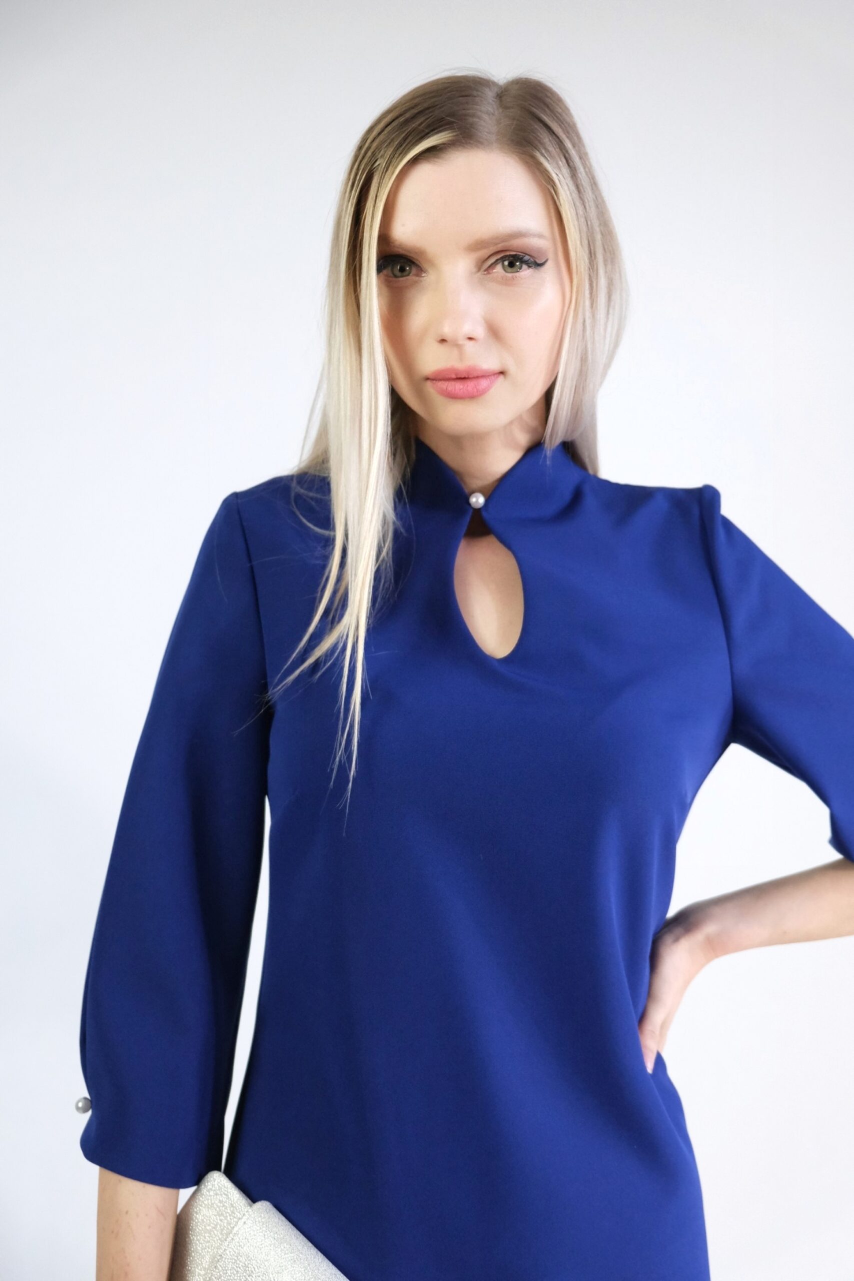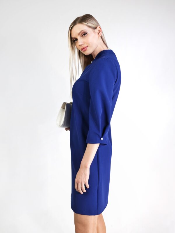 Šaty ako stvorené na bežný pracovný deň, ktorý bude zrazu neobyčajný. Poprípade v kombinácii s vhodnými doplnkami na výnimočné príležitosti počas celého roka. Šaty sú navrhnuté v slivkovo modrej farbe a v jemne áčkovom strihu, ktorý výborne sadne na každú postavu. Zaujímavým detailom je riešenie výstrihu a ukončenia rukávov, v ktorých je ručne našitá perlička, ktorá šatám dodáva šmrnc.