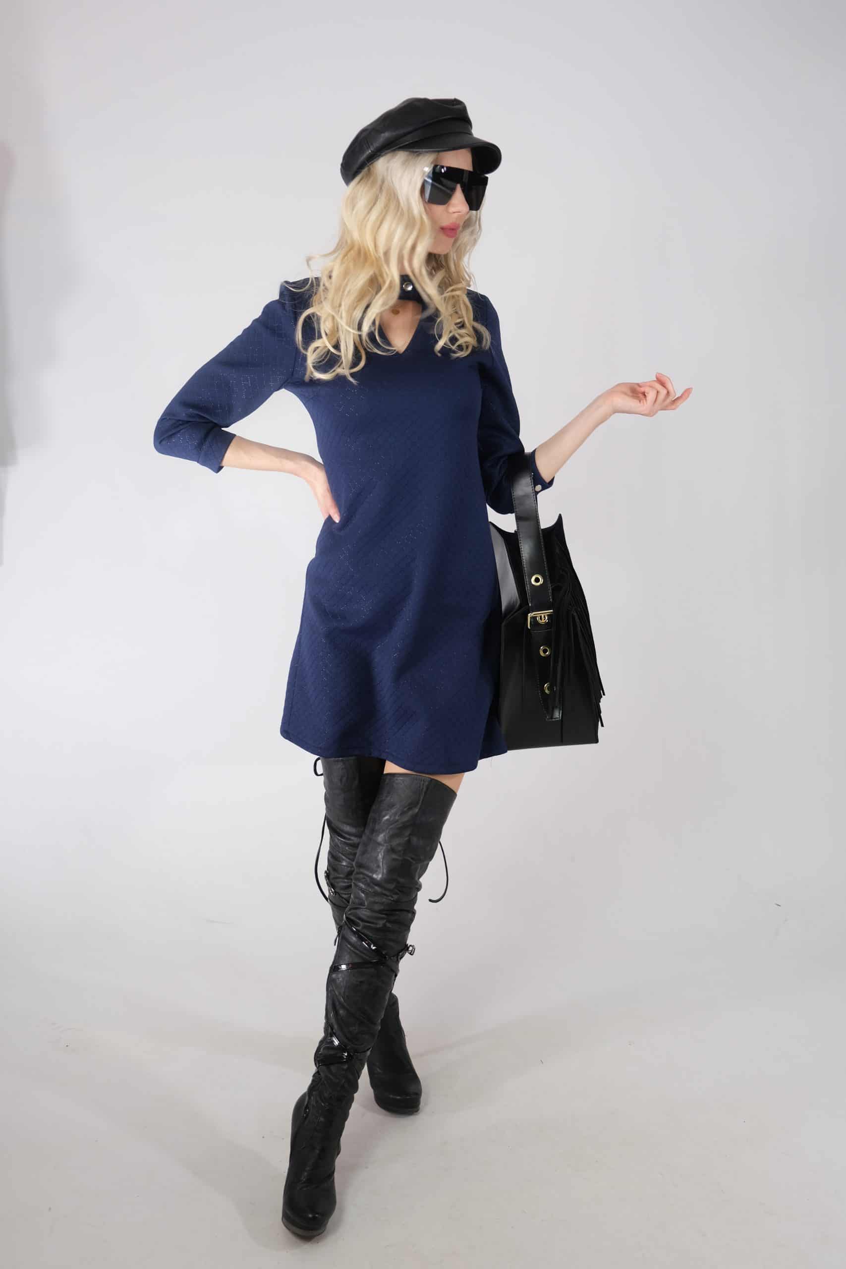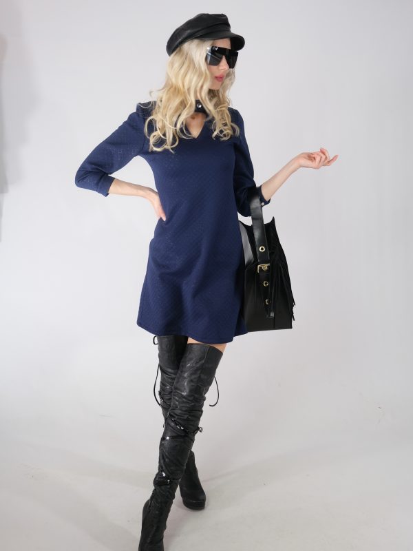 Šaty ušité v pohodlnom áčkovom strihu , ktorý výborne sadne na každú postavu. Šaty sú navrhnuté vo farbe nočnej oblohy a miesto jagavých hviezd sú použité ozdobné zlaté gombíky. Šaty sú vyrobené z prispôsobivého hrubšieho úpletu, ktorý Vás zohreje počas chladnejších dní. Zaujímavým detailom je riešenie výstrihu cvokmi. Šaty ideálne na celodenné nosenie.