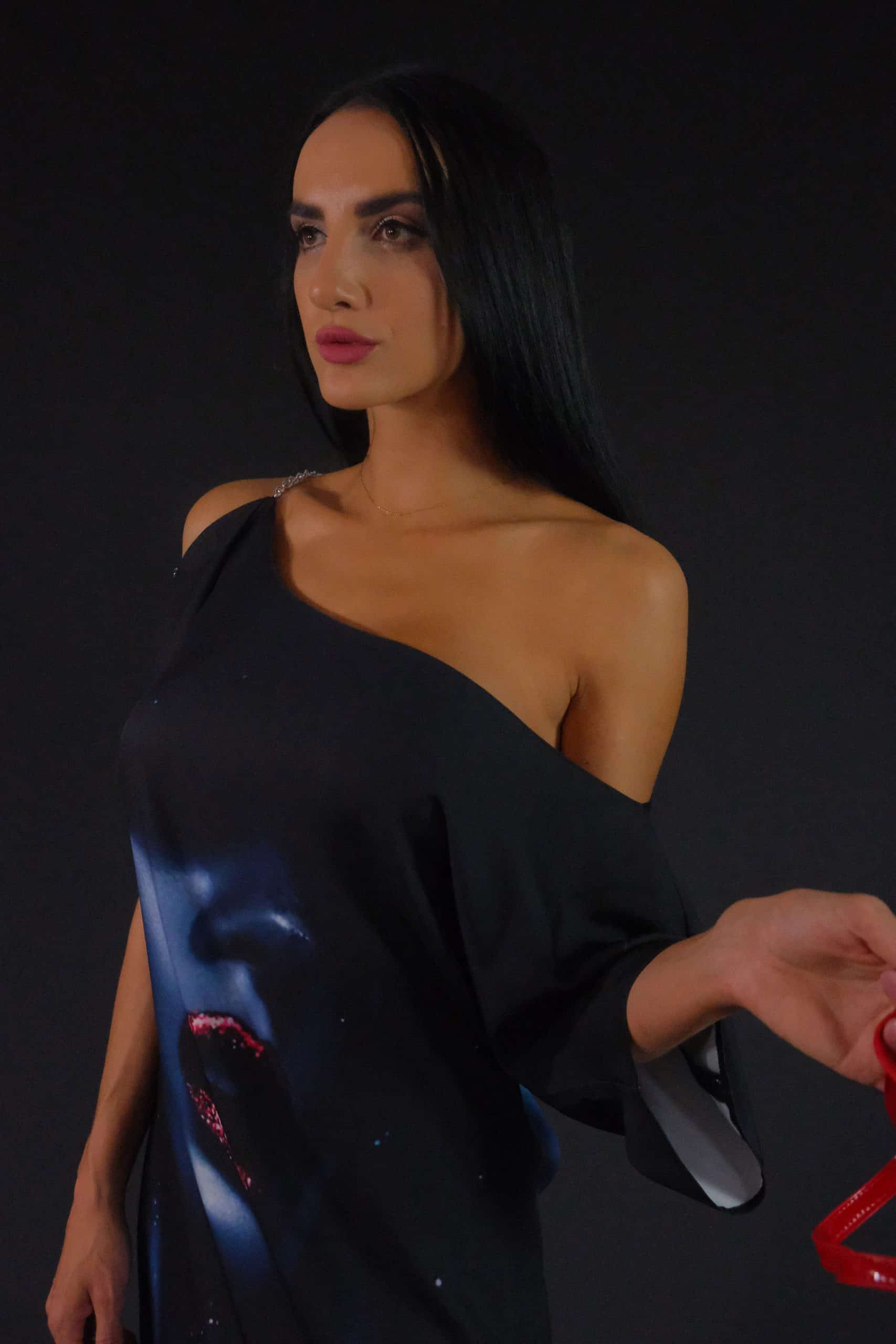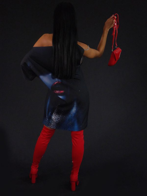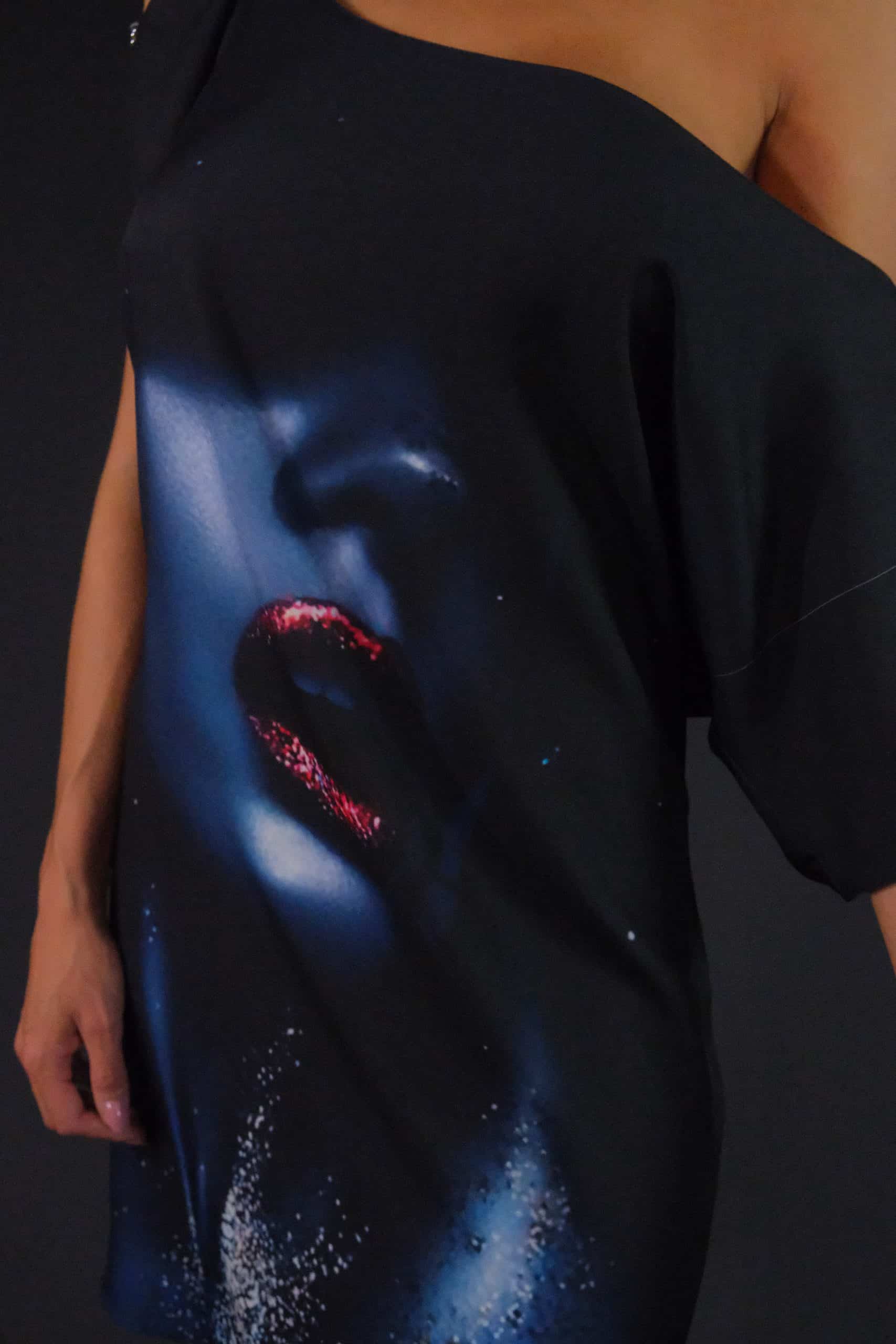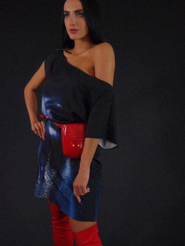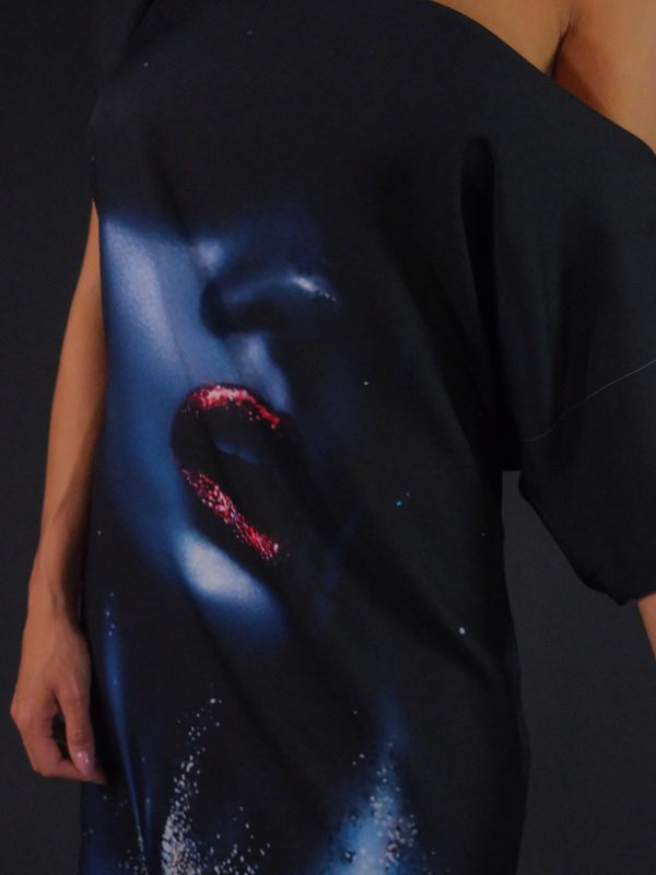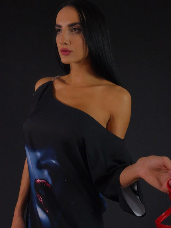 Jednoduché asymetrické šaty ušité vo výraznou vzore, ktorému dominujú tmavé farebné odtiene. Šaty majú výraznú grafickú potlač a preto bol zvolený jednoduchý strih, ktorý dá vzoru naplno vyniknúť. Zaujímavým detailom je ramienko zo striebristej retiazky, ktorá šatám dodáva šmrnc. Šaty sú ušité z ľahkého materiálu, v ktorom sa budete cítiť pohodlne po celý deň .