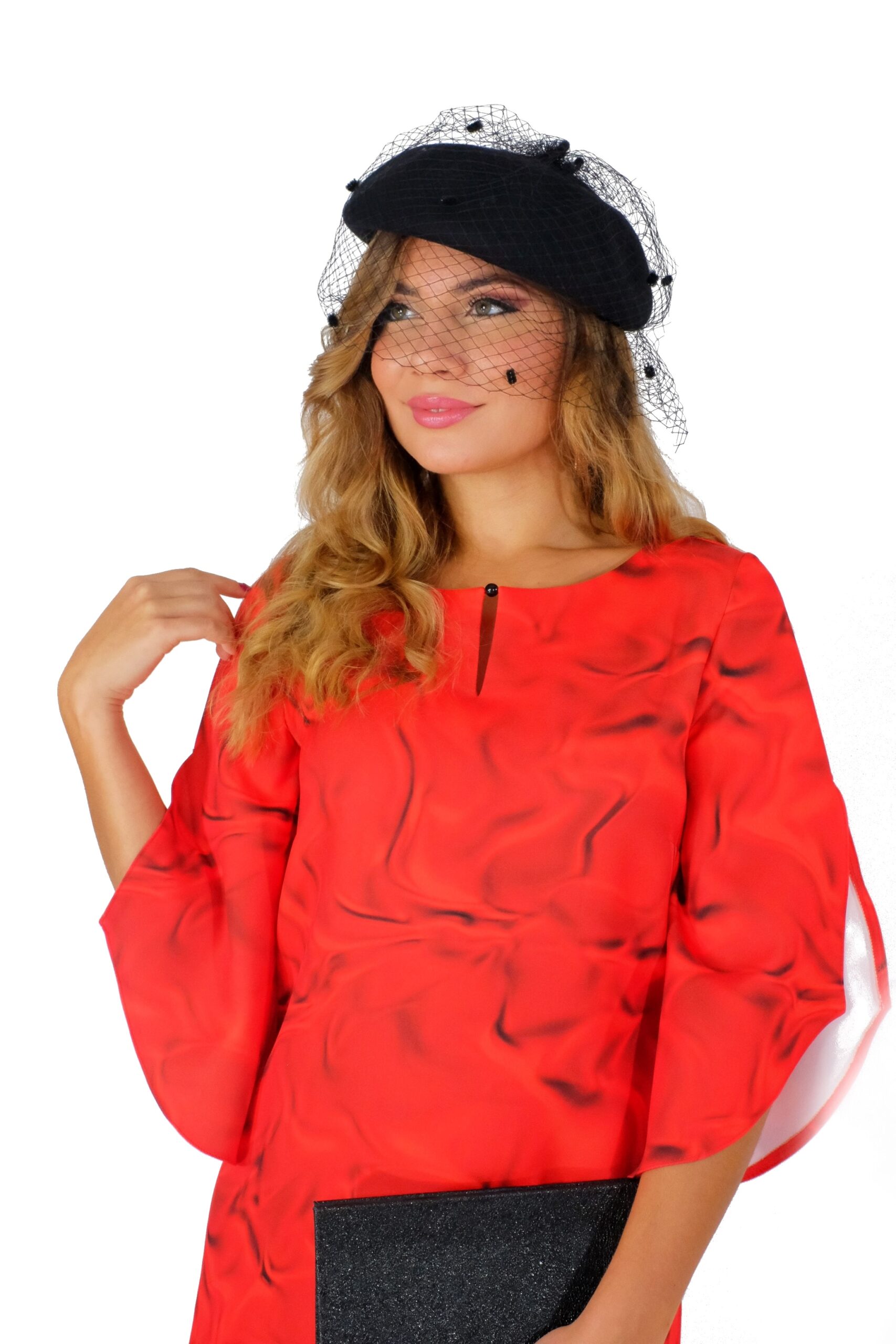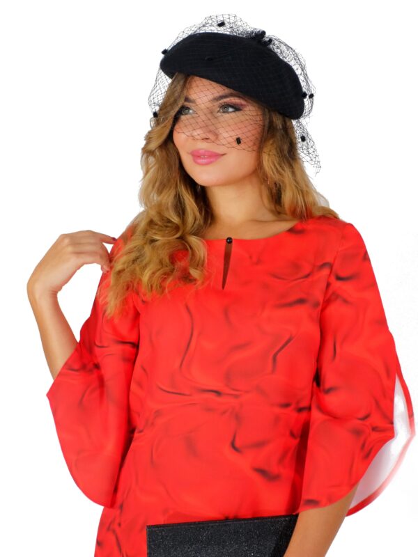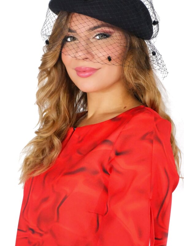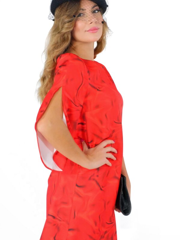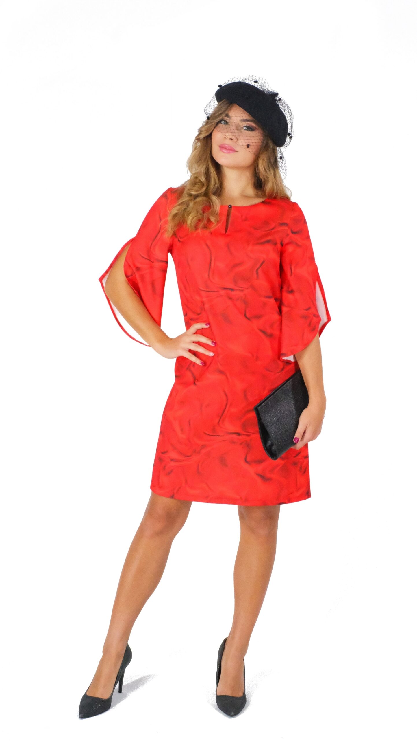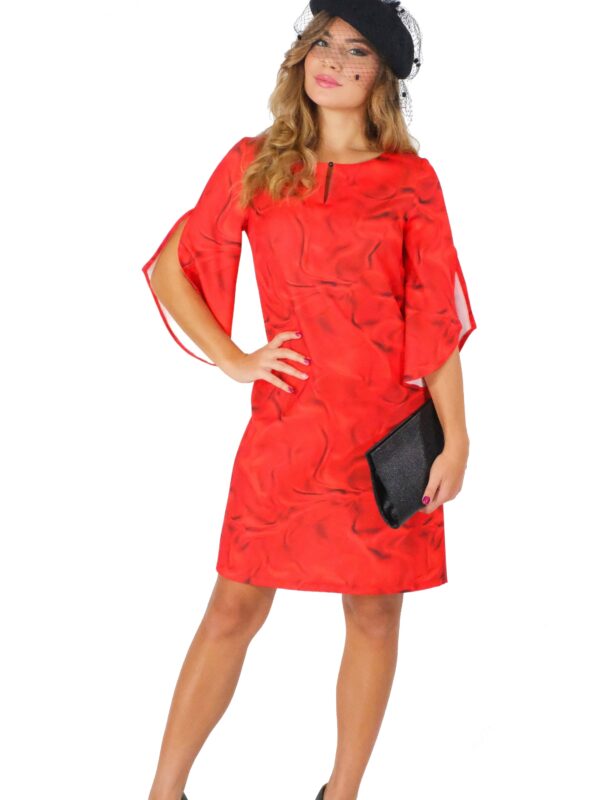 Šaty sú ušité v jednoduchom áčkovom strihu , ktorý skvele sadne na každý typ postavy. Zaujímavým detailom na šatách sú voľné bohémske rukávy, ktoré sú prestrihnuté, čo im dodáva na vzdušnosti. Šaty majú výstrih ozdobený čiernou perličkou. Šaty sú ušité v zaujímavom abstraktom vzore v krásnej červenej farbe s čiernymi intarziami. Skombinujte s čiernymi doplnkami pre dramatický efekt.
