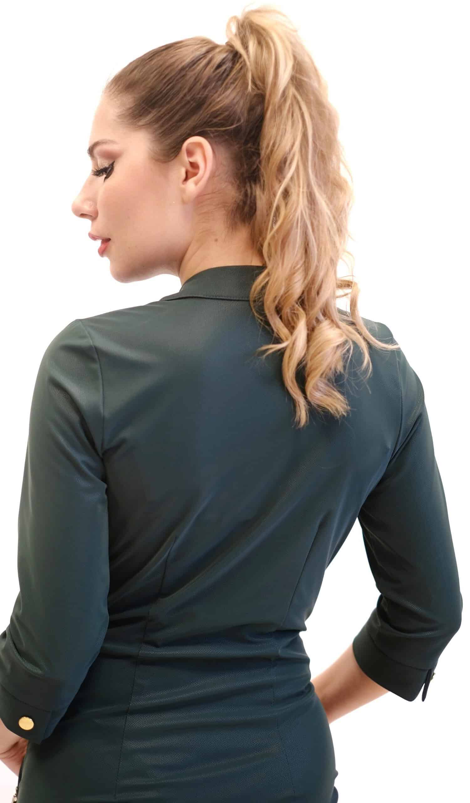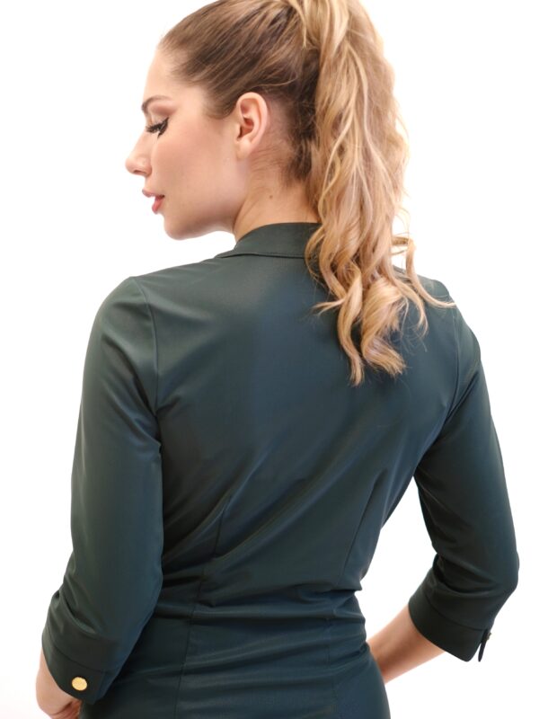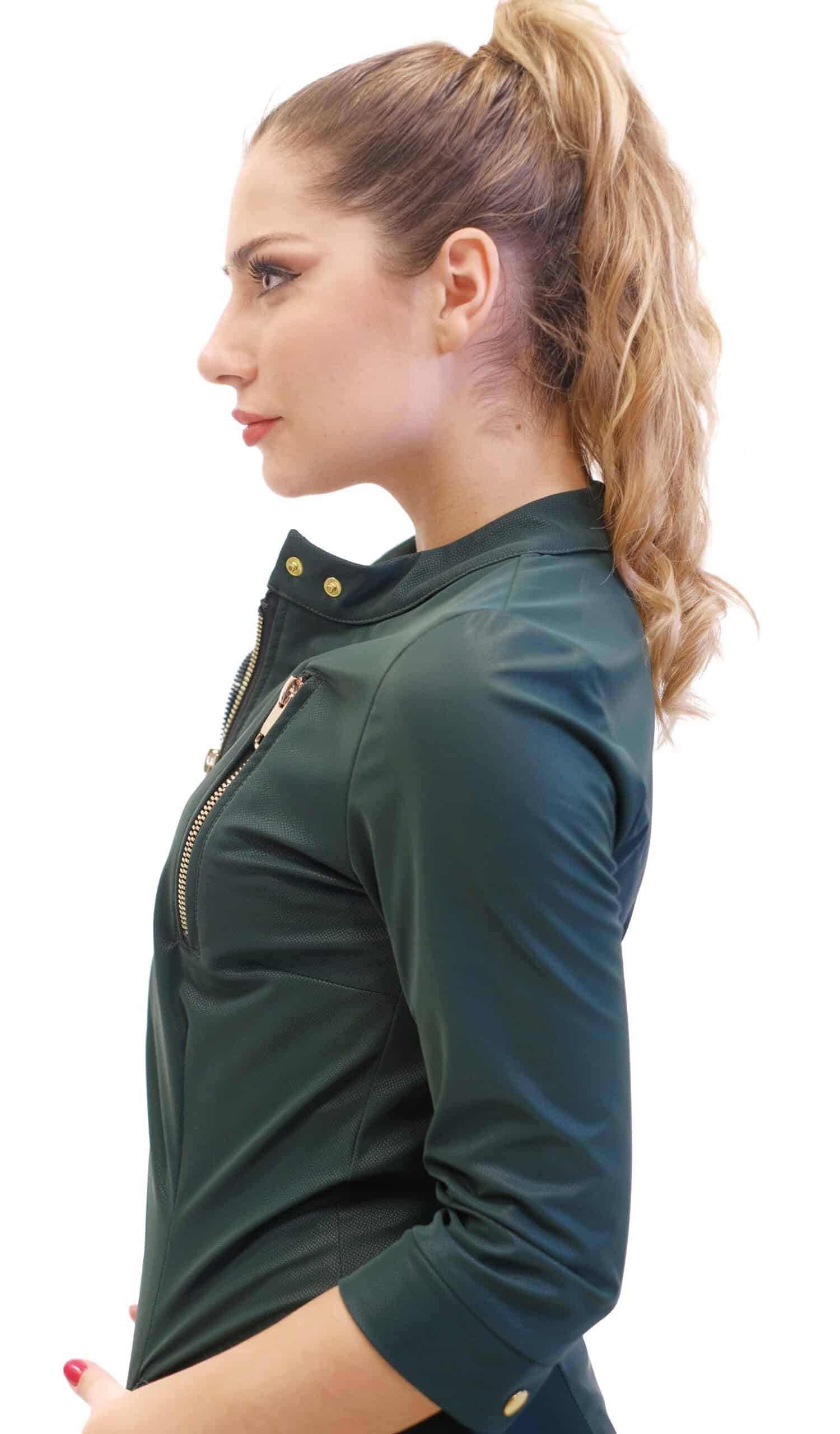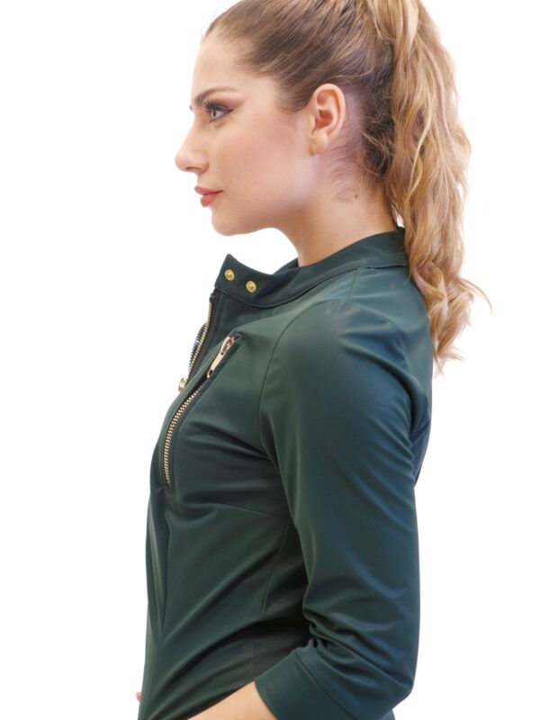 Šaty sú navrhnuté v obľúbenom zipsovom strihu z vysoko elastického materiálu, ktorý sa Vám prispôsobí ako druhá koža. Šaty sú ušité v prepracovanom strihu, na ktorom vyniknú nádherné zipsy. Zipsy dodávajú šatám na ležérnosti a šaty tak ľahko vynosíte s opätkami ako aj pohodlne s teniskami. Odporúčame kombináciu tenisiek a čiernej koženej bundy a máte outfit, ako stvorený do mesta, práce alebo rockový koncert. Šaty majú funkčné vrecká a golier na zapínanie. Šaty sú navrhnuté v tlmenej olivovo-zelenej farbe, ktorá nechá vyniknúť strihu a rafinovanému materiálu.