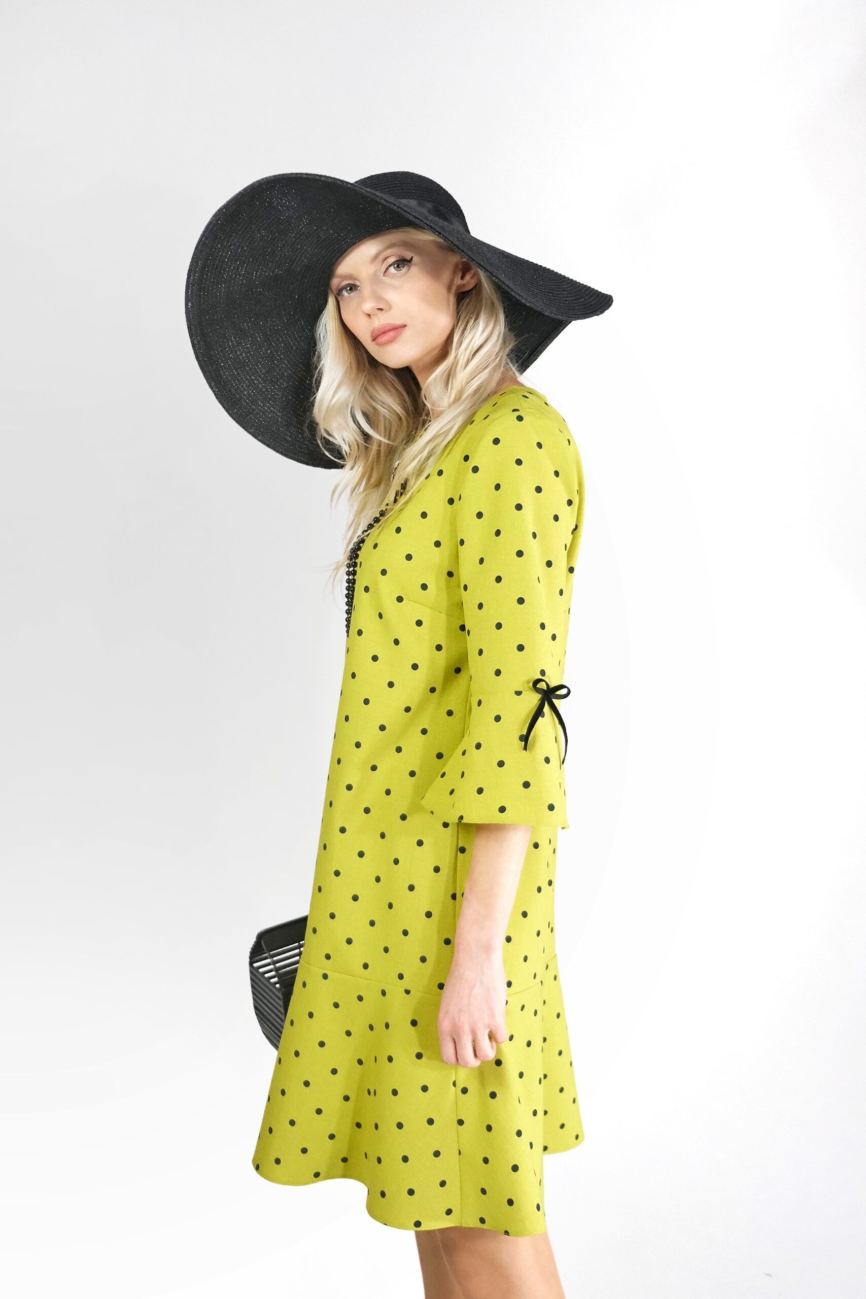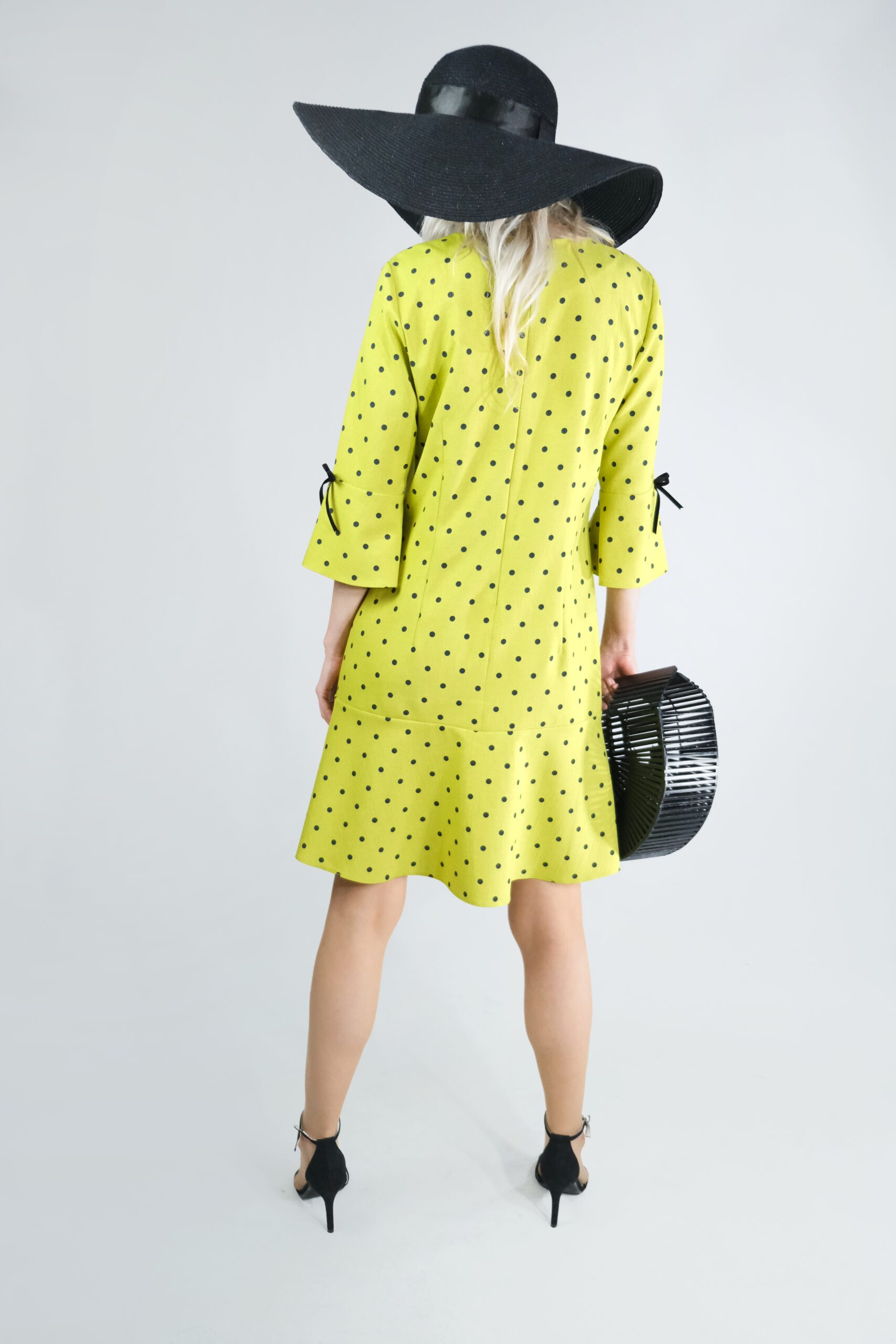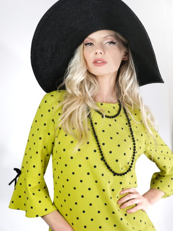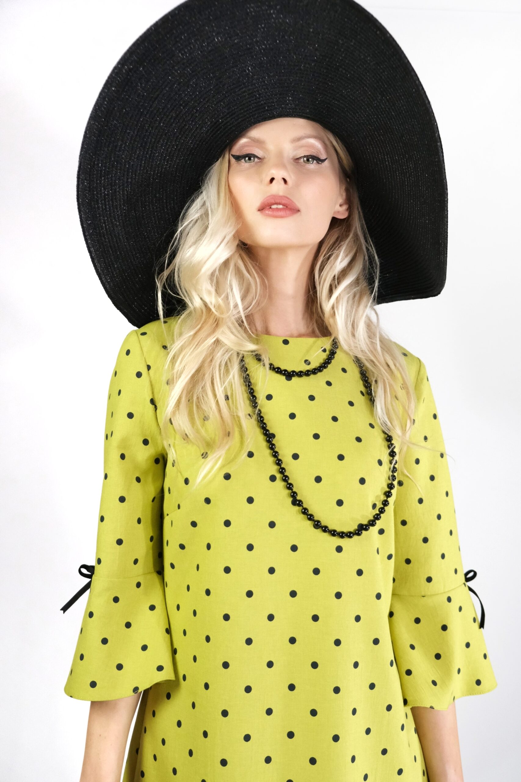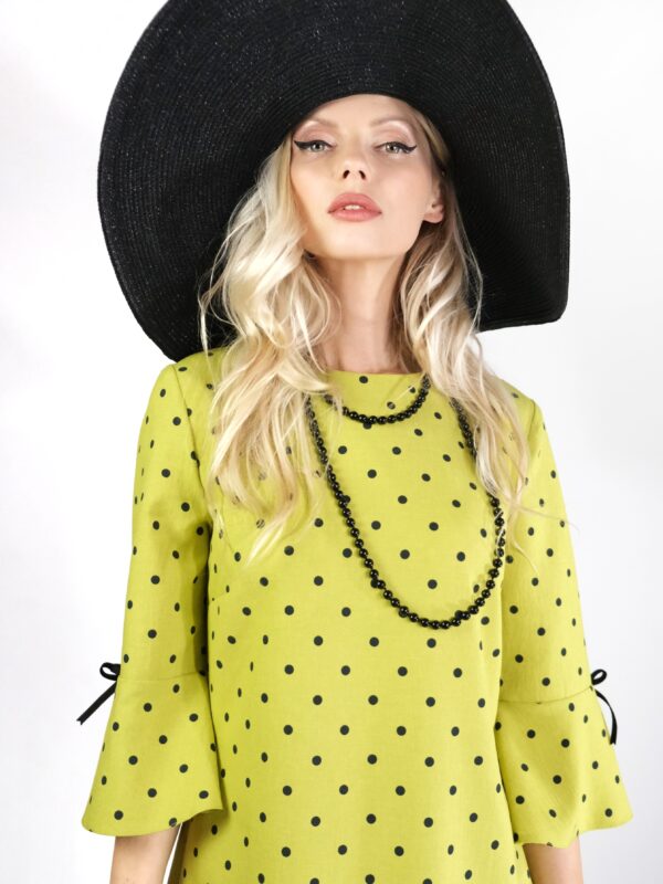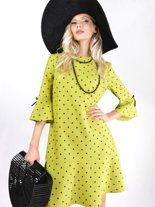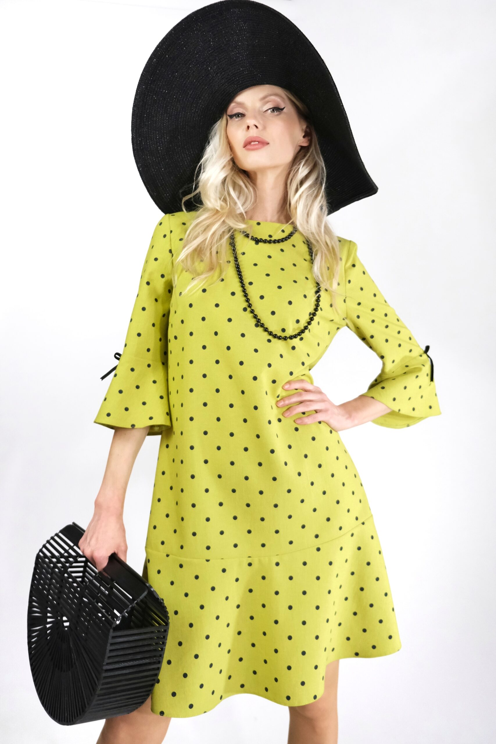 Šaty sú navrhnuté v jednoduchom áčkovom strihu, ktorý skvele sadne na každú postavu. Šaty majú volánové rukávy. Ako počas každého letného obdobia aj teraz sa vracajú bodky, ktoré sa v móde objavujú nepretržite už dlhé roky. Tentokrát ich nájdete skombinované so sviežou zelenou. Šaty vo svojej jednoduchosti nechávajú vyniknúť vzor a výborný materiál, ktorý padne vhod počas nadchádzajúcich letných dní.