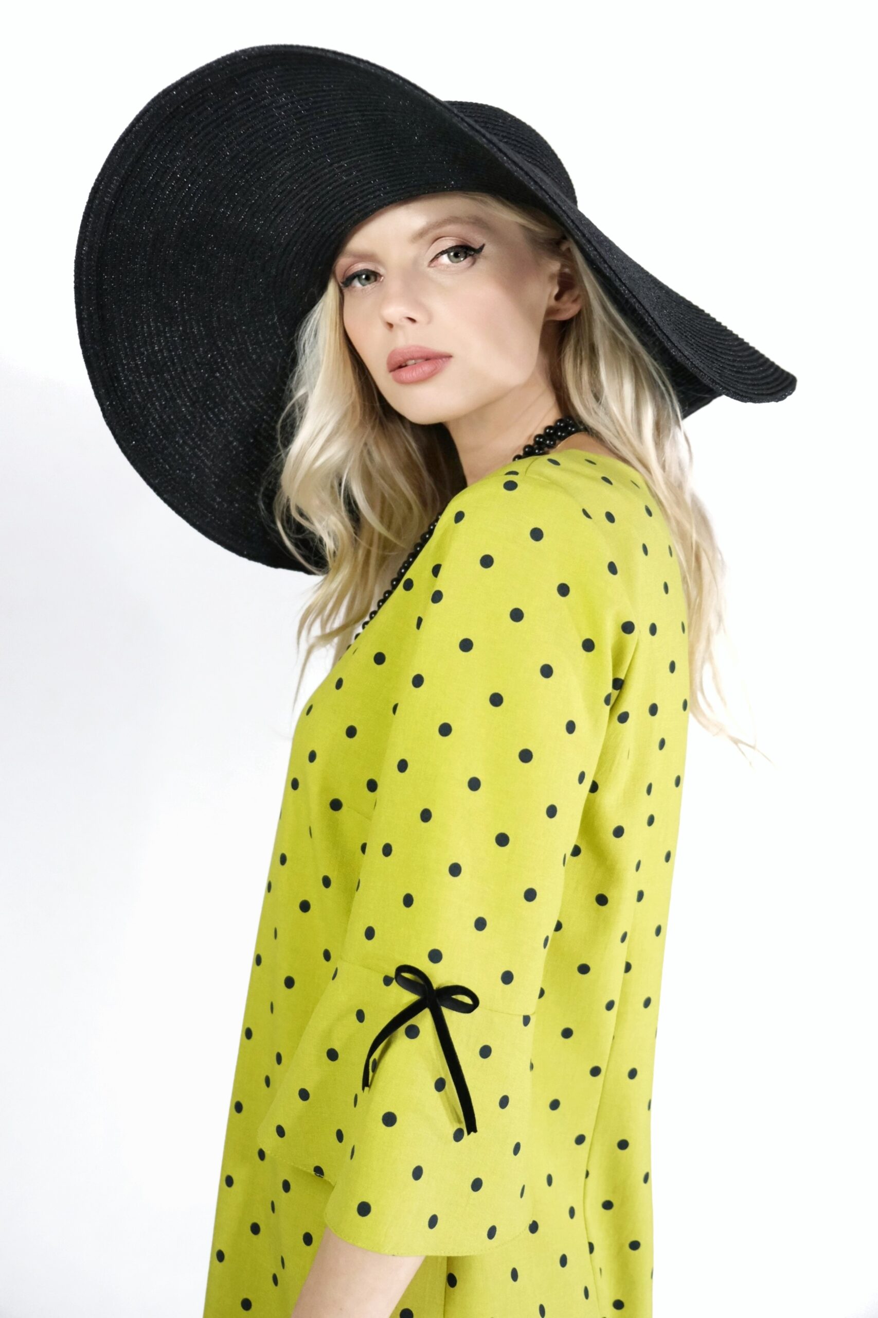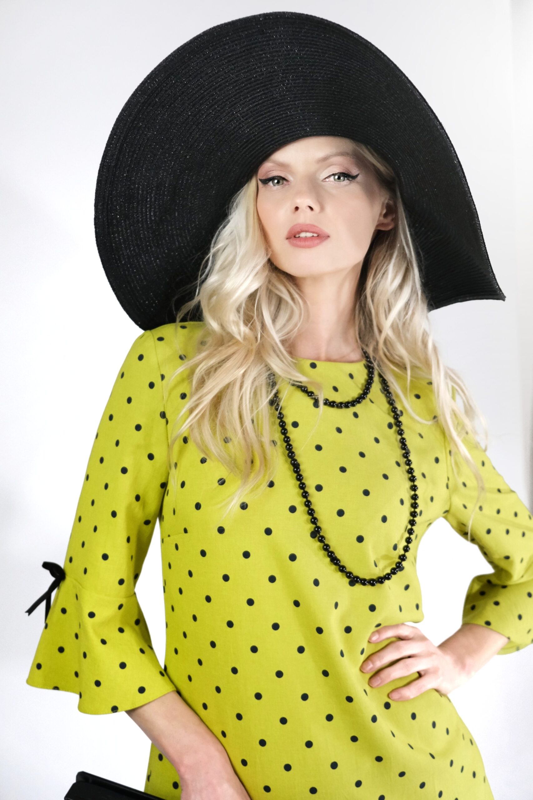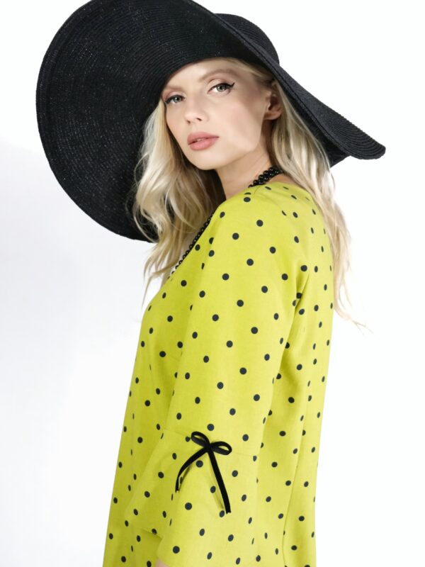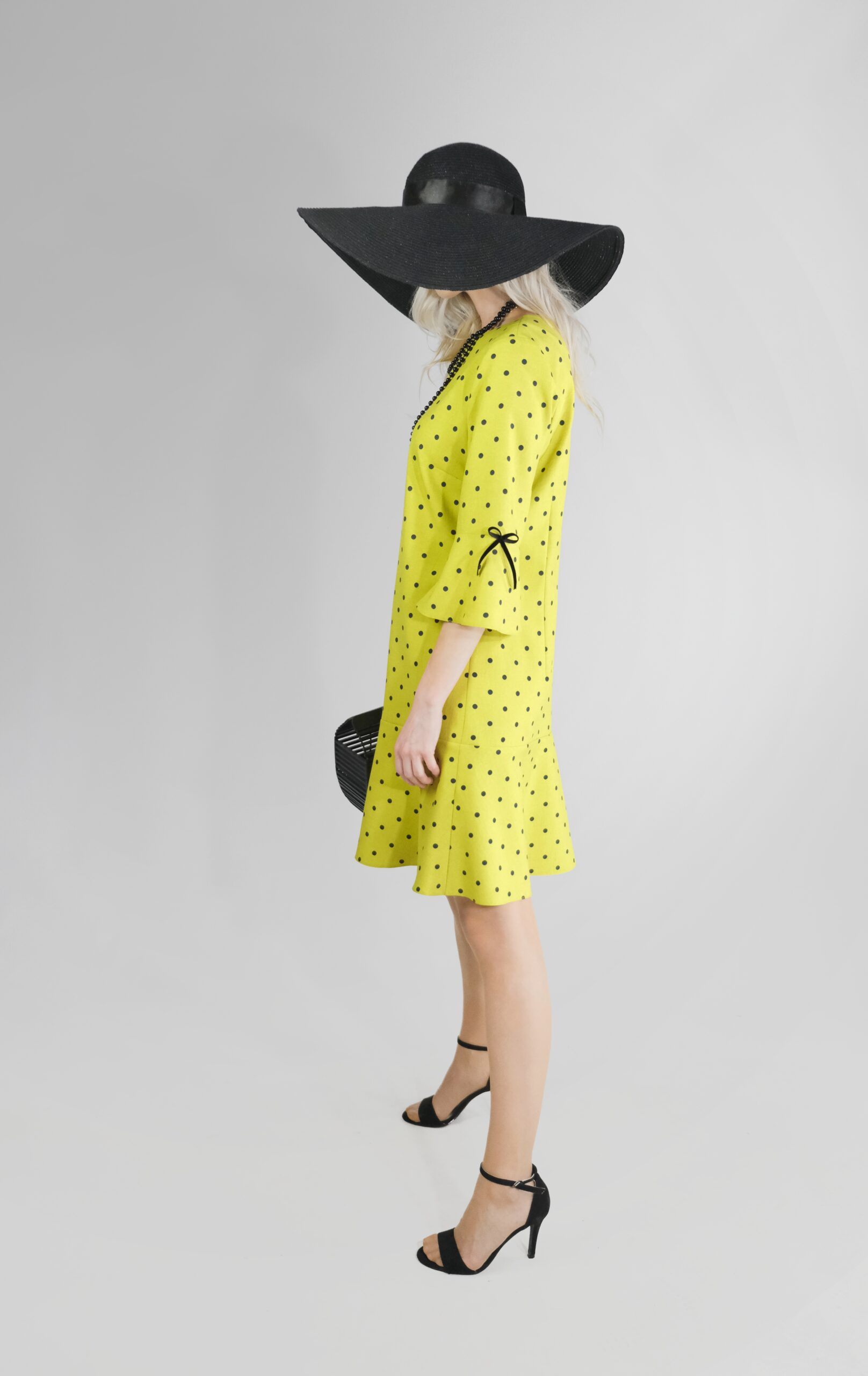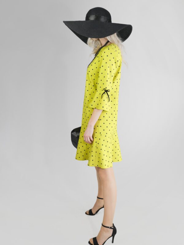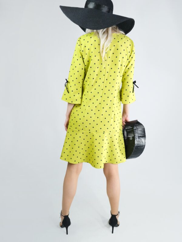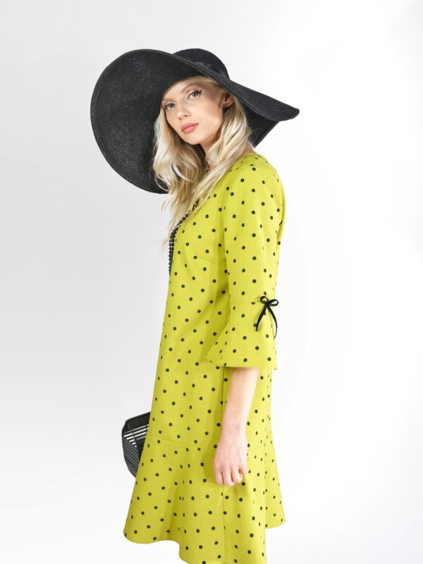 Šaty sú navrhnuté v jednoduchom áčkovom strihu, ktorý skvele sadne na každú postavu. Šaty majú volánové rukávy. Ako počas každého letného obdobia aj teraz sa vracajú bodky, ktoré sa v móde objavujú nepretržite už dlhé roky. Tentokrát ich nájdete skombinované so sviežou zelenou. Šaty vo svojej jednoduchosti nechávajú vyniknúť vzor a výborný materiál, ktorý padne vhod počas nadchádzajúcich letných dní.