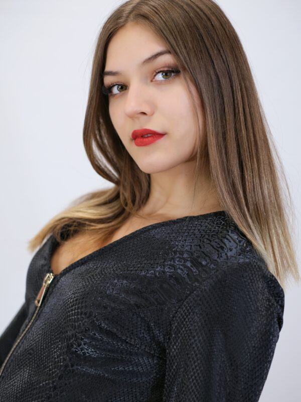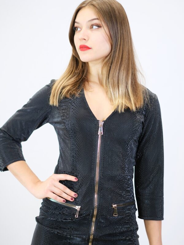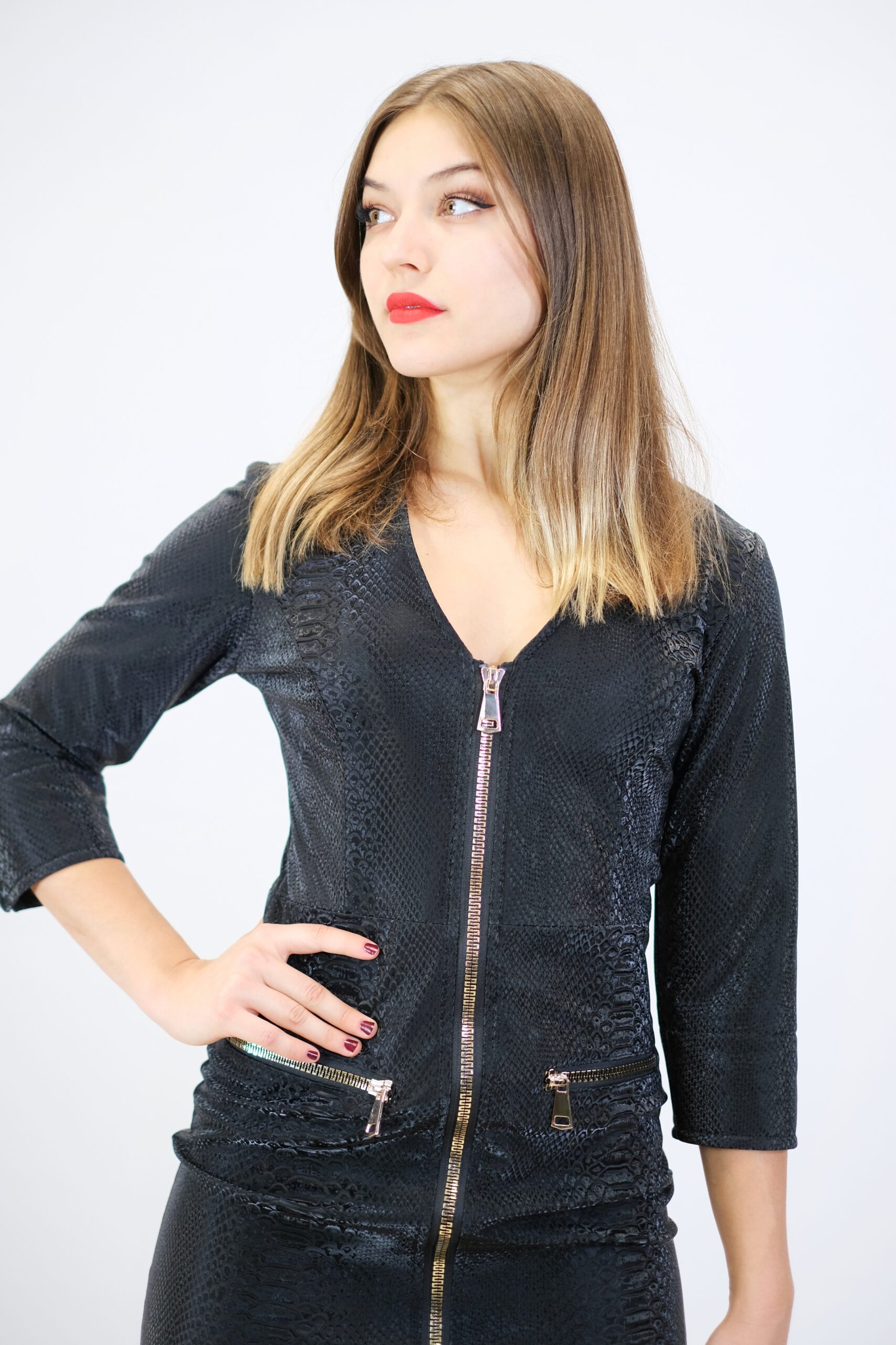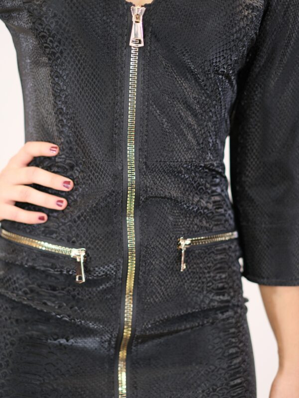 Šaty sú ušité v úzkom strihu, s prispôsobivého lesklého materiálu, ktorý vám sadne ako druhá koža. Šaty sú navrhnuté s ozdobnými zipsami, ktoré šatám dodávajú punč výnimočnosti. Šaty sú ušité z materiálu, ktorý pripomína kožu. Šaty môžete kombinovať so zlatými doplnkami ako naša aranžérka a využiť ich aj na spoločenské príležitosti.