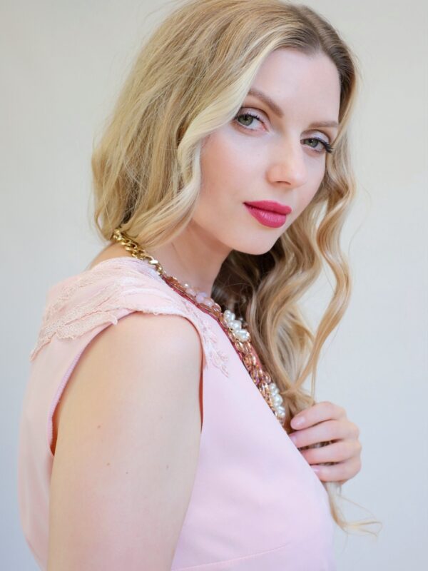 Šaty sú navrhnuté v jednoduchom úzkom strihu, ktorý sa prispôsobí vašej postave. Šaty sú ušité v nádhernej pastelovo ružovej farbe ktorá sa výborne hodí na spoločenské udalosti, najmä v letnom období. Šaty majú krátke rukávy, ktoré vám dodajú komfort aj počas horúcich letných dní. Zaujímavým detailom na šatách je krajková aplikácia na jednom ramene. Šaty sa skvele hodia na spoločenské príležitosti, ako aj na bežný deň do práce.