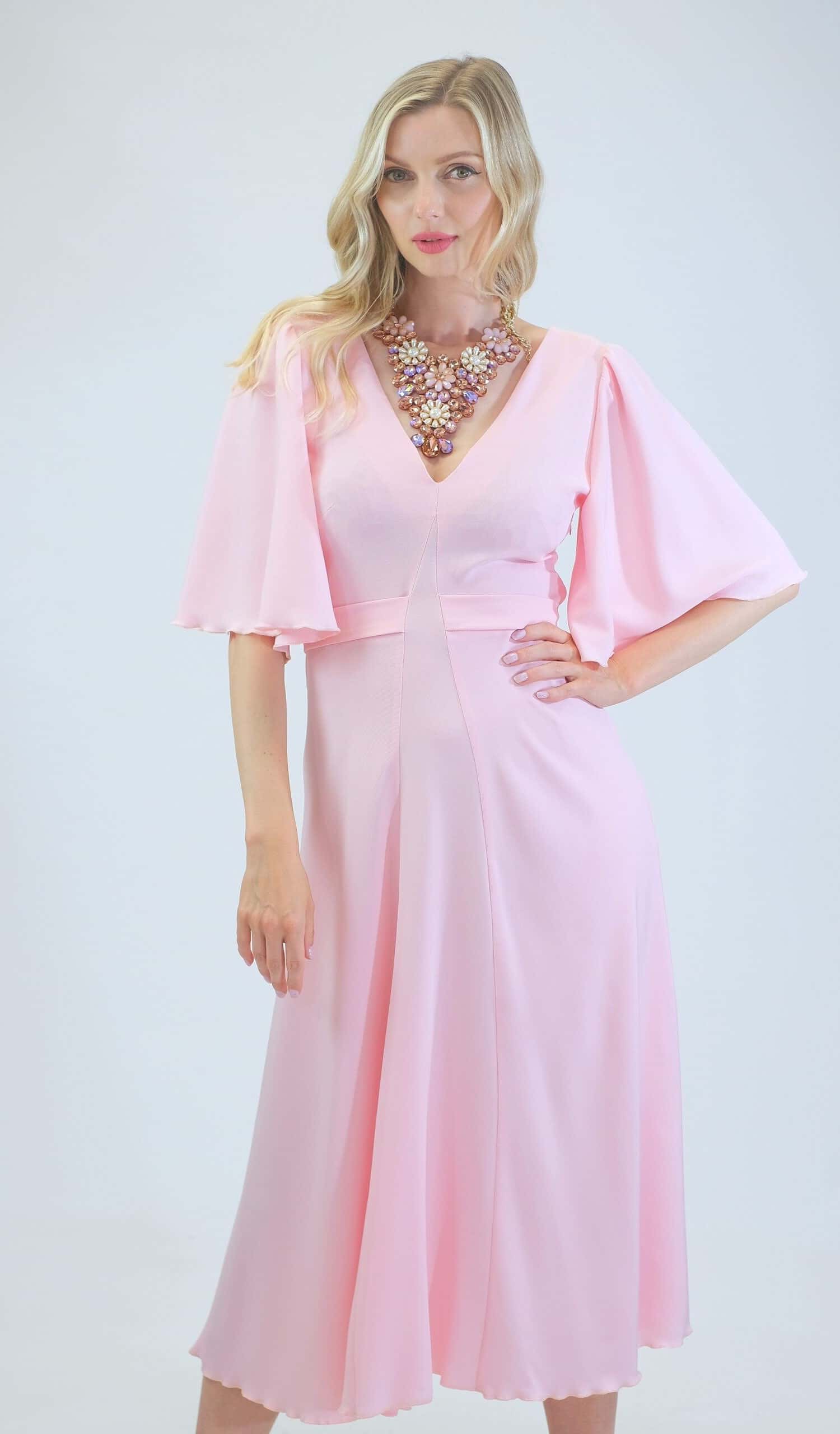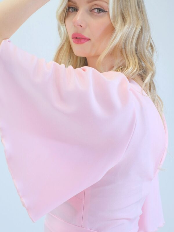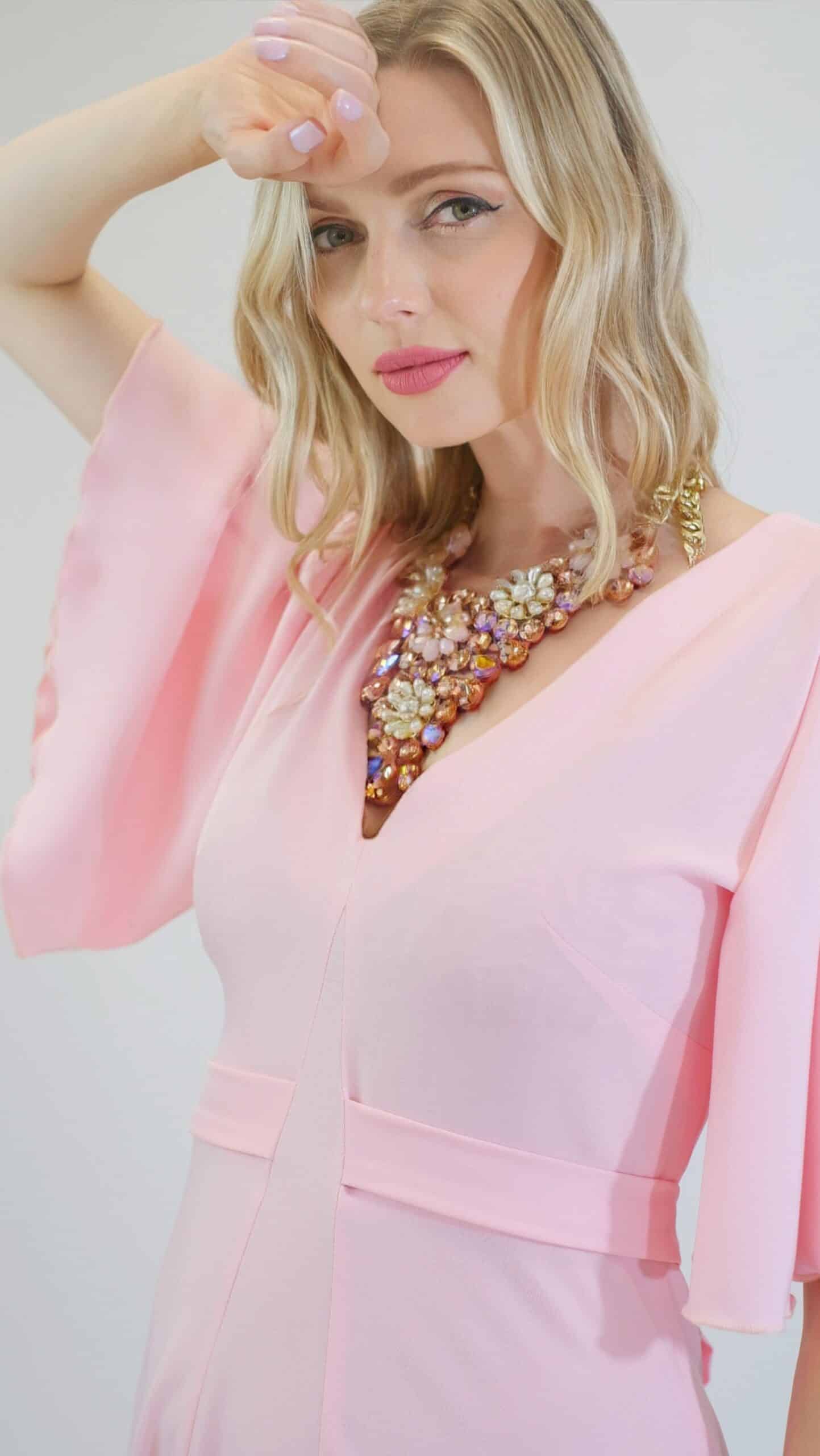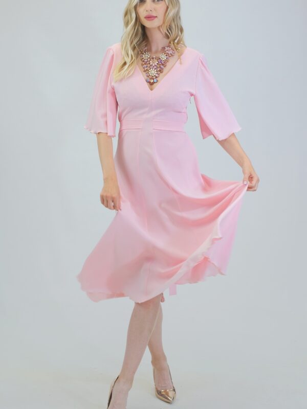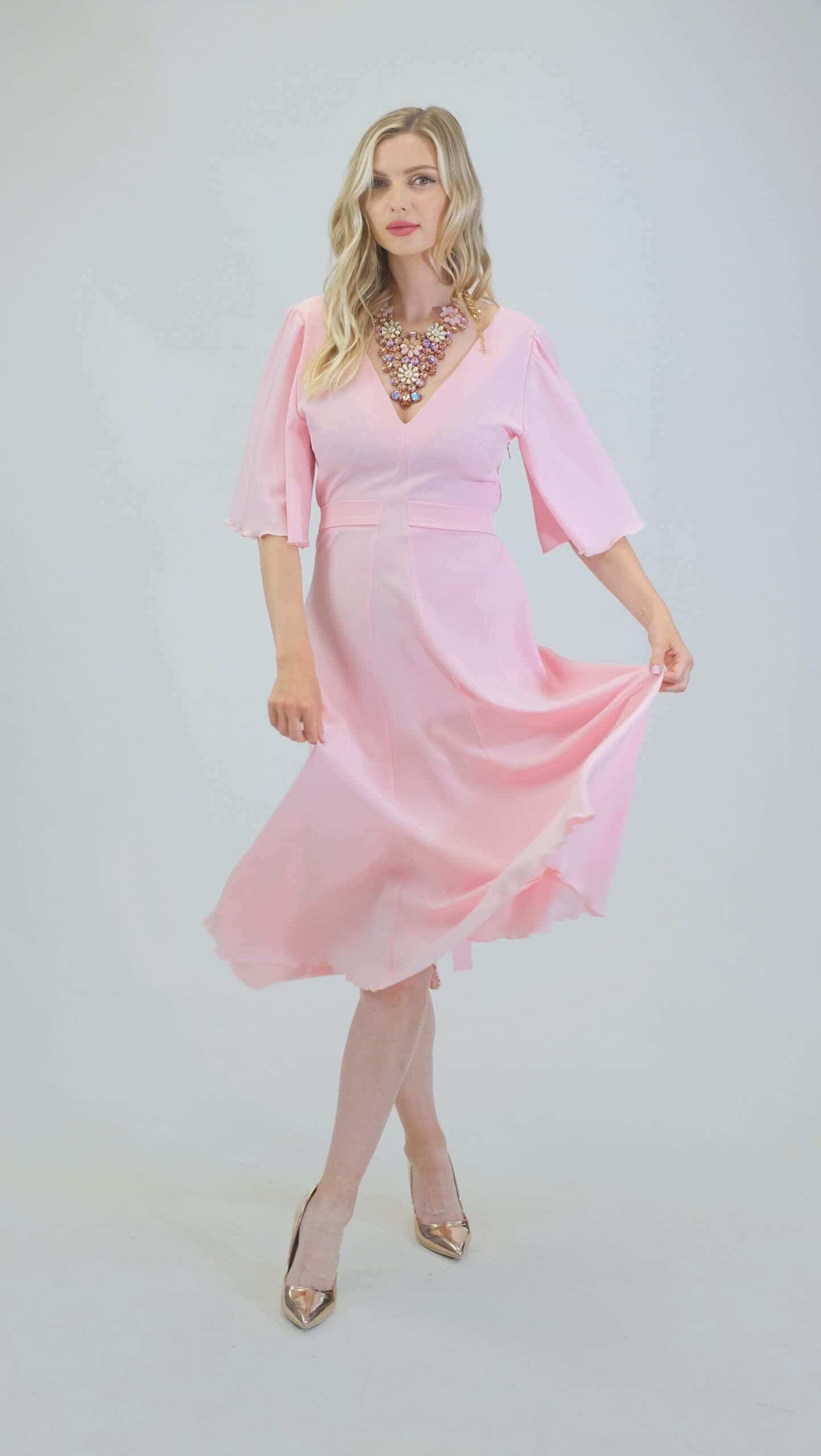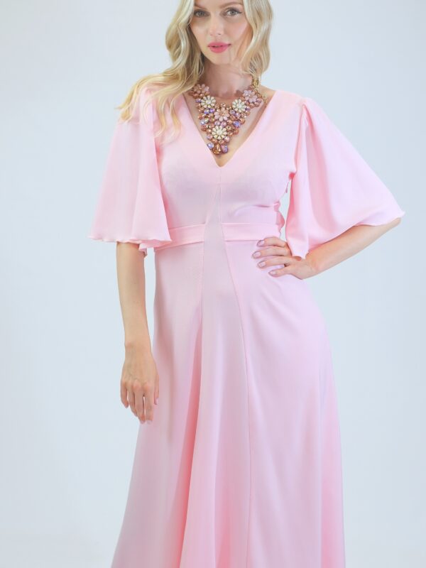 Šaty sú ušité v pohodlnom zavinovaciom strihu so zdôrazneným pásom. Šaty majú voľné bohémske rukávy, v ktorých sa budete cítiť pohodlne počas celého dňa. Šaty sú navrhnuté v pastelovo ružovej farbe, ktorá sa dá poľahky s kombinovať s akýmkoľvek typom doplnkov. Šaty sa hodia na bežný deň, ako sa hodia aj na letné oslavy. Šaty sú pohodlné aj vďaka širokej suknici ,v ktorej sa budete môcť voľné pohybovať ako aj tancovať. Šaty kombinujte so zlatými alebo striebornými doplnkami ako naša aranžérka na výnimočné príležitosti.