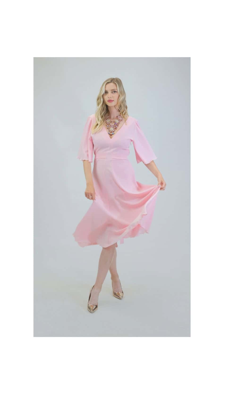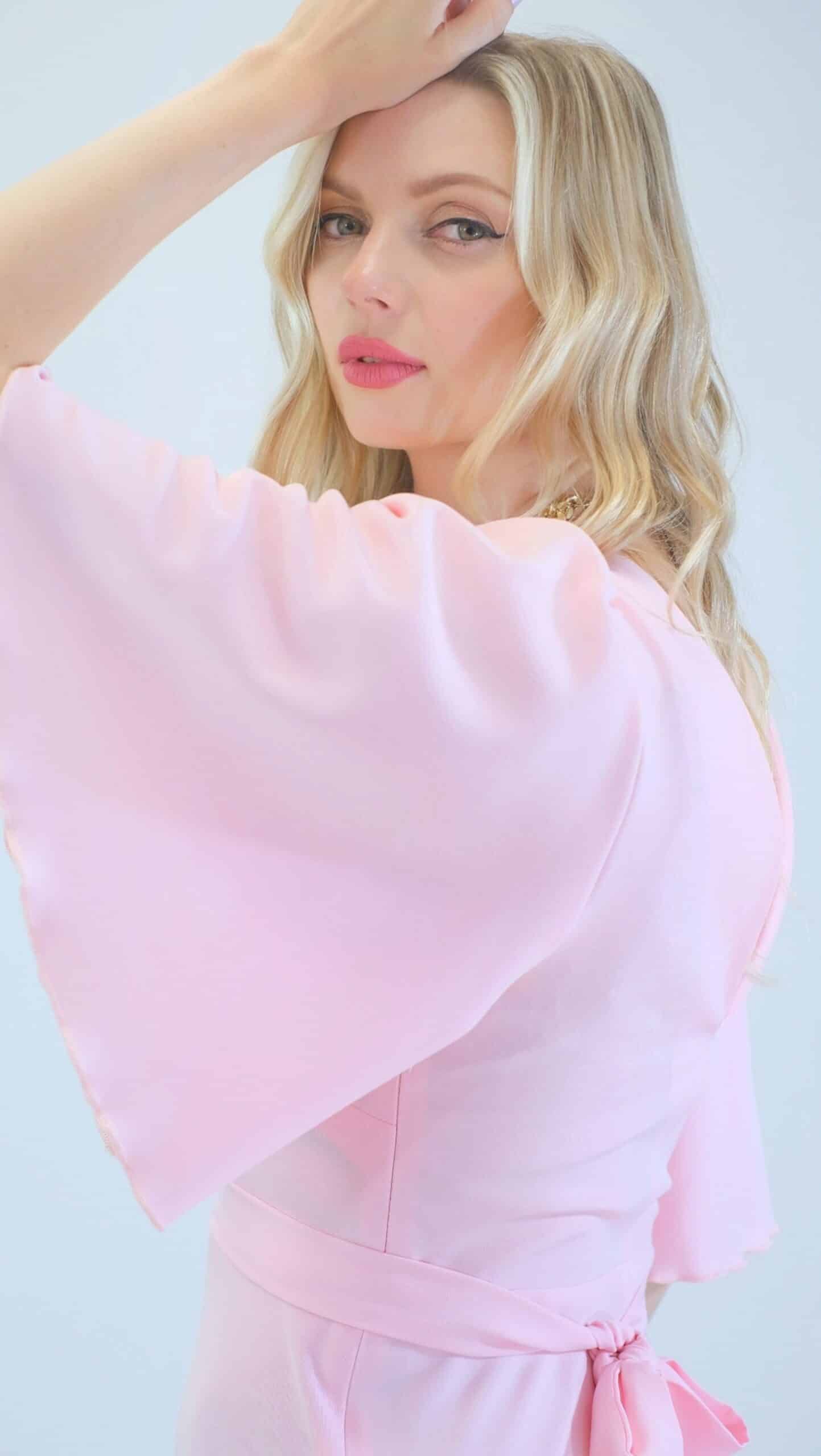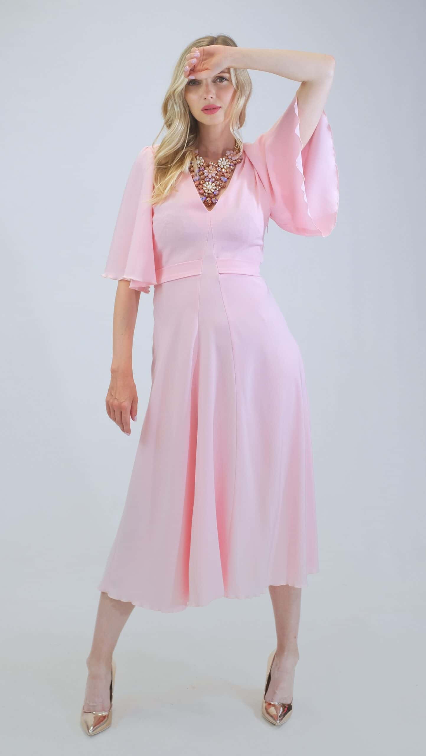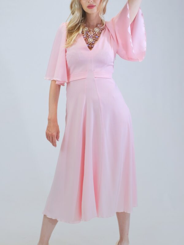 Šaty sú ušité v pohodlnom zavinovaciom strihu so zdôrazneným pásom. Šaty majú voľné bohémske rukávy, v ktorých sa budete cítiť pohodlne počas celého dňa. Šaty sú navrhnuté v pastelovo ružovej farbe, ktorá sa dá poľahky s kombinovať s akýmkoľvek typom doplnkov. Šaty sa hodia na bežný deň, ako sa hodia aj na letné oslavy. Šaty sú pohodlné aj vďaka širokej suknici ,v ktorej sa budete môcť voľné pohybovať ako aj tancovať. Šaty kombinujte so zlatými alebo striebornými doplnkami ako naša aranžérka na výnimočné príležitosti.