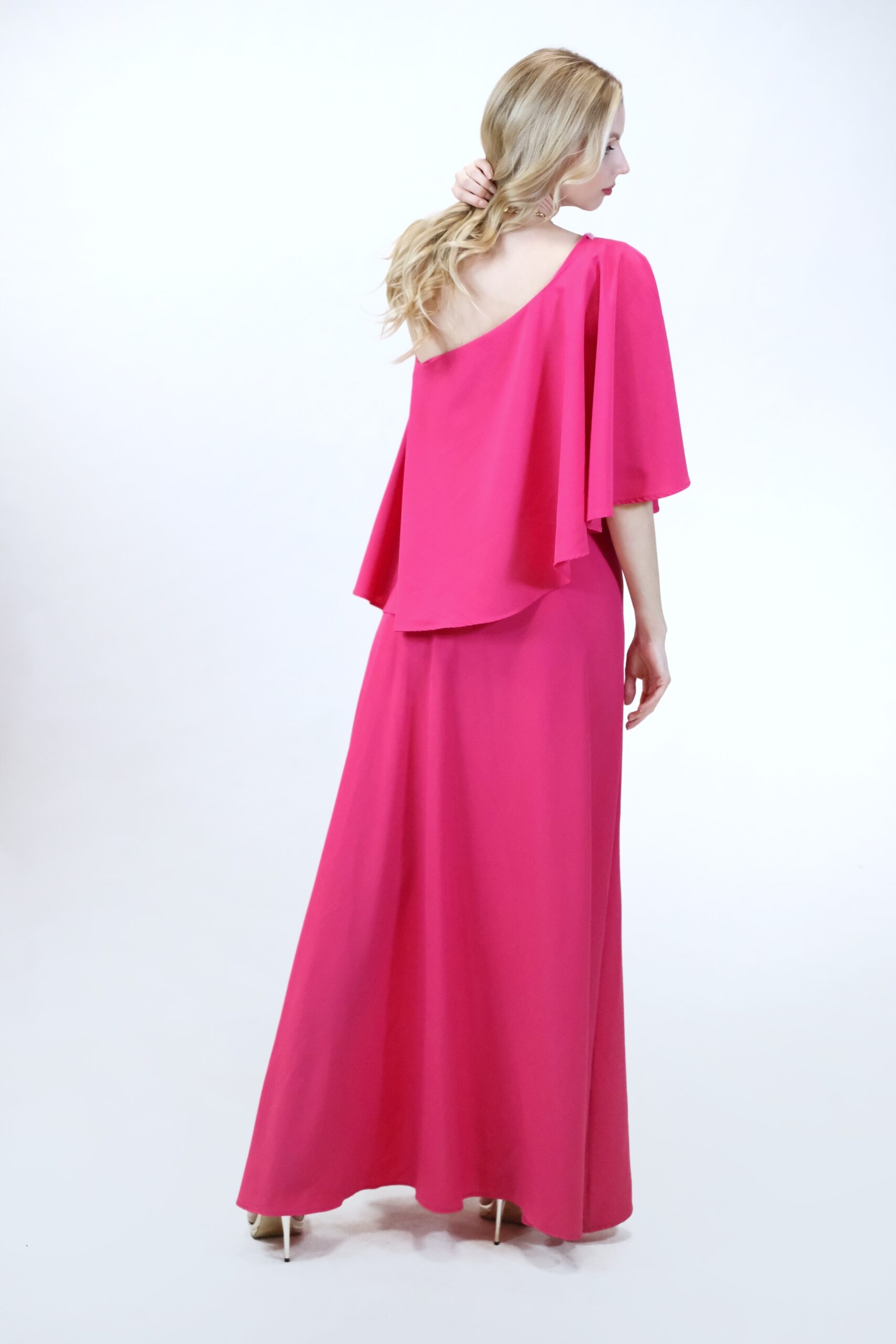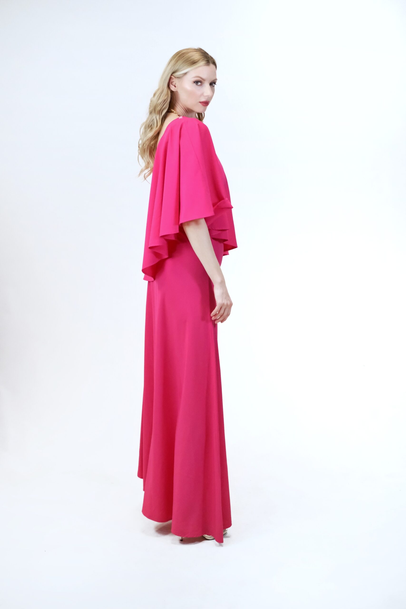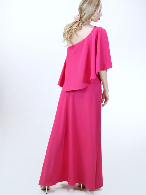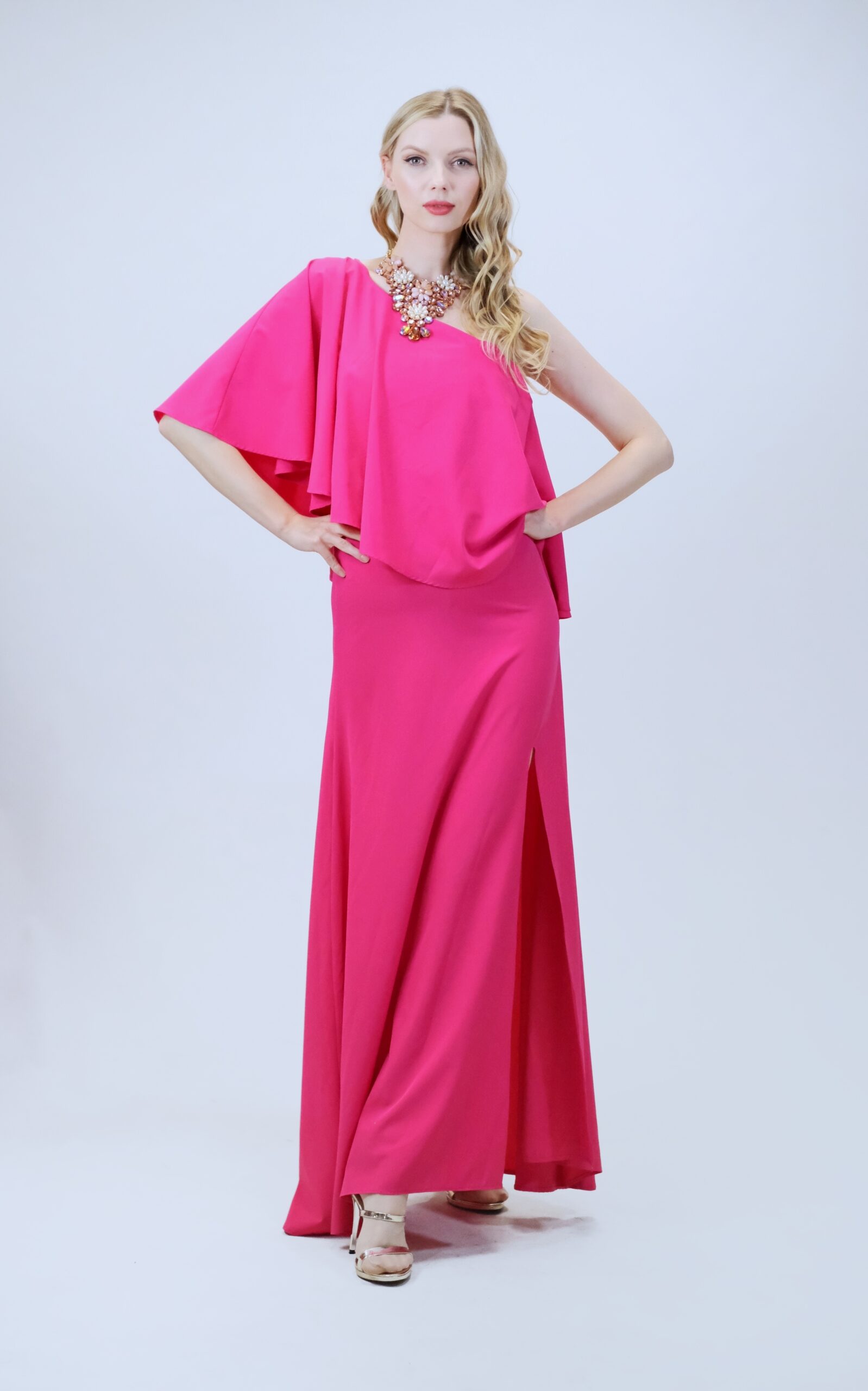 Šaty sú navrhnuté z padávého cyklaménového úpletu, ktorý obteká Vašu postavu ako voda. Šaty majú padávý, voľný strih, čo im dodáva na grácii. Zaujímavým prvkom na šatách je volán v hornej polovici, ktorý plynule prechádza do bohémskeho rukávu na jednom ramene. Výrazná cyklménová sa výborne sa skvele kombinuje so zlatými doplnkami. Šaty sú dlhé až po zem.
