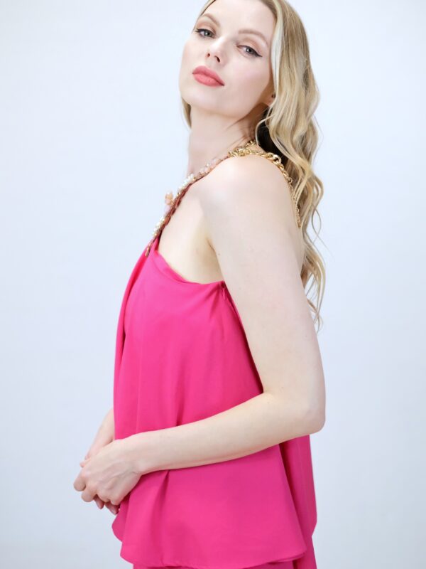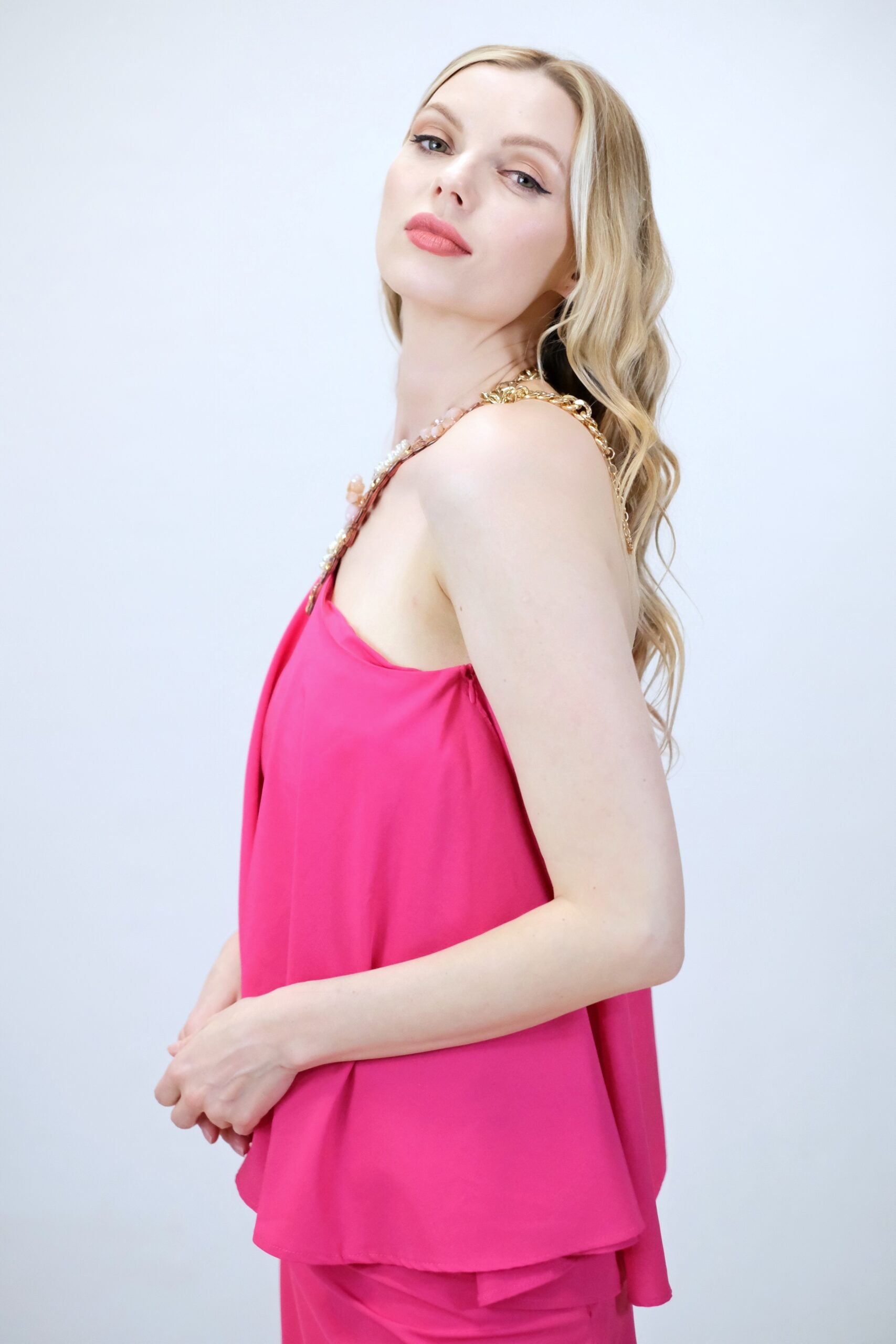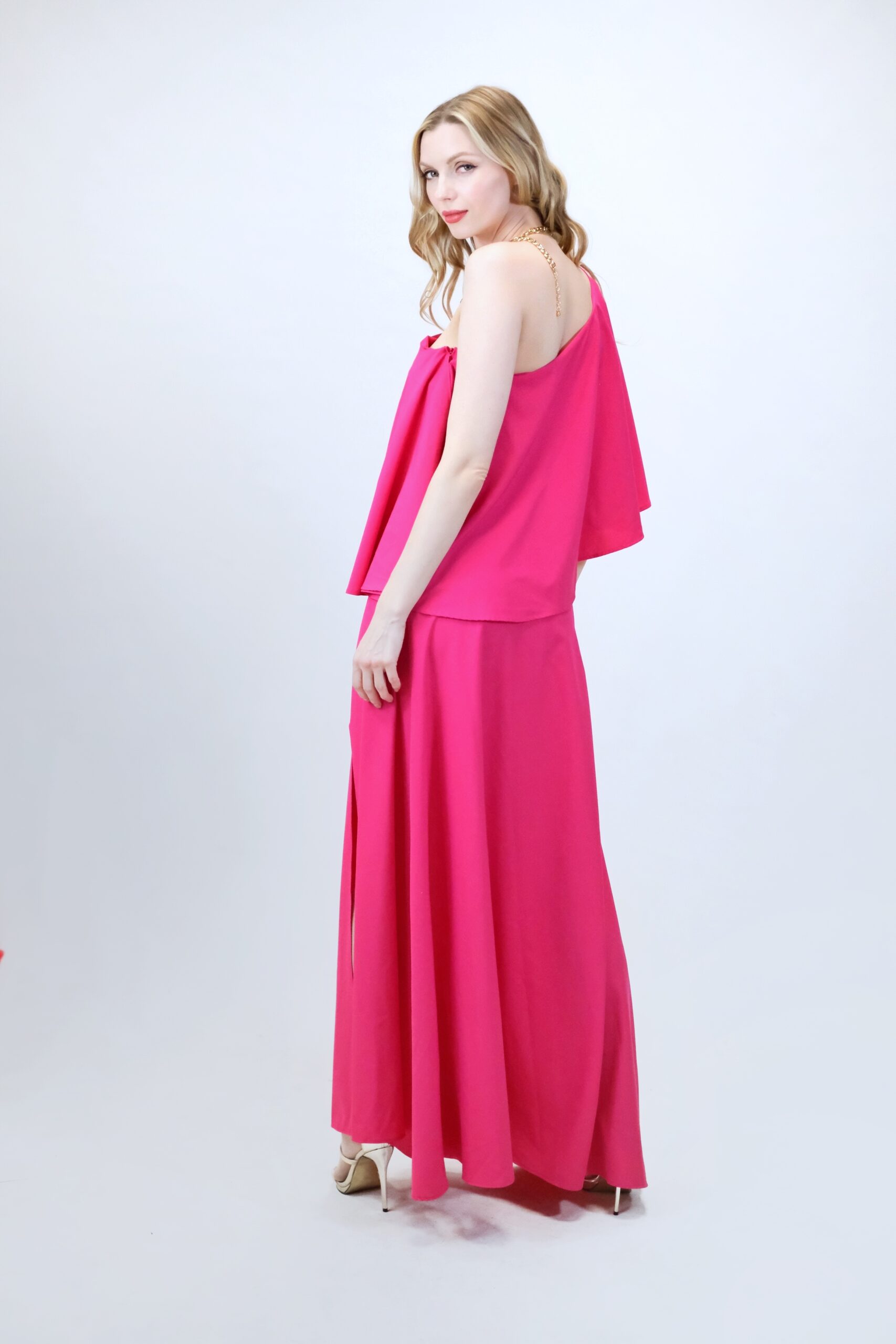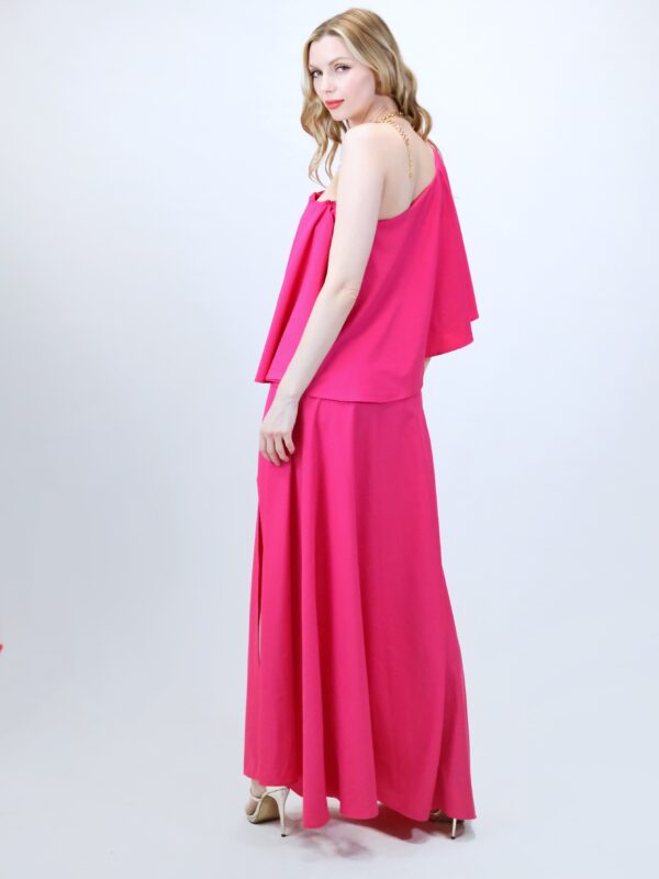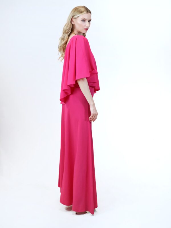 Šaty sú navrhnuté z padávého cyklaménového úpletu, ktorý obteká Vašu postavu ako voda. Šaty majú padávý, voľný strih, čo im dodáva na grácii. Zaujímavým prvkom na šatách je volán v hornej polovici, ktorý plynule prechádza do bohémskeho rukávu na jednom ramene. Výrazná cyklménová sa výborne sa skvele kombinuje so zlatými doplnkami. Šaty sú dlhé až po zem.