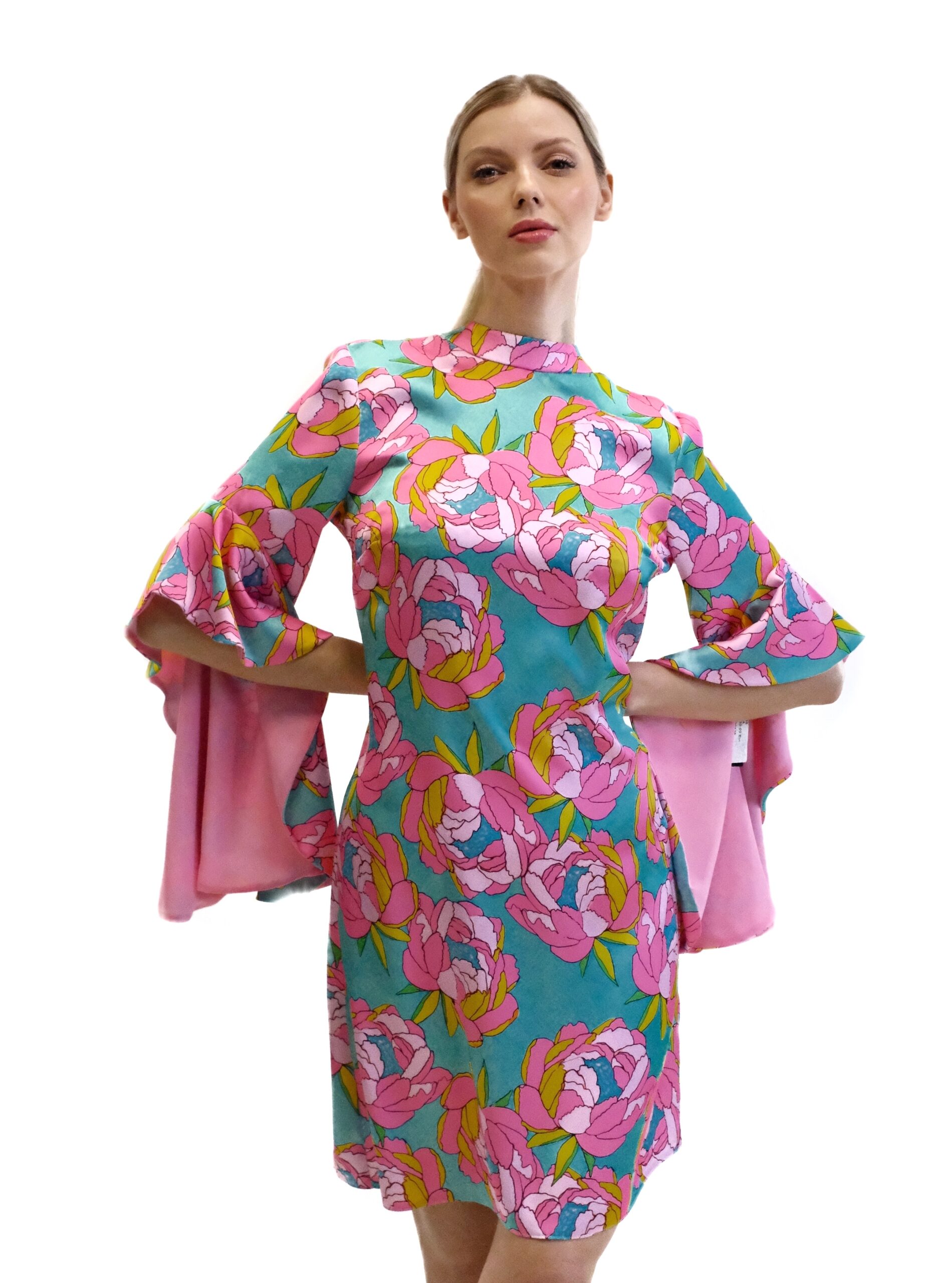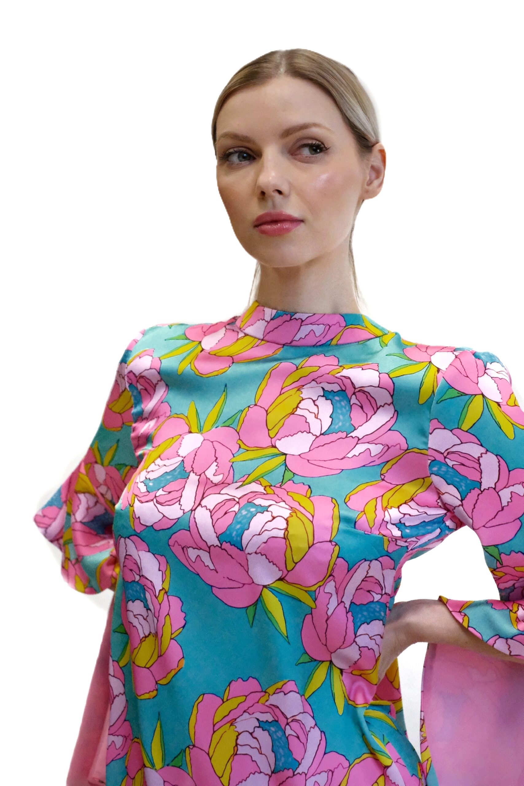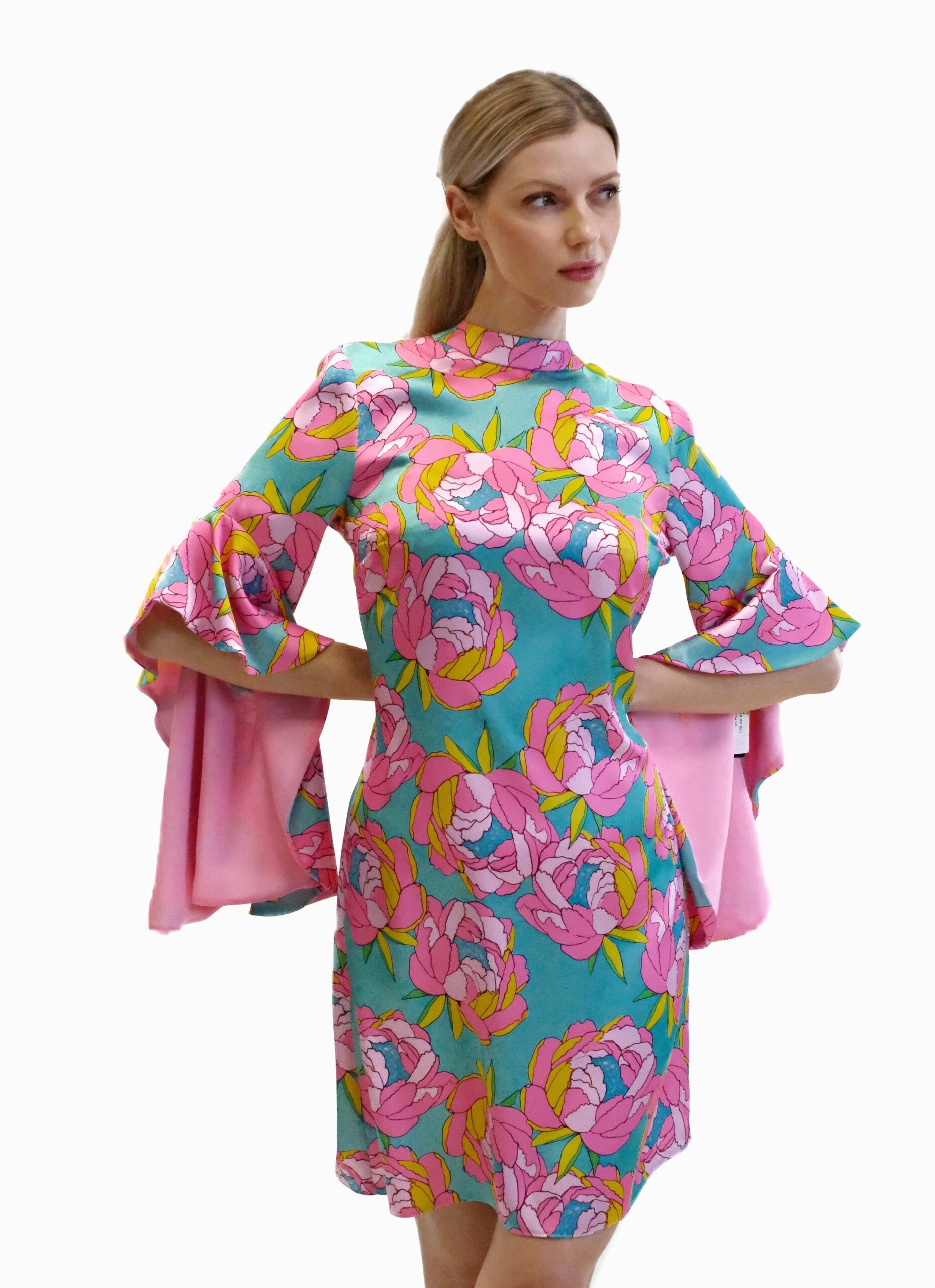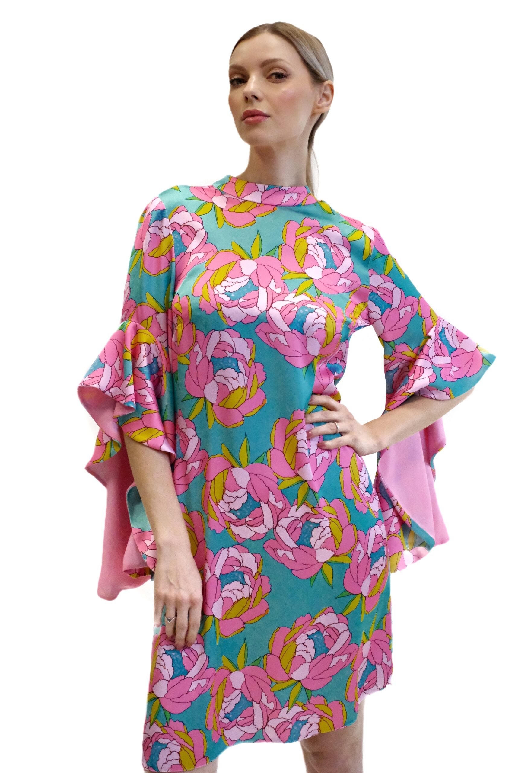 Šaty sú ušité v jednoduchom áčkovom strihu, ktorý pristane každej z Vás. Zaujímavým detailom je spracovanie rukávov, ktorá pri lakti prechádzajú do otvoreného volánu, ktorý šatám dodáva šmrnc a nádych romantiky. Šaty sú navrhnuté vo výraznom letnom vzore, ktorý Vás uchváti farebnosťou. Šaty hrajú všetkými farbami leta ako je ružová, tyrkysová a slniečkovo žltá. V tejto kombinácii tvoria nádherný kvetinový motív, ktorý v lesklom prevedení vyrazí dych na každej letnej oslave.