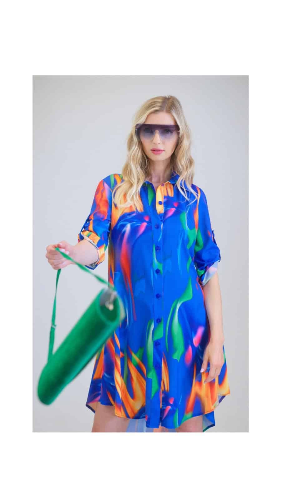 Šaty sú ušité v obľúbenom košeľovom strihu. Rukávy na šatách sa dajú vyhrnúť a zapnúť na gombík. Šaty sú inšpirované pánskym šatníkom konkrétne jeho stálicou a teda košeľou dodávajú vám potrebný komfort a zároveň sú veľmi vzdušné. Šaty sú ušité vo výraznom vzore ktorí doslova žiari farbami. Šaty s kombinujte s doplnkami ktoré sú farebne zobrazené na vzore teda červenou fialovou zelenou alebo výraznou oranžovou.