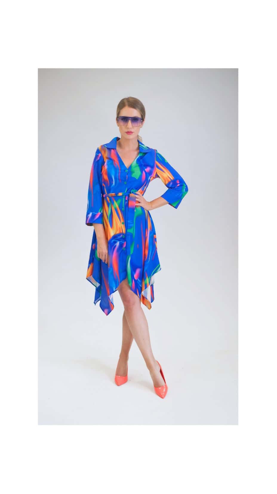 Šaty sú navrhnuté v zaujímavom košeľovom strihu ktorý nechá vyniknúť vašim nohám. Šaty majú asymetrický ušitú suknicu, vďaka čomu prirodzene predlžujú postavu. Šaty doslova žiaria farbami vo výraznom vzore. K šatám je priložený aj opasok z rovnakého materiálu, vďaka ktorému si dokážete vytvoriť osi pás. Košeľové šaty majú včkový výstrih, čo im dodáva na komforte. Šaty sú ušité z ľahkého letného materiálu a budete sa v nich cítiť ako keby na sebe nič nemáte.