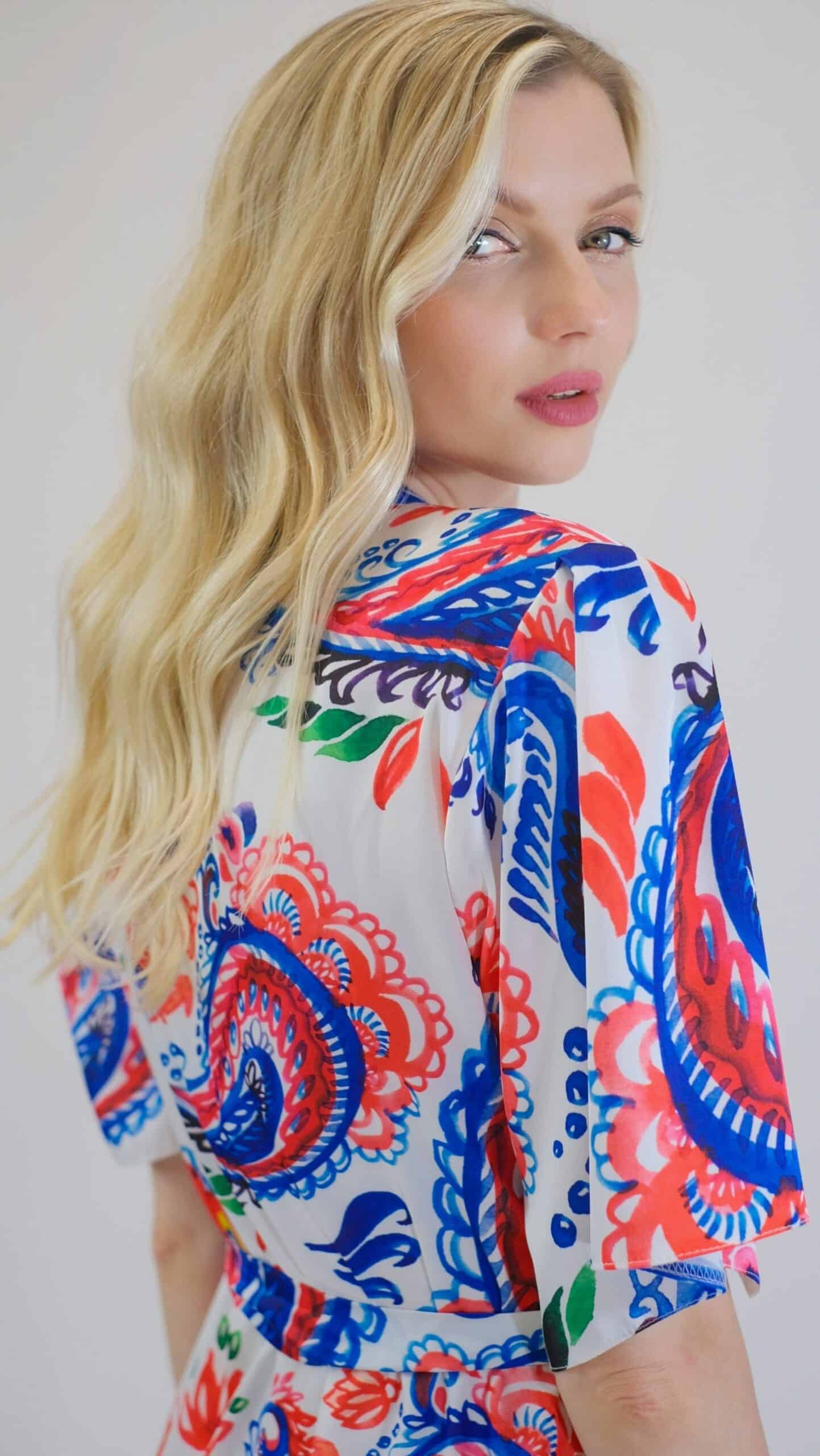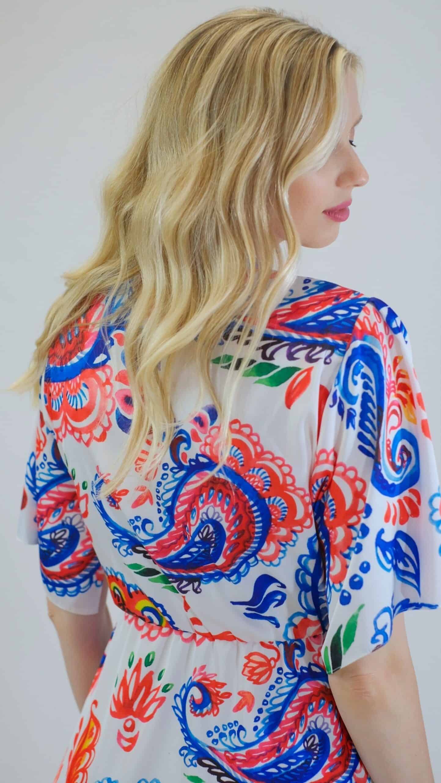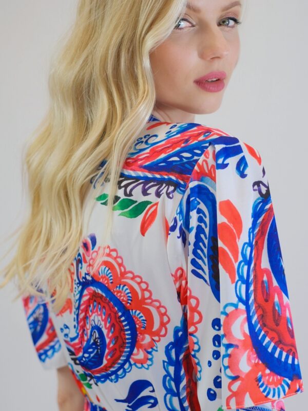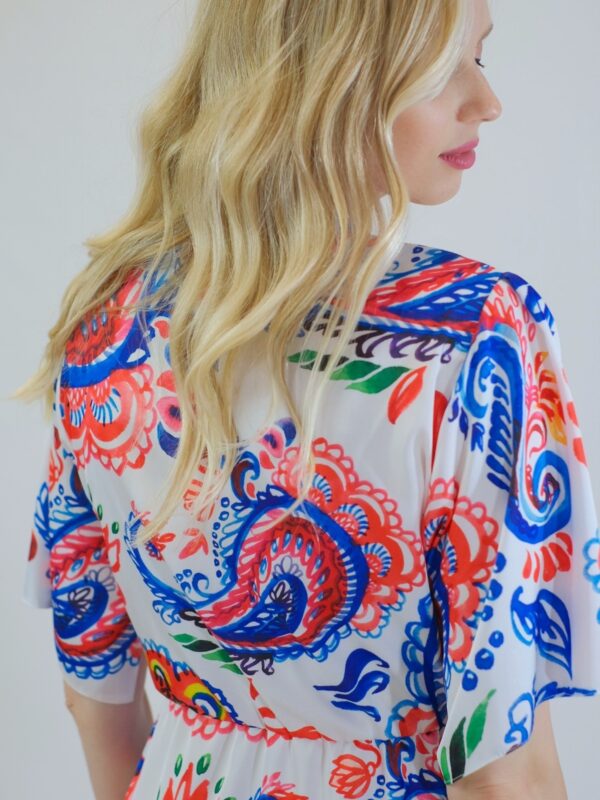 Šaty sú ušité z ľahkého a jemného materiálu, v ktorom sa budete cítiť ako keby na sebe nič nemáte. Šaty sú navrhnuté v modernom vzore, ktorý pripomína folklórny motív. Šaty sú ušité s ľahkými a voľnými rukávmi, ktoré ešte viac umocňujú ich letný charakter. Vzor, v ktorom sú šaty navrhnuté hra farbami odtieňmi modrej a červenej na bielom podklade. Šaty majú priložený opasok z rovnakého materiálu, ktorým si optický zúžite pás. Šaty kombinujte s výraznými doplnkami a podčiarknite ich výnimočnosť. Šaty vám budú skvelým spoločníkom počas tých najhorúcejších letných dní.