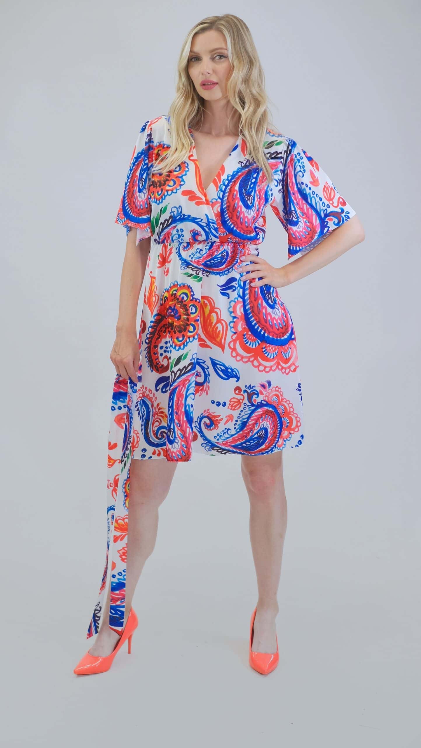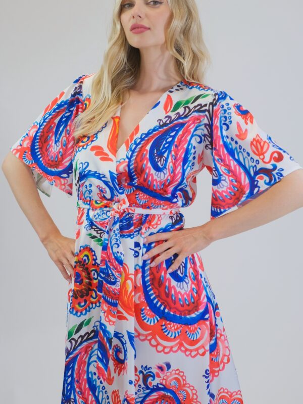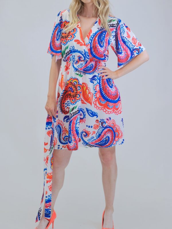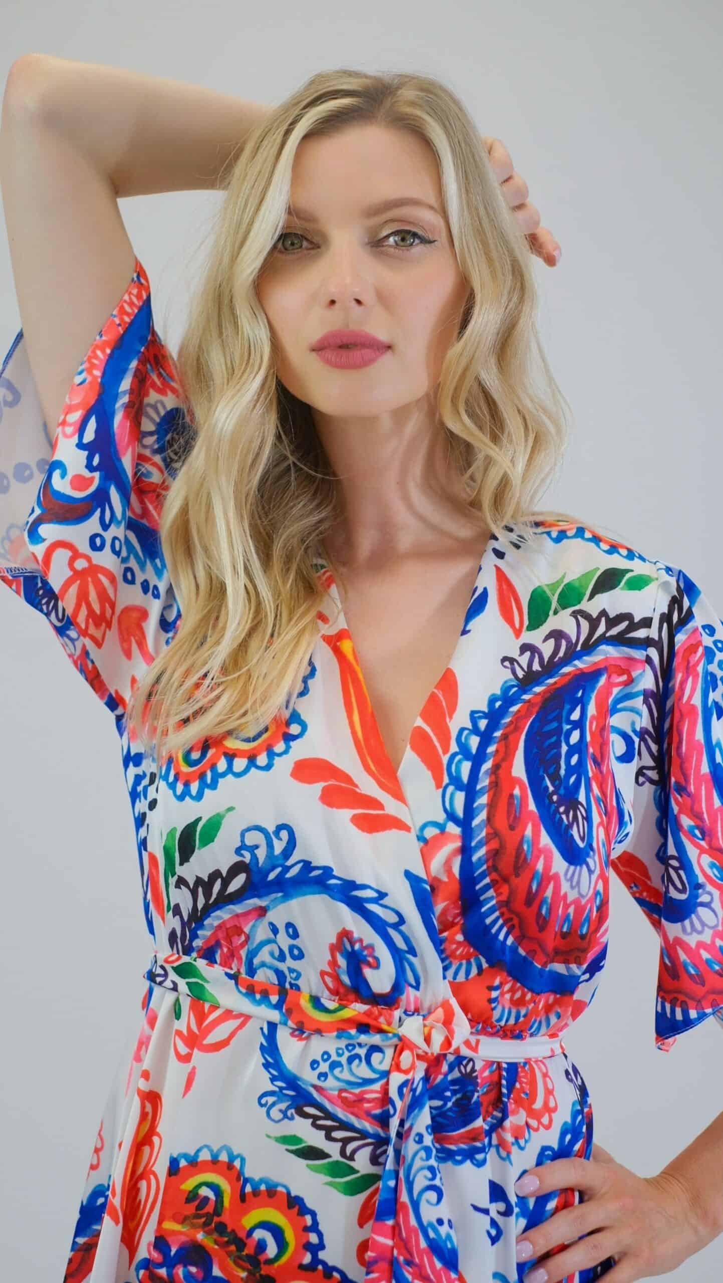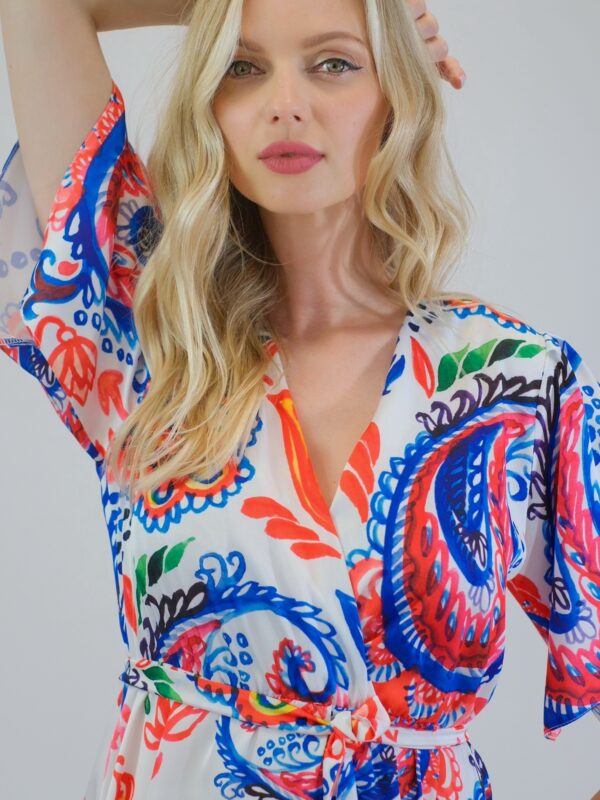 Šaty sú ušité z ľahkého a jemného materiálu, v ktorom sa budete cítiť ako keby na sebe nič nemáte. Šaty sú navrhnuté v modernom vzore, ktorý pripomína folklórny motív. Šaty sú ušité s ľahkými a voľnými rukávmi, ktoré ešte viac umocňujú ich letný charakter. Vzor, v ktorom sú šaty navrhnuté hra farbami odtieňmi modrej a červenej na bielom podklade. Šaty majú priložený opasok z rovnakého materiálu, ktorým si optický zúžite pás. Šaty kombinujte s výraznými doplnkami a podčiarknite ich výnimočnosť. Šaty vám budú skvelým spoločníkom počas tých najhorúcejších letných dní.