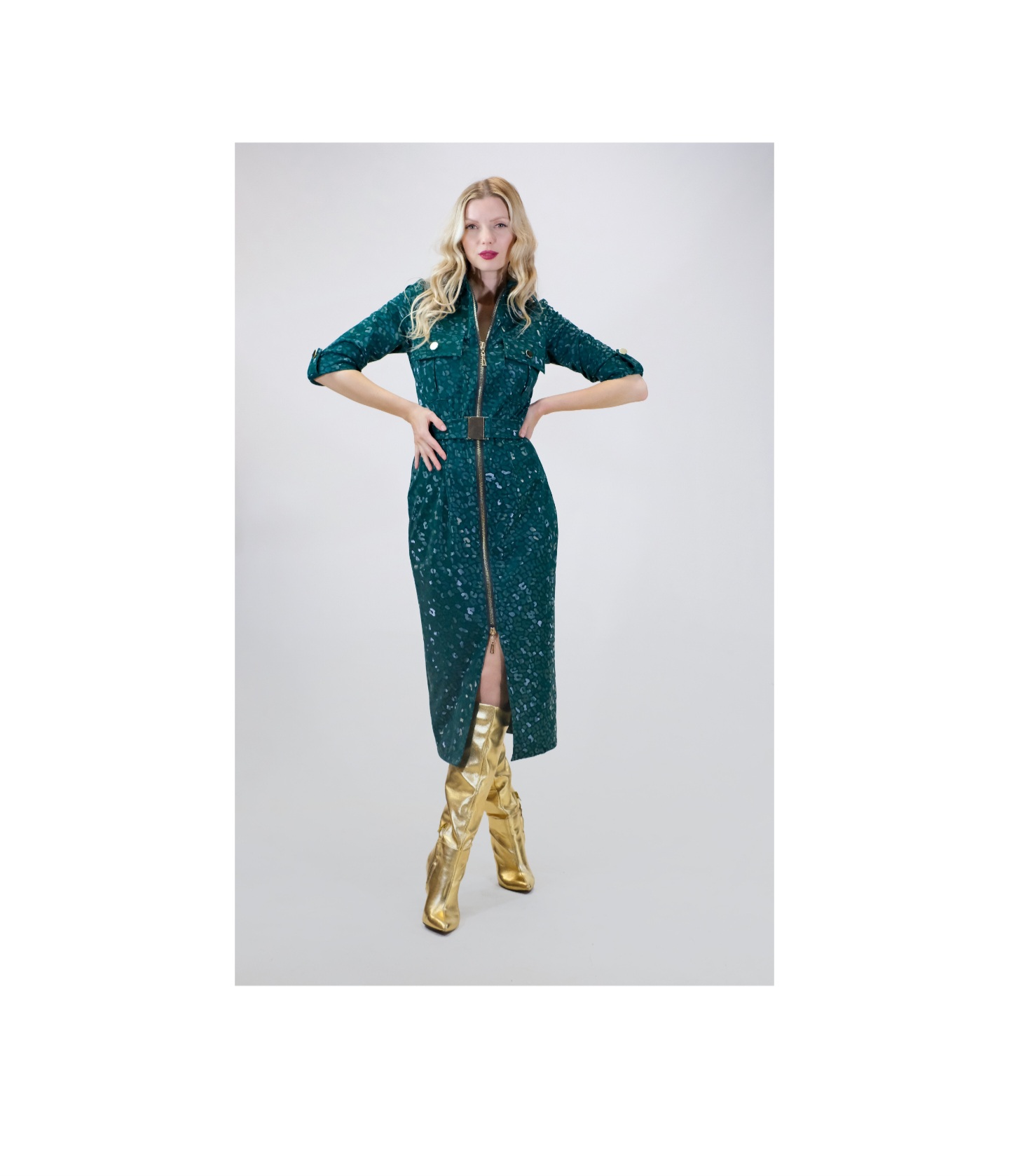Šaty sú navrhnuté v úzkom strihu s veľmi prispôsobivého materiálu, ktorý vám sadne ako druhá koža. Šaty sú ušité z elastického a hrubšieho materiálu. Zaujímavým detailom na šatách sú práve výrazné doplnky vo forme zipsu, ktorý je po celej dĺžke šiat. Šaty majú rukávy, ktoré sa dajú vyhrnúť. Šaty majú opasok z vlastného materiálu. Šaty sú ušité v nádhernej smaragdovo zelenej farbe s jemnou potlačou. Kombinujte so zlatými doplnkami pre wau efekt.