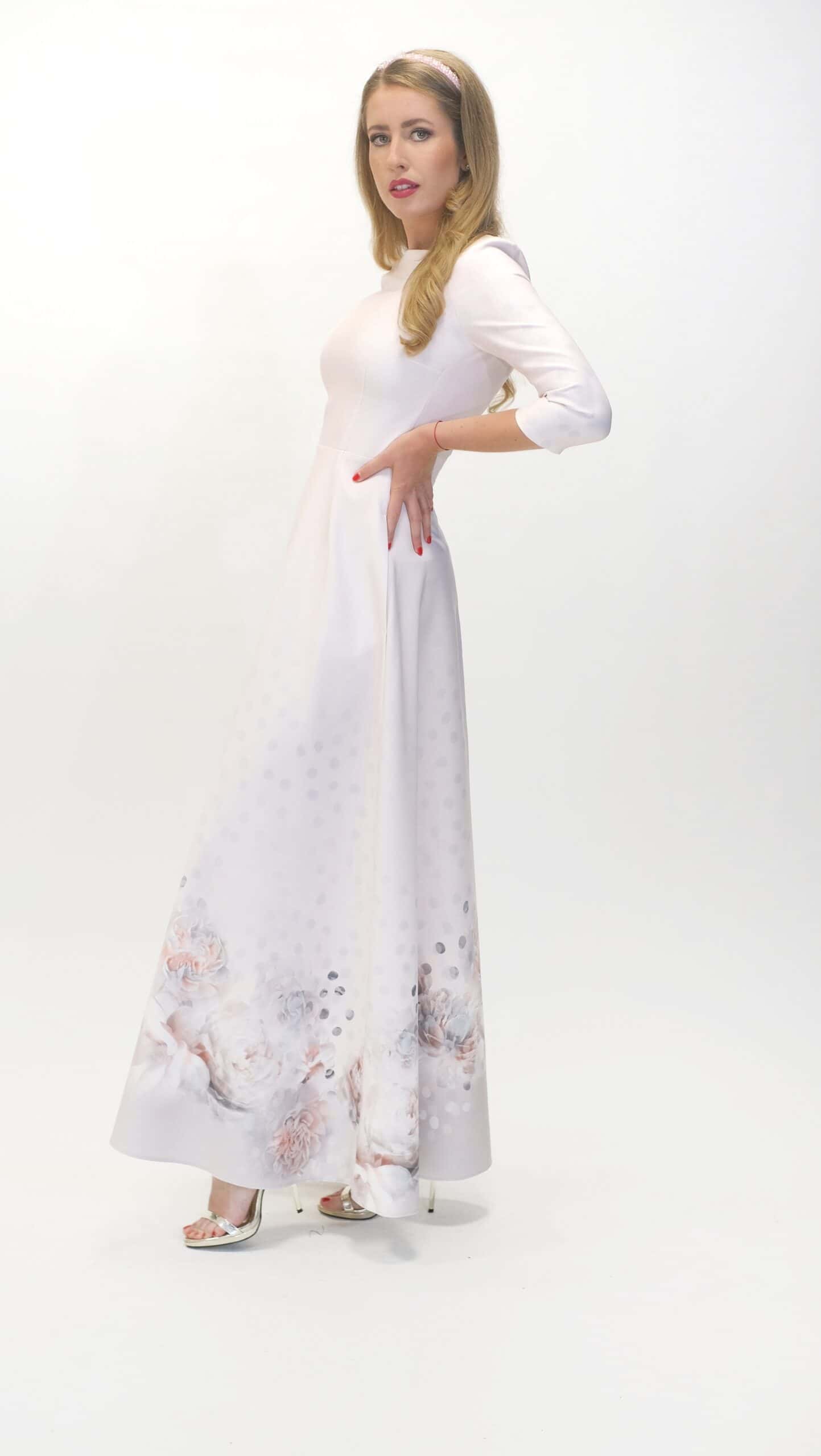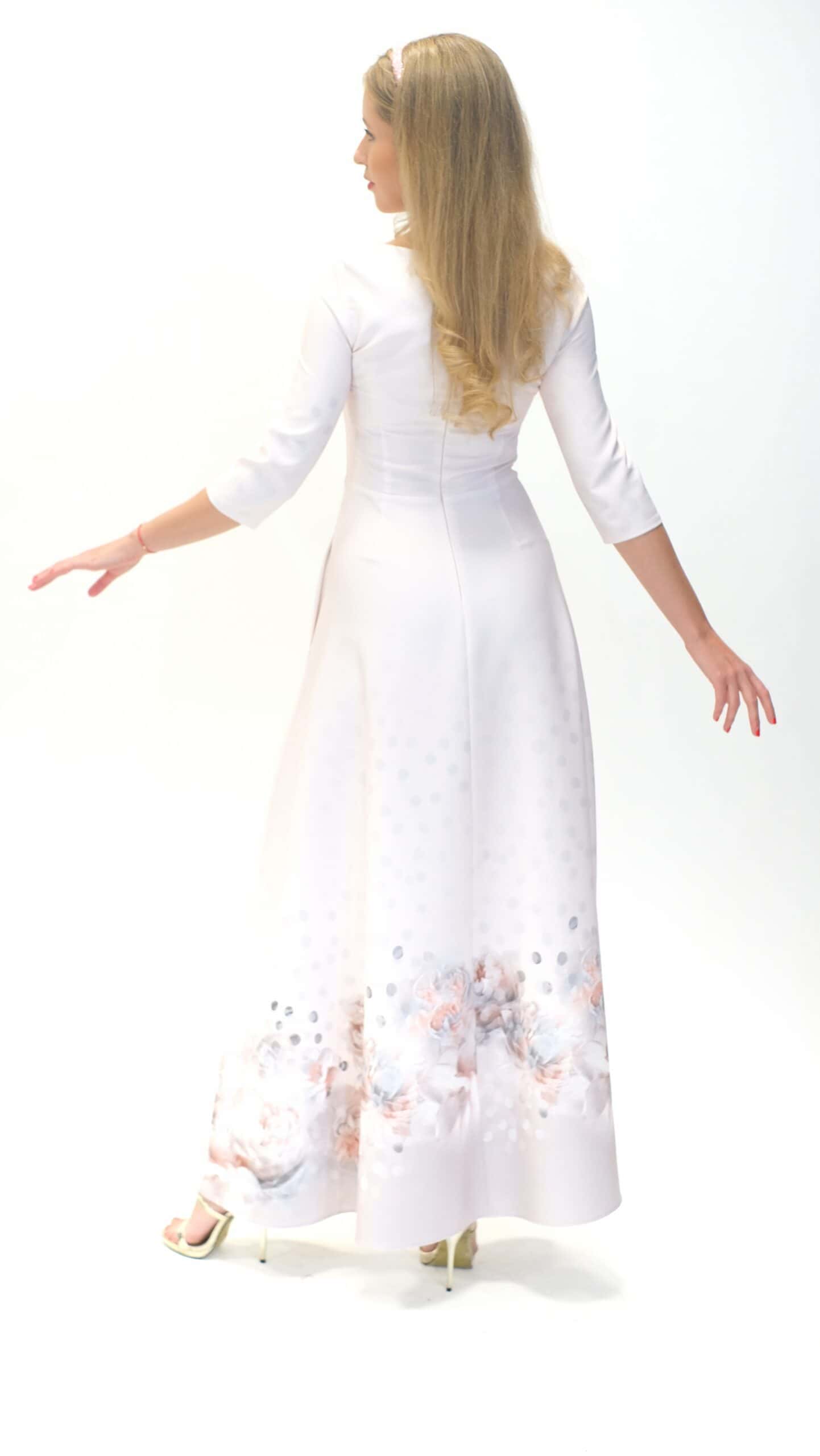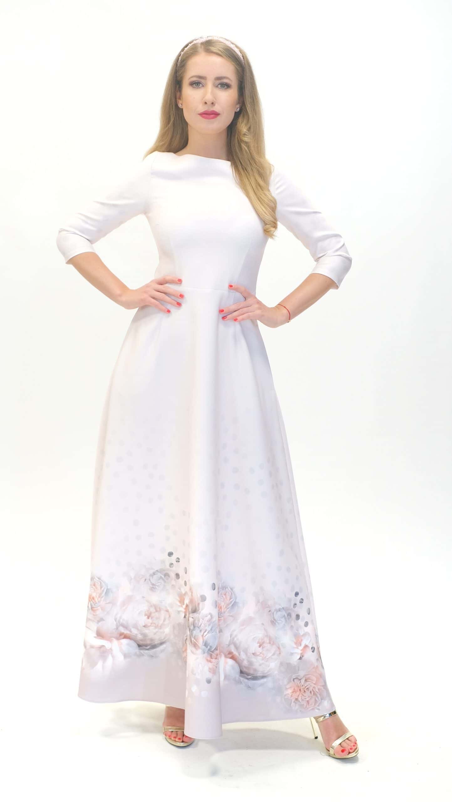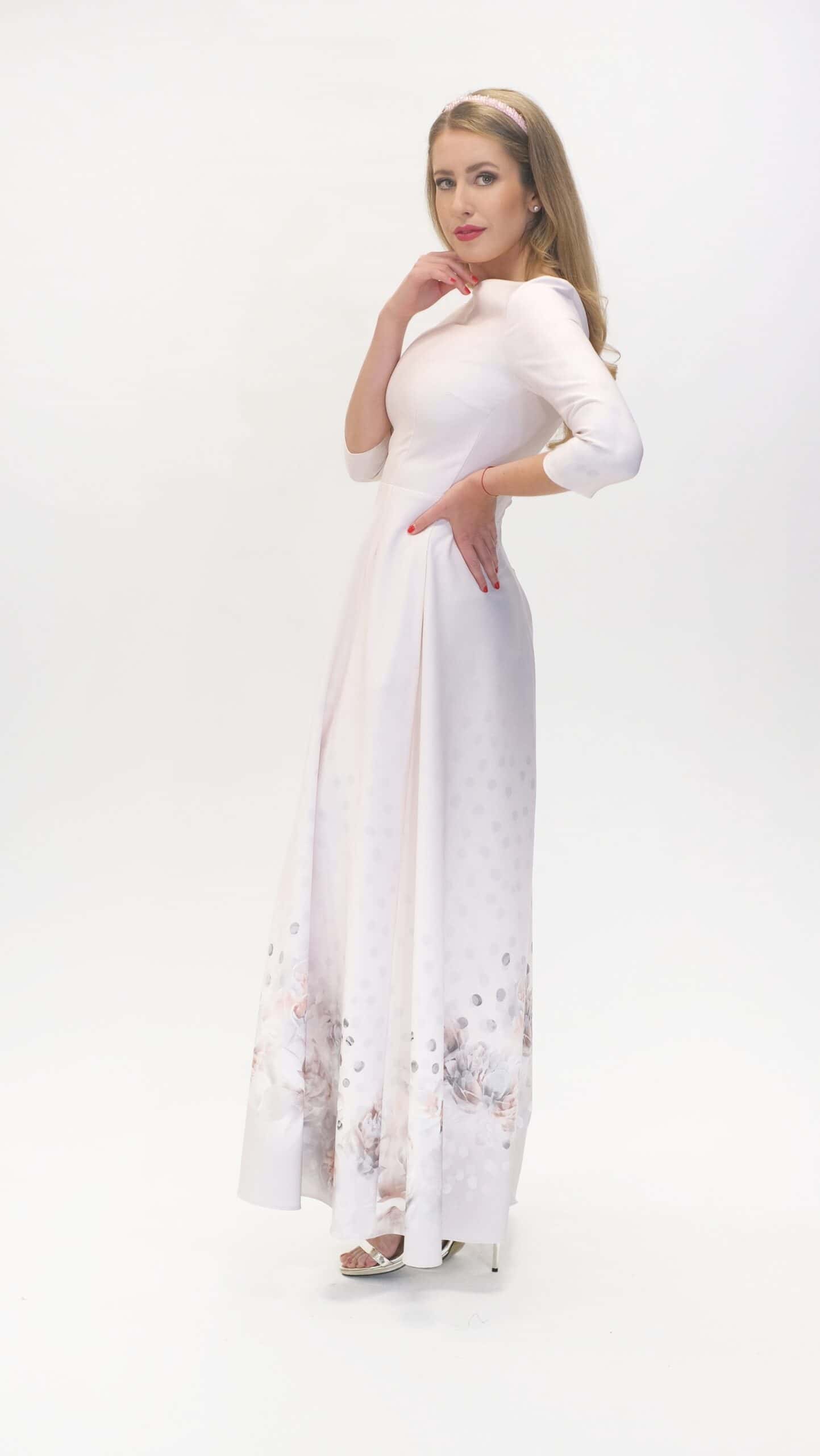 Šaty sú navrhnuté v jednoduchom strihu dlhom až po zem, ktorý necháva naplno vyniknúť nádhernej potlači. Šaty sú prestrihnuté v páse a krásne Vám opticky zúžia postavu. Šaty majú zároveň funkčné vrecká, čo im dodáva ležérny nádych. Skutočným klenotom, ktorý završuje strih šiat je krásna bordúrová kvetinová potlač, ktorá necháva naplno vyniknúť elegantnému strihu šiat. Bordúra obsahuje tlmené odtiene béžovej s vkusne zakomponovanými bodkami, ktoré sa objavujú v letných kolekciách už desaťročia.
