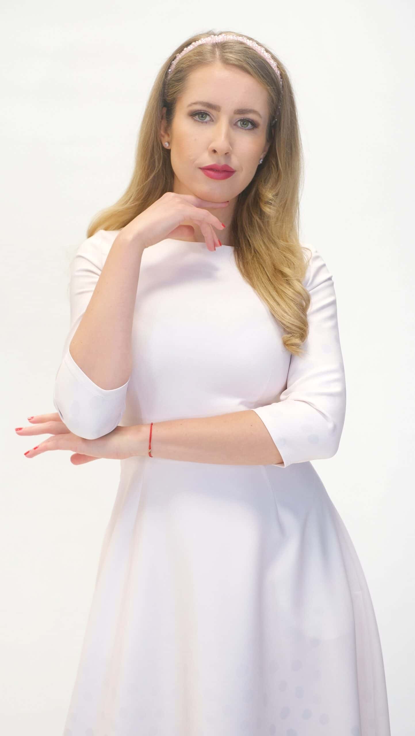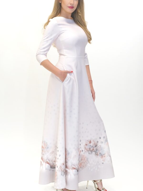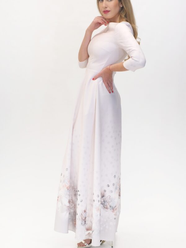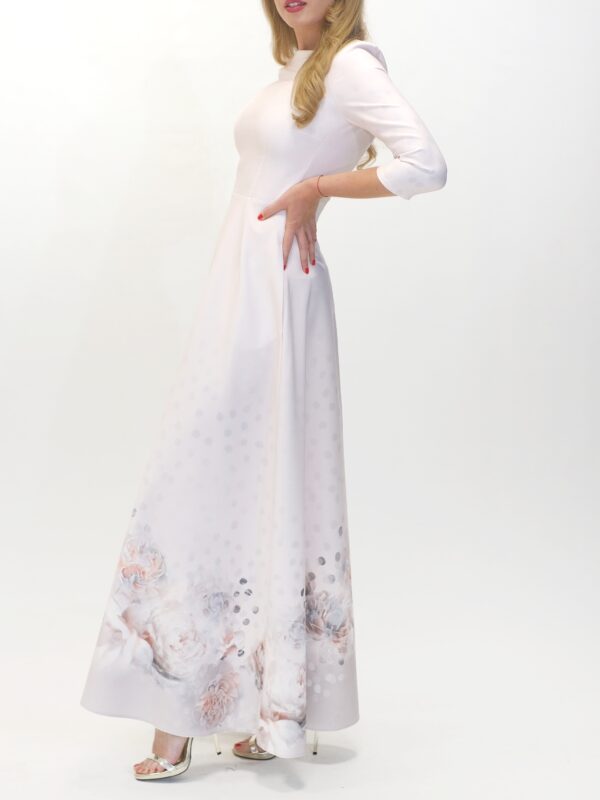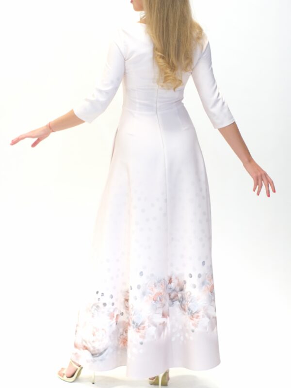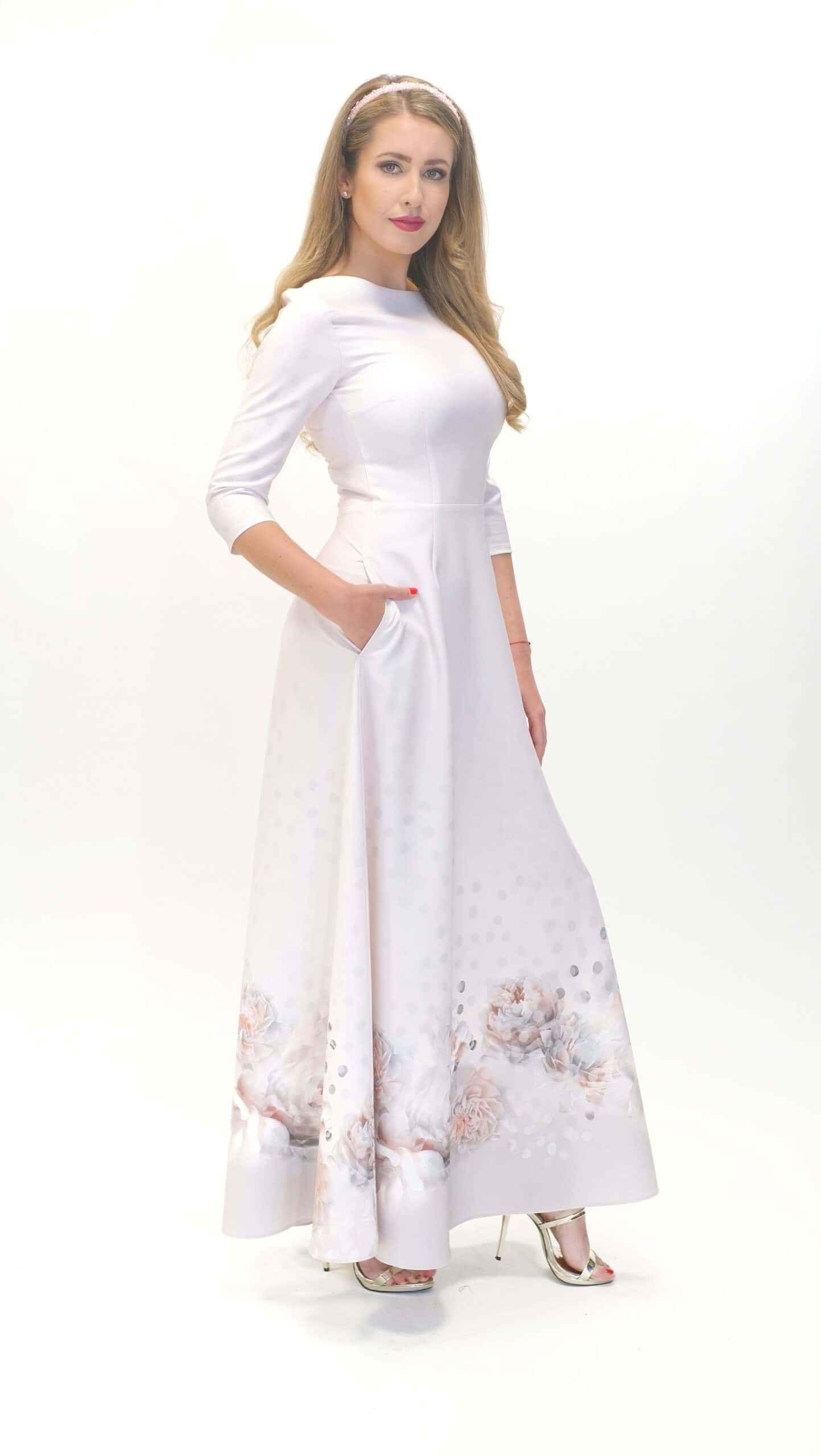 Šaty sú navrhnuté v jednoduchom strihu dlhom až po zem, ktorý necháva naplno vyniknúť nádhernej potlači. Šaty sú prestrihnuté v páse a krásne Vám opticky zúžia postavu. Šaty majú zároveň funkčné vrecká, čo im dodáva ležérny nádych. Skutočným klenotom, ktorý završuje strih šiat je krásna bordúrová kvetinová potlač, ktorá necháva naplno vyniknúť elegantnému strihu šiat. Bordúra obsahuje tlmené odtiene béžovej s vkusne zakomponovanými bodkami, ktoré sa objavujú v letných kolekciách už desaťročia.