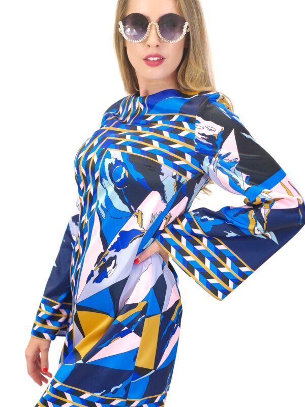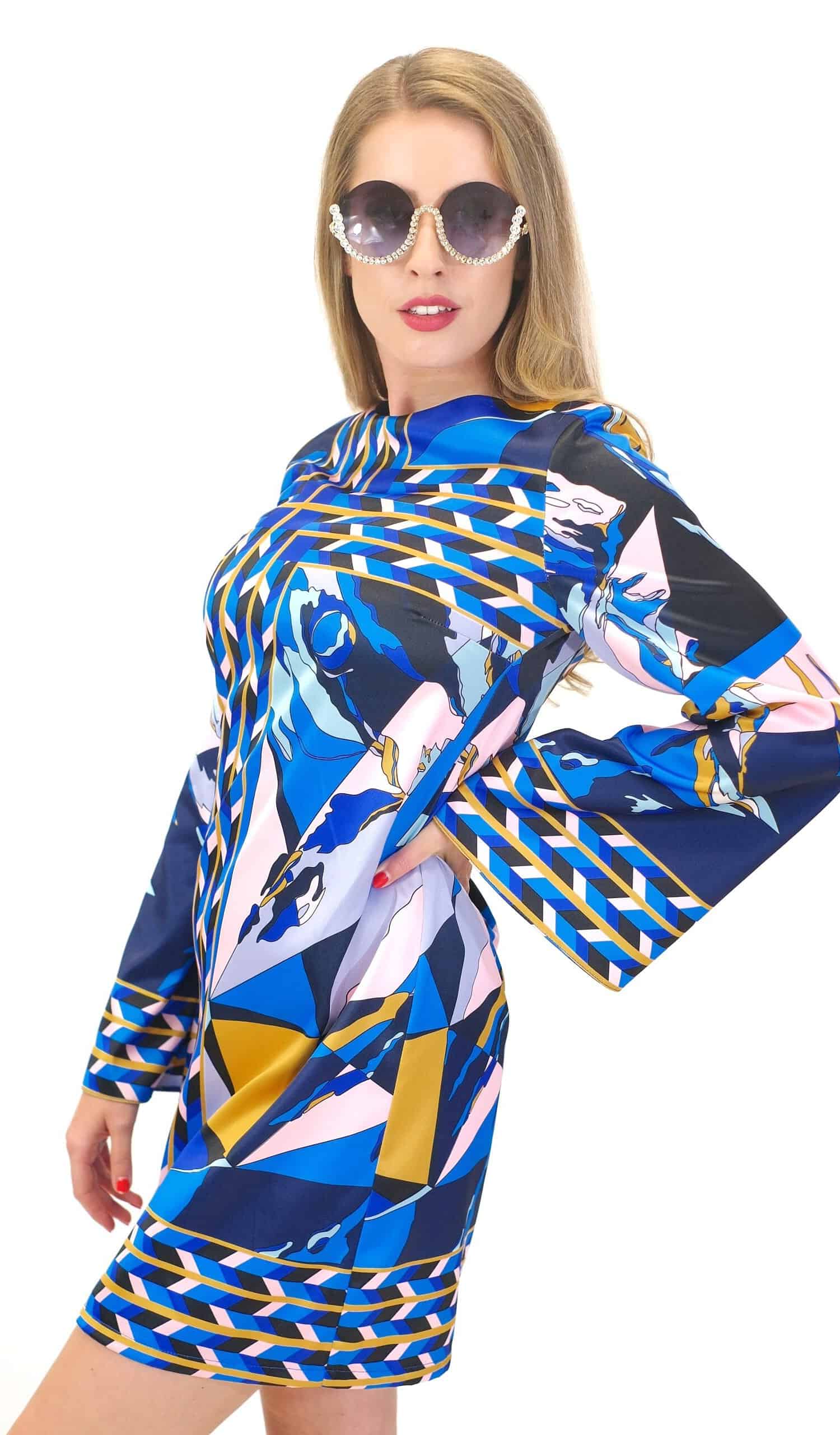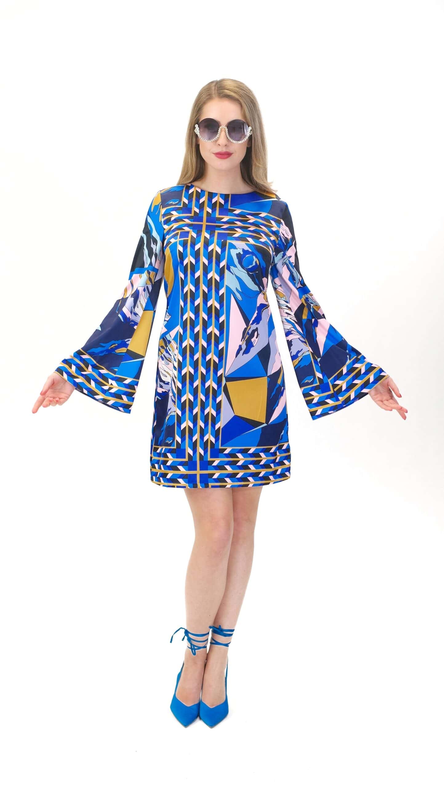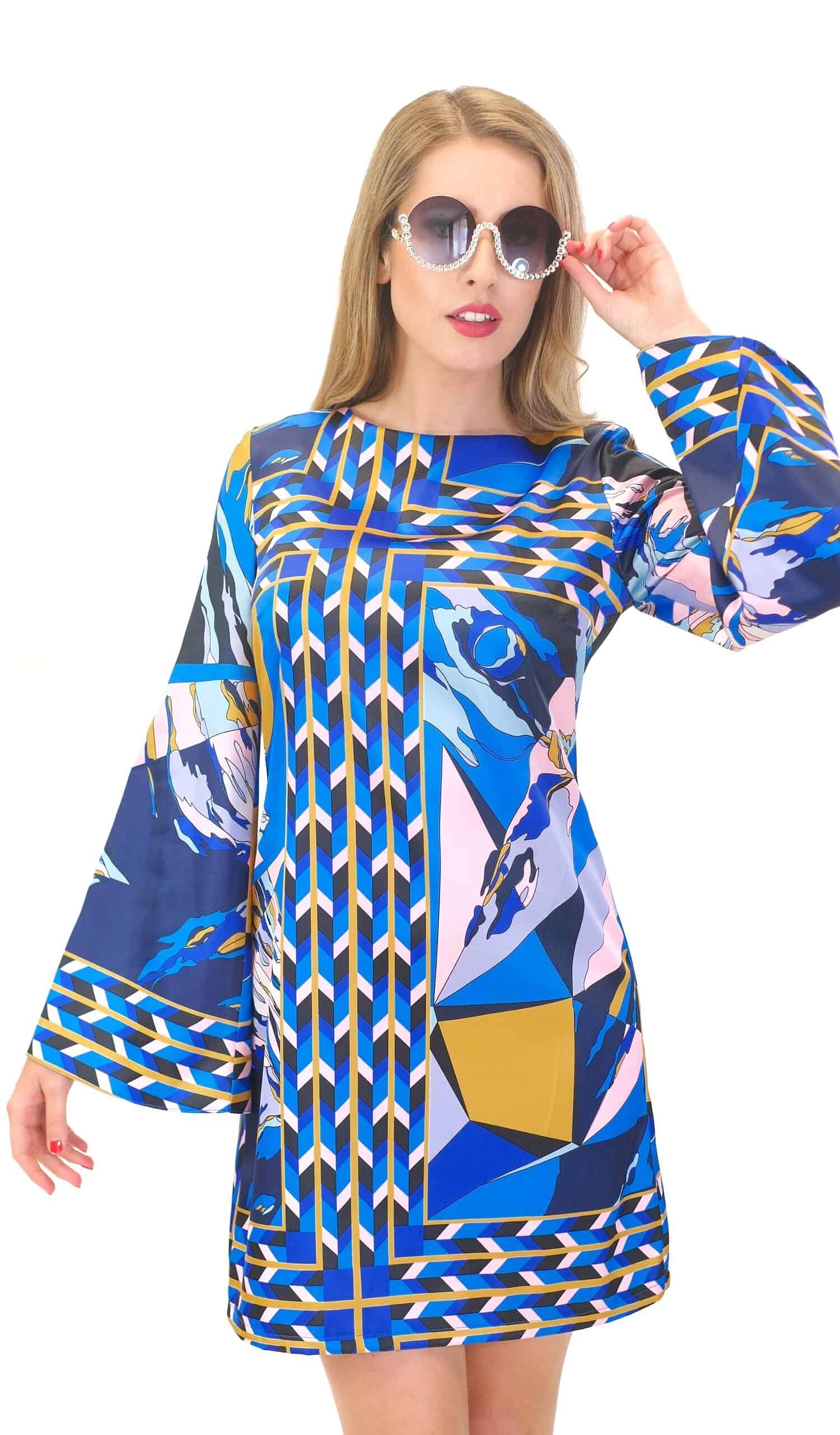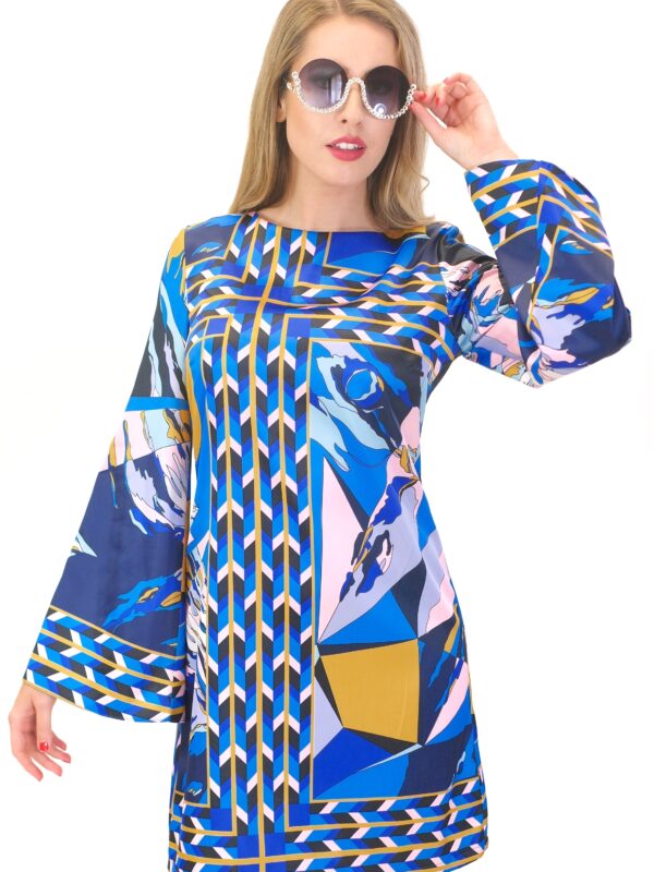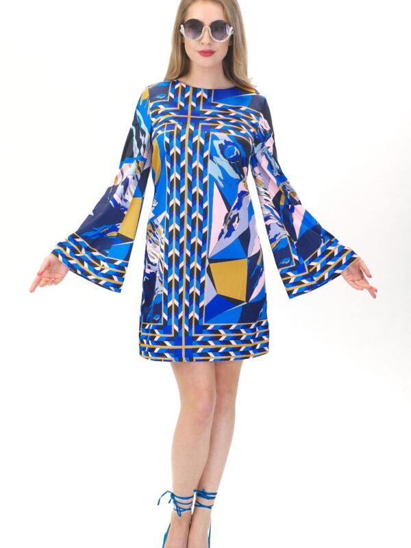 Šaty sú navrhnuté v jednoduchom áčkovom strihu s dlhými zvonovými rukávmi, ktoré nechávajú naplno vyniknúť nápaditému abstraktnému vzoru. Šaty výborne sadnú na každý typ postavy.