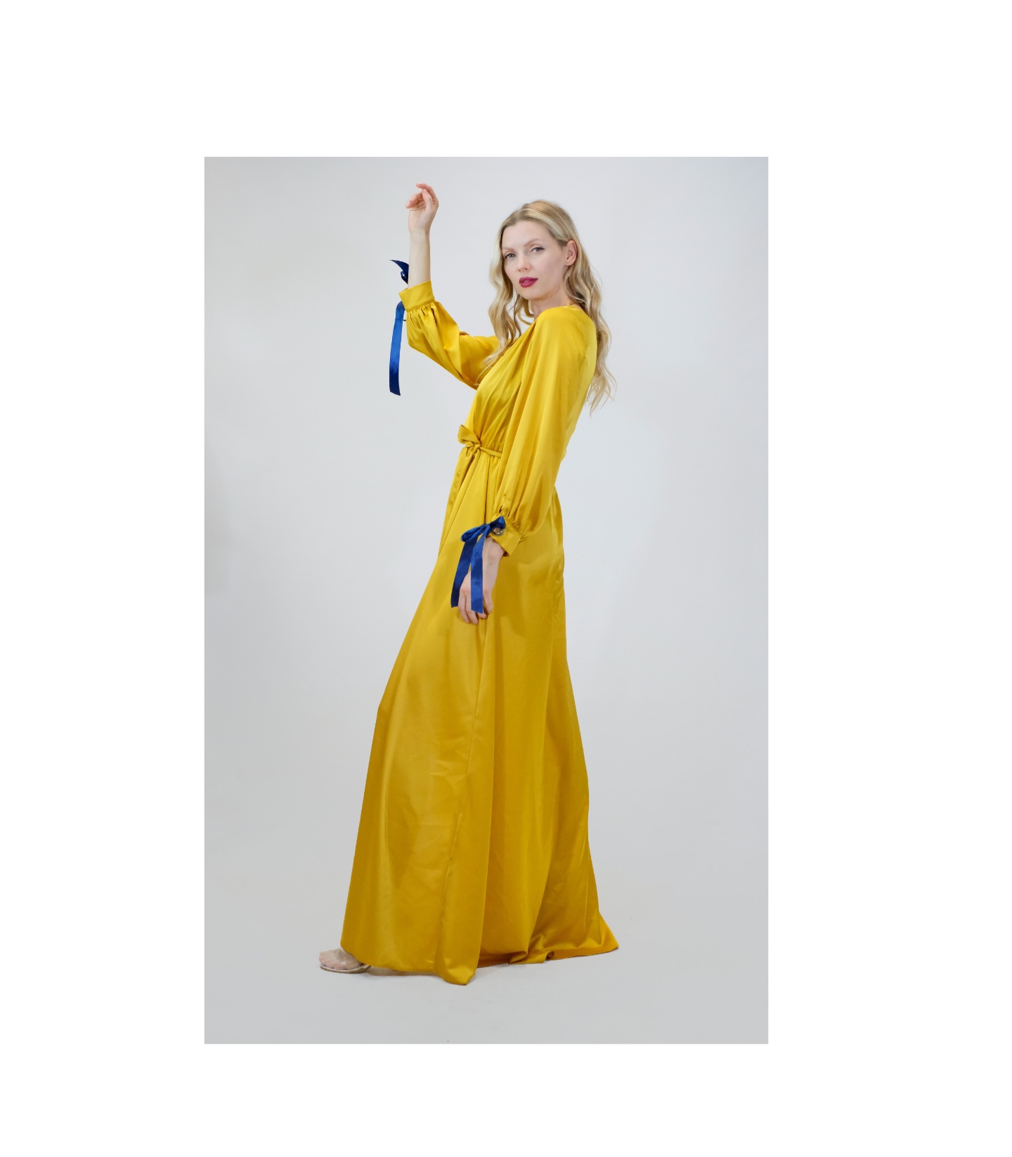 Šaty sú ušité v dĺžke až po zem, čo necháva vyniknúť ľahkému a padavé mu materiálu, z ktorého sú vyrobené. Šaty sú navrhnuté V lesklej a nadčasovej zlatej farbe. Šaty majú preložený výstrih a nádherný rozparok na suknici, ktorý im dodáva sex-appeal. Zaujímavým detailom sú ozdobné modré šnúrky na manžetách. Šaty sú kombináciou ležérnosťi a elegancie. Kombinujte so zlatými alebo smaragdovými doplnkami ako naša aranžérka.