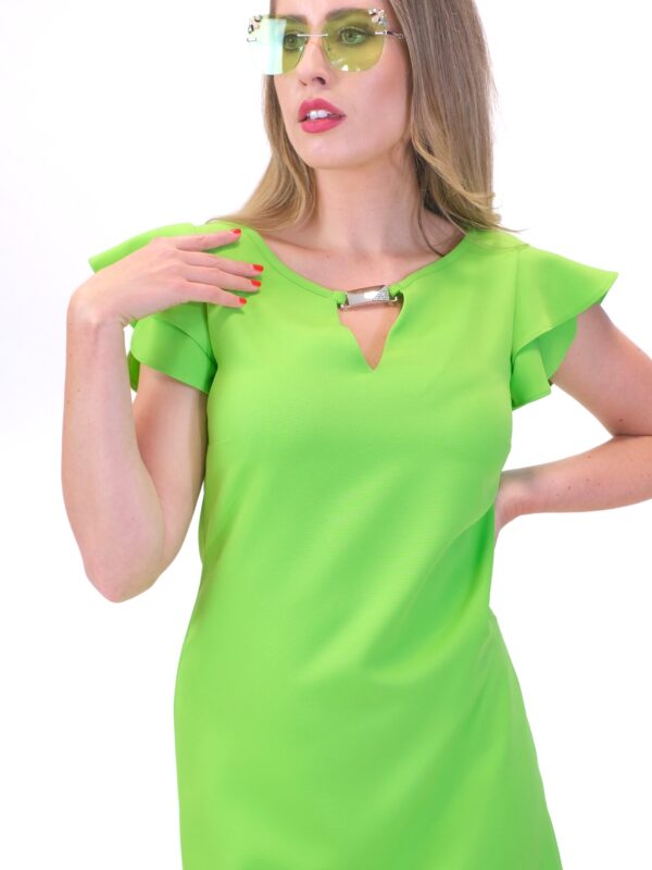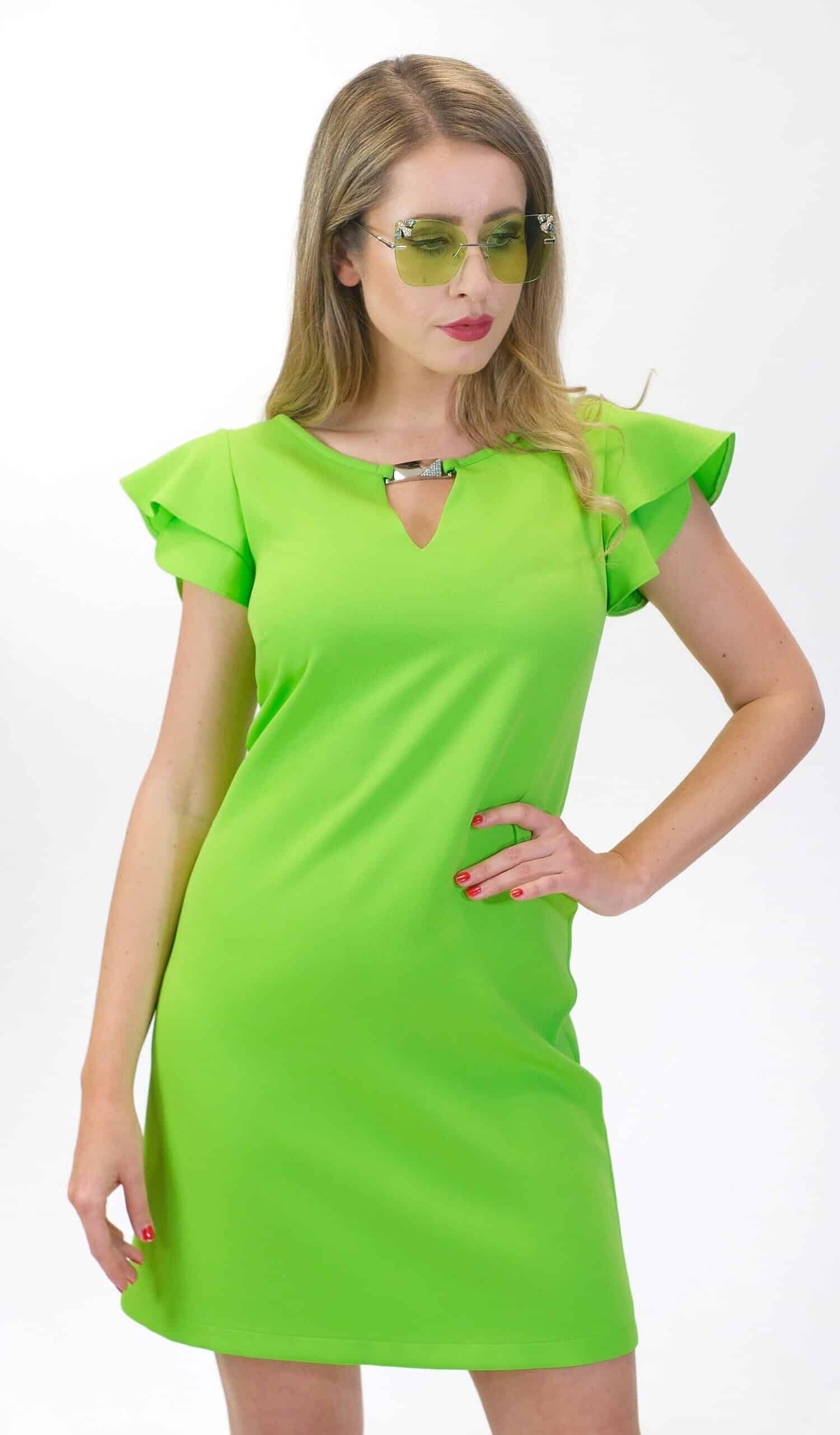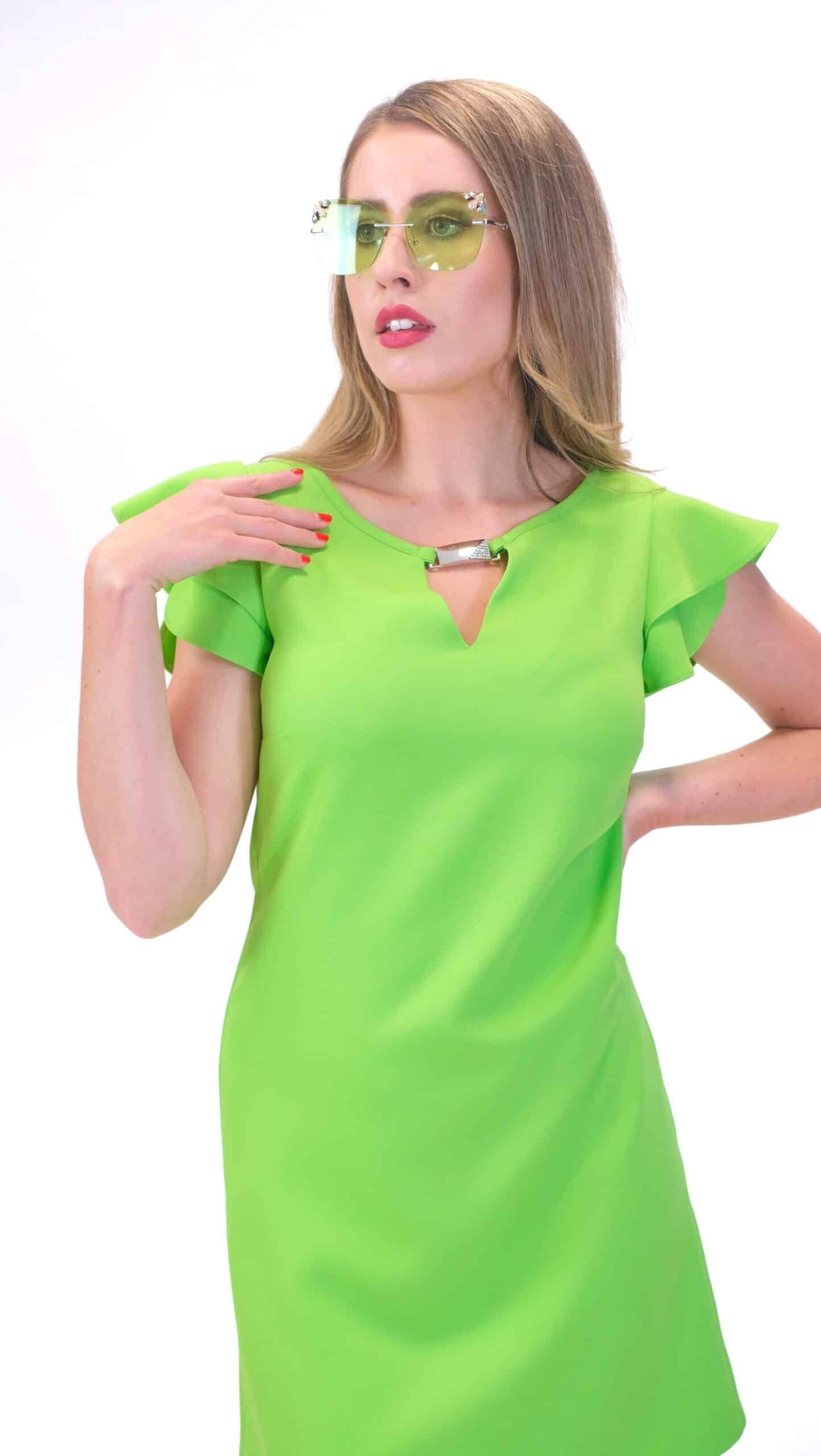 Šaty sú navrhnuté v jednoduchom áčkovom strihu, ktorý výborne sadne na každý typ postavy. Šaty sú ušité s romantickými volánovými rukávmi a výborne ich dokážete nosiť celodenne, to znamená, že Vám rovnako dobre poslúžia počas dňa v práci ako aj na oslave s vhodnými doplnkami. Zaujímavým detailom je ozdobná spona vo výstrihu, ktorá šatám dodáva šmrnc. Šaty sú ušité v žiarivej zelenej farbe a ľahko ich skombinujete s letnými farbami ako cyklámenová, žltá alebo modrá.