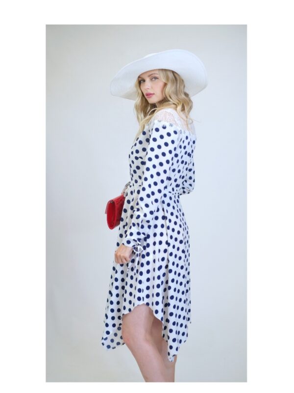 Šaty sú ušité v obľúbenom košeľu vám strihu ktorý sadne skvele na každý typ postavy. Šaty sú ušité v asymetrickom košeľovom strihu a kde sú kratšie boky majú výrazný bodkovaný vzor ktorý je nesmrteľný a na mólach módnych návrhárov sa objavuje už niekoľko desaťročí. Šaty sú ušité na bielom podklade s tmavomodrými bodkami. Zaujímavým detailom na šatách je spracovanie vrchnej časti šiat kde je našitá biela krajka, ktorá im dodáva na vzdušnosti a elegancii. Šaty s kombinujte s červeným doplnkami pre klasický look a môžte pridať aj biely klobúk ako naša stylistka. Šaty sú ideálnym spoločníkom na letnú oslavu alebo príjemný letný večer s priateľmi.