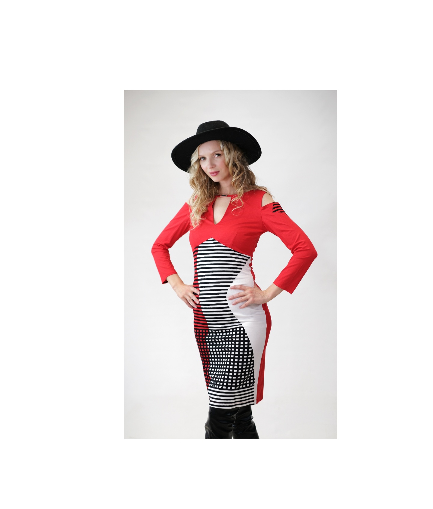 Šaty sú ušité z pohodlného prírodného materiálu, v ktorom sa budete cítiť príjemne a vzdušne. Šaty sú navrhnuté z elastického úpletového materiálu, ktorý sa Vám skvele prispôsobí. Šaty majú geometrický vzor a kombinujú farby, ktoré má každá z Vás šatníku ako biela, čierna alebo červená,takže nebudete mať problem nájsť k nim vhodné doplnky. Zaujímavym detailom sú odhalené ramená.