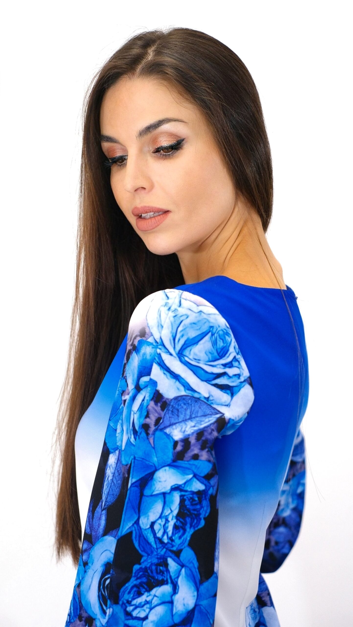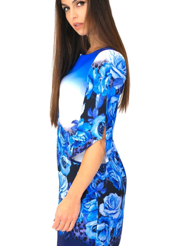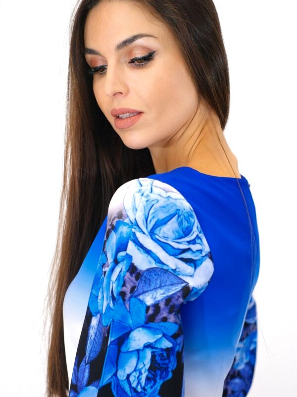 Šaty sú navrhnuté v áčkovom strihu, ktorý výborne sadne na každý typ postavy. Šaty sú ušité vo výraznom vzorovom materiáli, ktorý hrá všetkými odtieňmi modrej a zakončený je bordúrou v podobe ruží. Šaty majú široké rukávy, ktoré sú prestrihnuté, čo im pridáva na komforte. Zaujímavým detailom je čierna perla vo výstrihu. Šaty sú pre milovníčky zimných kvetových vzorov, v ktorých budete skvele vyzerať v práci aj na oslave. Na oslavu ich skombinujte so striebornými alebo metalickými doplnkami.