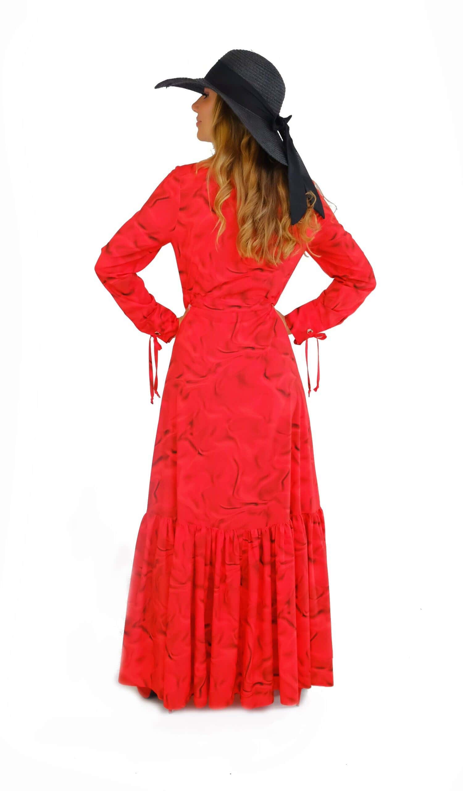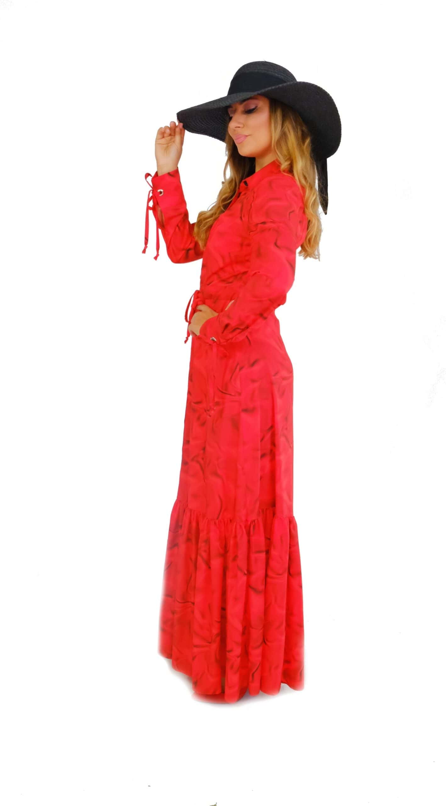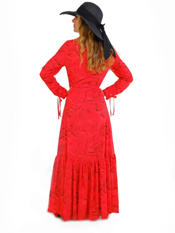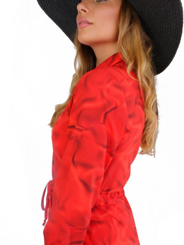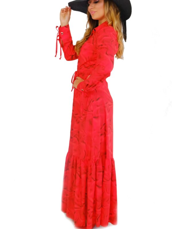Šaty sú ušité až po zem vo Vašom obľúbenom košeľovom strihu , ktorý skvele sadne na každý typ postavy. Šaty sú navrhnuté , aby ste sa v nich cítili pohodlne a okrem rovného strihu sa dajú stiahnuť v páse. Šaty majú manžetové zakončenie rukávov inšpirované pánskym šatníkom. Zaujímavým detailom je volán v spodnej tretine šiat, ktorý im dodáva na romantickosti a pri pohybe sa krásne vlní. Šaty sú navrhnuté v krásnom abstraktnom vzore, ktorý žiari odtieňmi červenej a skvele v nom vyniknete skombinujte s čiernymi alebo zlatými doplnkami.