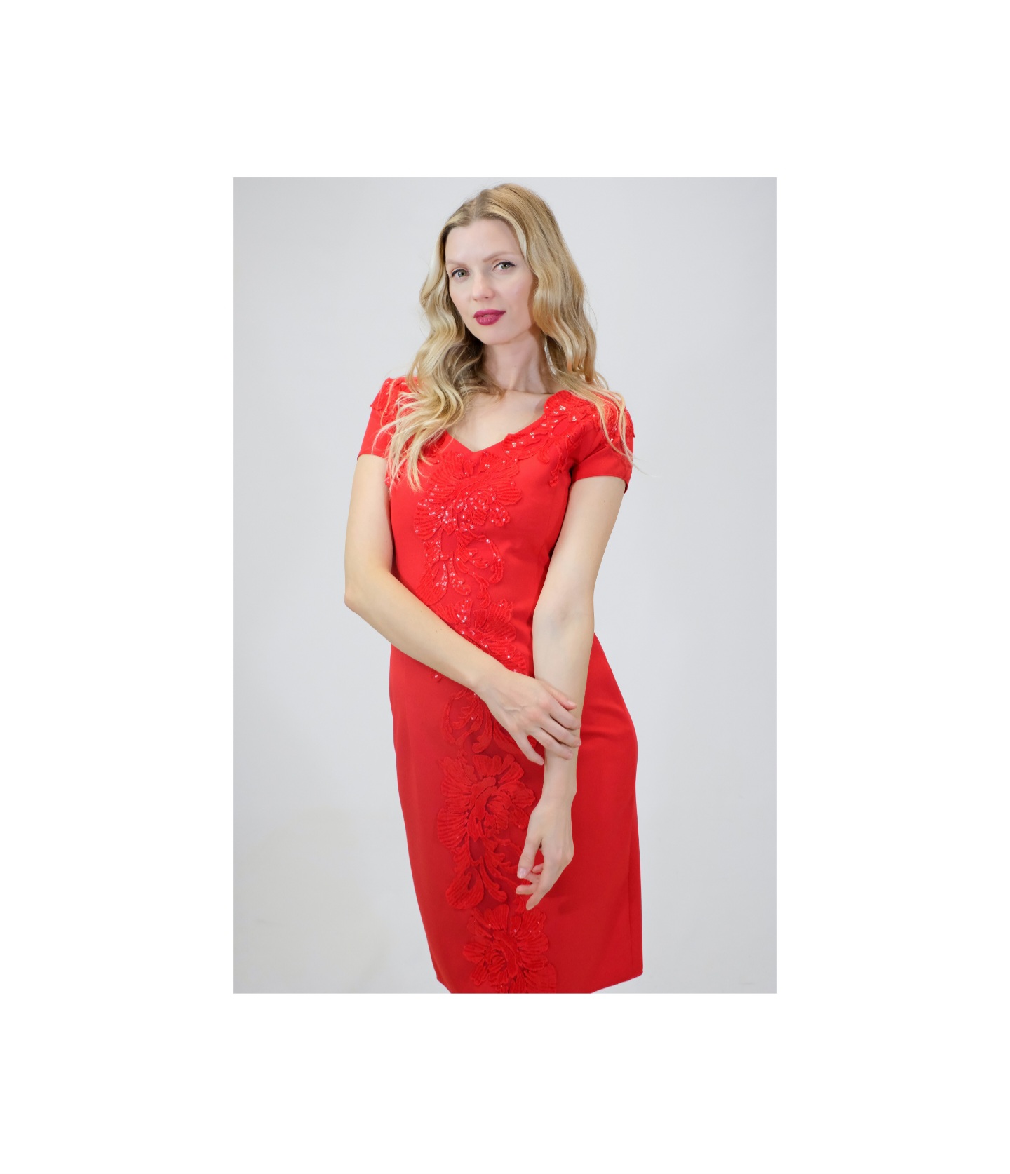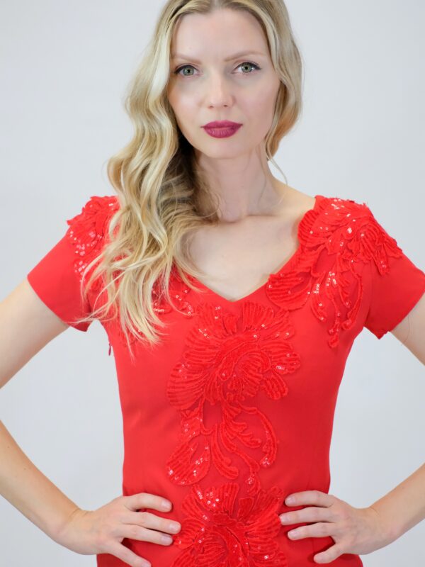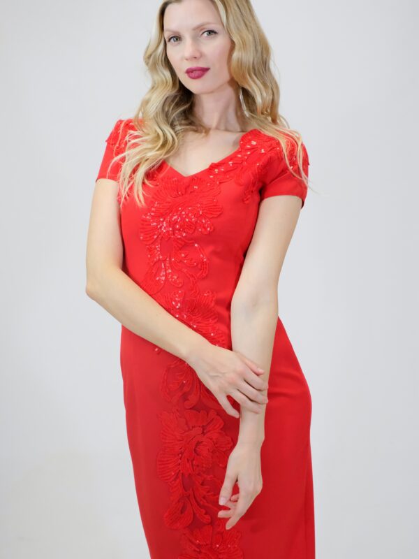 Šaty sú navrhnuté v jednoduchom rovnom strihu, ktorý sadne na vašu postavu. Šaty sú ušité vo výraznej červenej farbe S krajkou v rovnakom tóne, ktorý šatám dodáva spoločenský nádych. Krajka na šatách je lesklá. Šaty môžete kombinovať s doplnkami v rovnakom tóne alebo siahnite po overené klasike ako napríklad čierna.