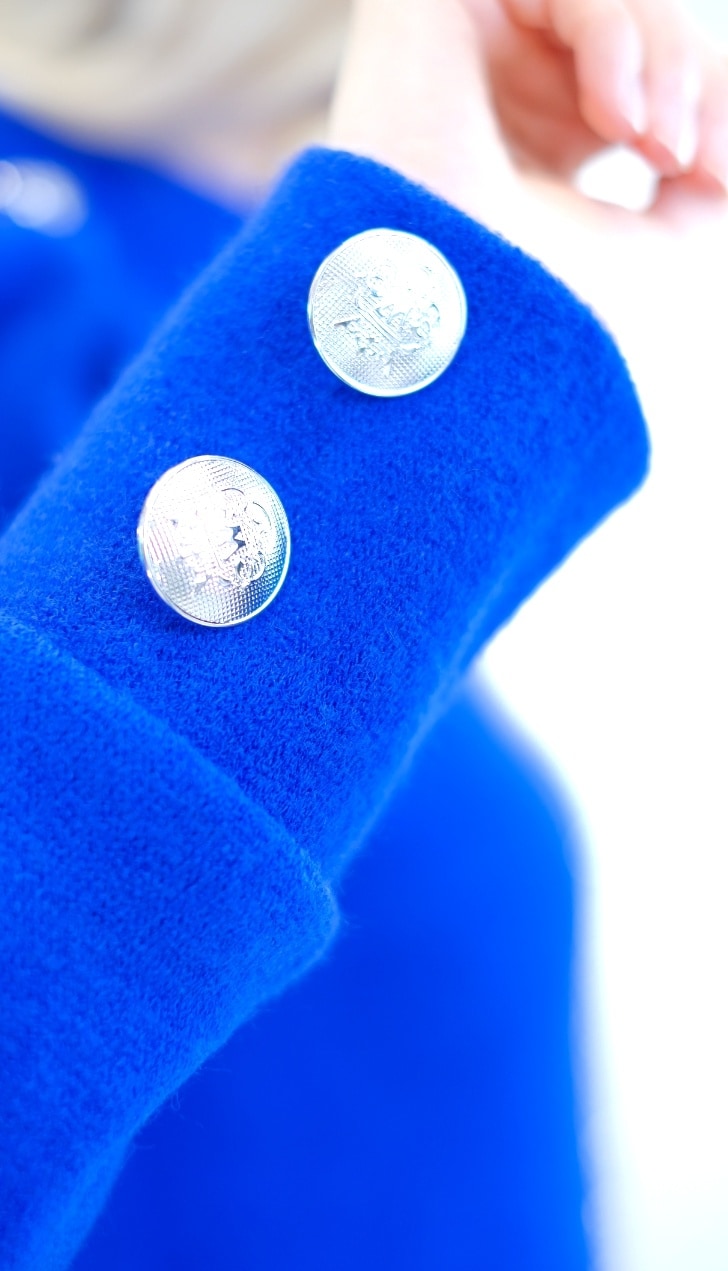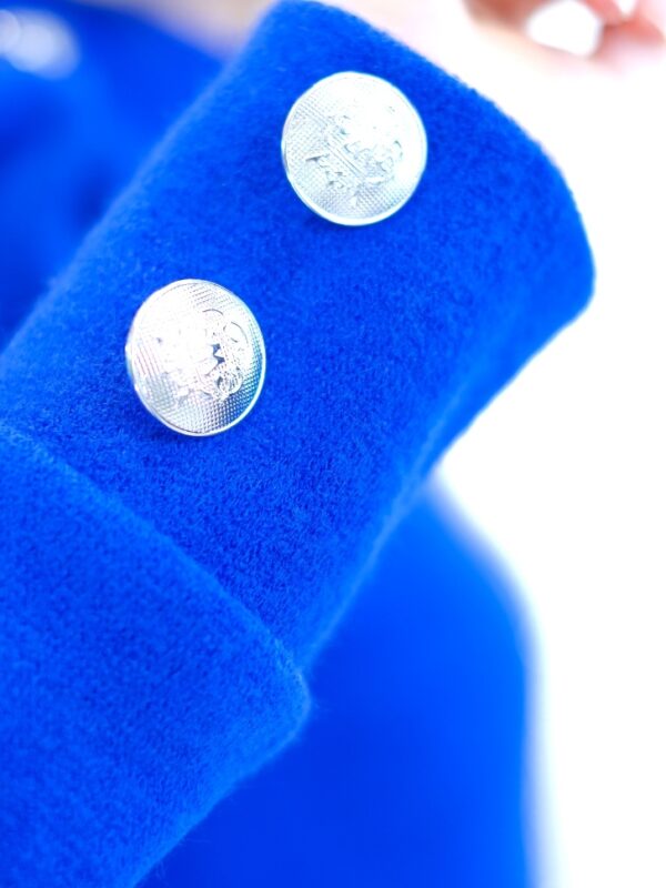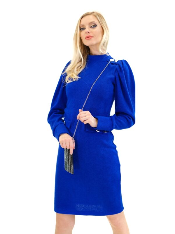 Šaty sú ušité v pohodlnom úpletovom materiáli, ktorý na dotyk pripomína Váš obľúbený sveter. Šaty sa skvele prispôsobia Vašej postave a budete sa v nich cítiť pohodlne počas celého dňa. Zaujímavým detailom sú ozdobné gombíky na rukávoch a ramenách a taktiež falošné vrecká, ktoré šatám dodávajú ležérny nádych. Ideálne šaty na chladivý deň do práce. Šaty sú navrhnuté v prenikavej modrej farbe, ktorú viete skvele zladiť s farbami zimných mesiacoch ako okrovo žltá alebo bordová.