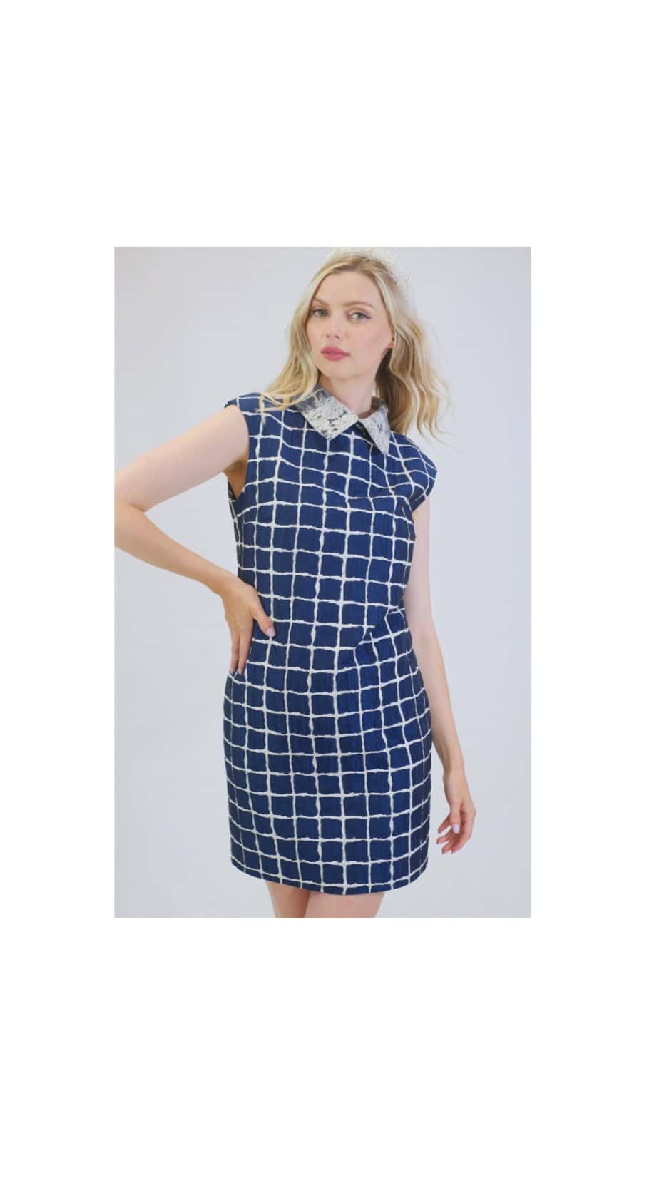 Šaty sú ušité v úzkom strihu, ktorý zdôrazní vašu postavu. Šaty sú navrhnuté v pevnom brokátovom materiáli, ktorý vám skvele vyformuje postavu. Šaty majú geometrický vzor, ktorý je kombináciou bielej a tmavomodrej farby. Zaujímavým detailom na šatách je ozdobný golier, ktorý dodáva šatám jedinečný Look. Šaty sú podšité.