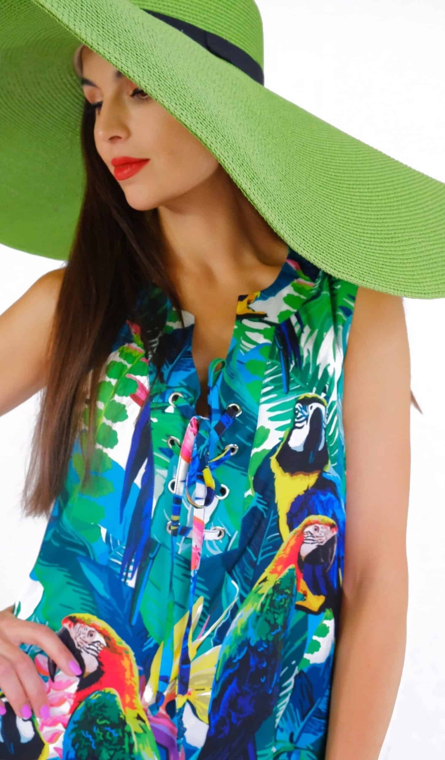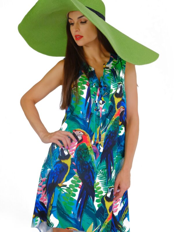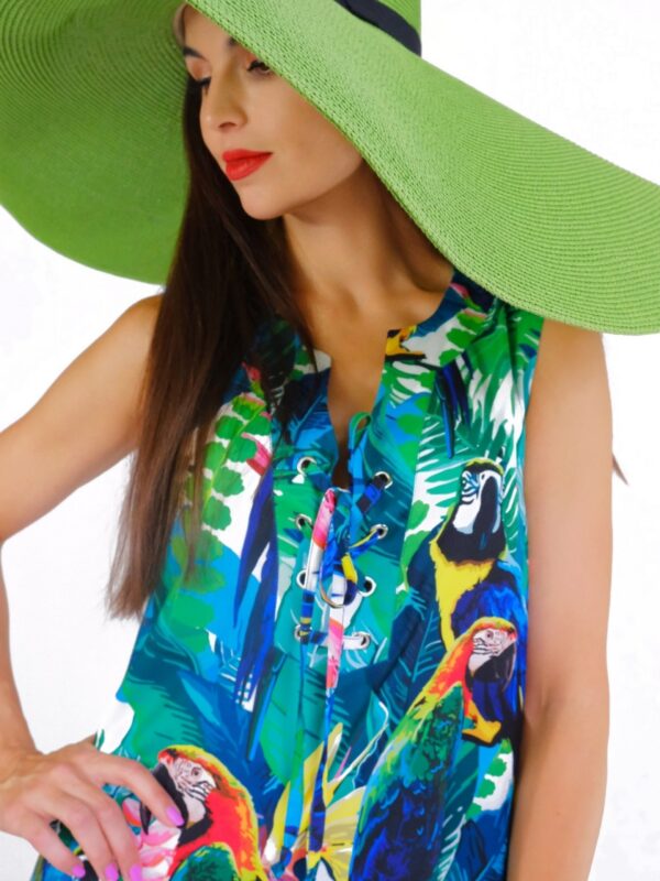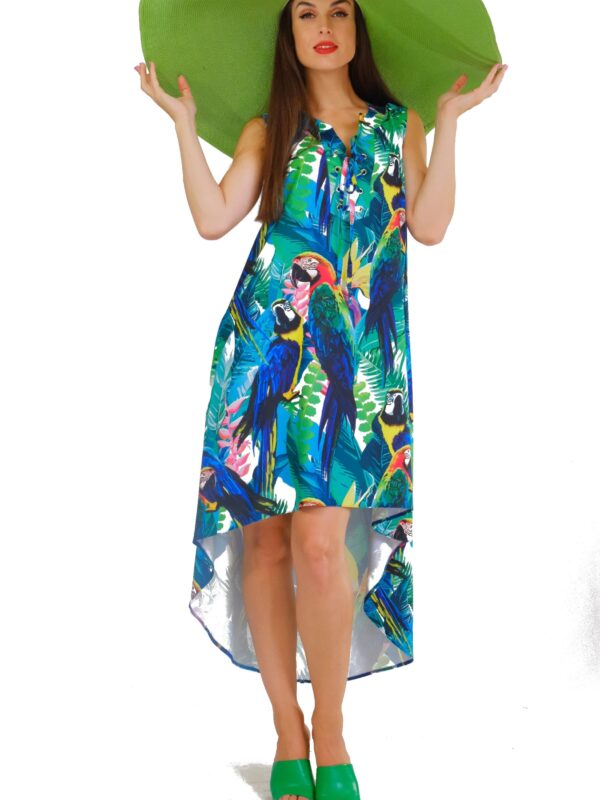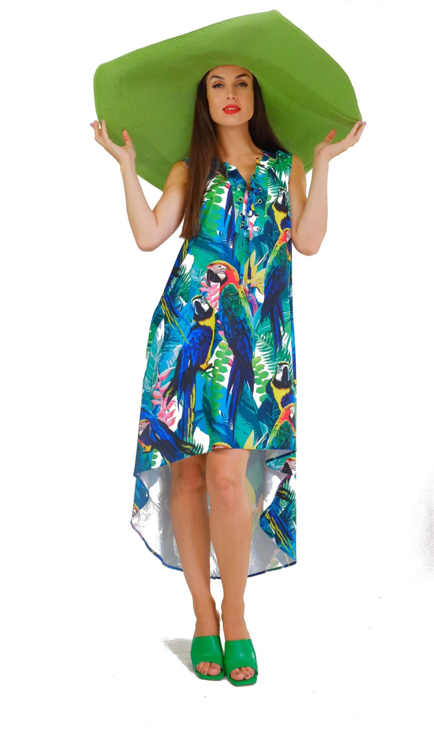 Šaty sú navrhnuté v rozširujúcom sa áčkovom strihu bez rukávov a v kombinácii s veselým vzorom sú stelesnením leta alebo dovolenky. Šaty si ľahko prehodíte aj na plavky na dovolenke a zároveň môžu poslúžiť skvele na letnú oslavu alebo dovolenku. Zaujímavým detailom je asymetrický strih keď je predný diel kratší ako zadný a vytvára dojem vlečky. Šaty majú krásny a farebný vzor ako vystrihnutý z lesného pralesa zvoľte k nim žiarivé doplnky v modrej, zelenej alebo žltej farbe pre skutočný letný look.