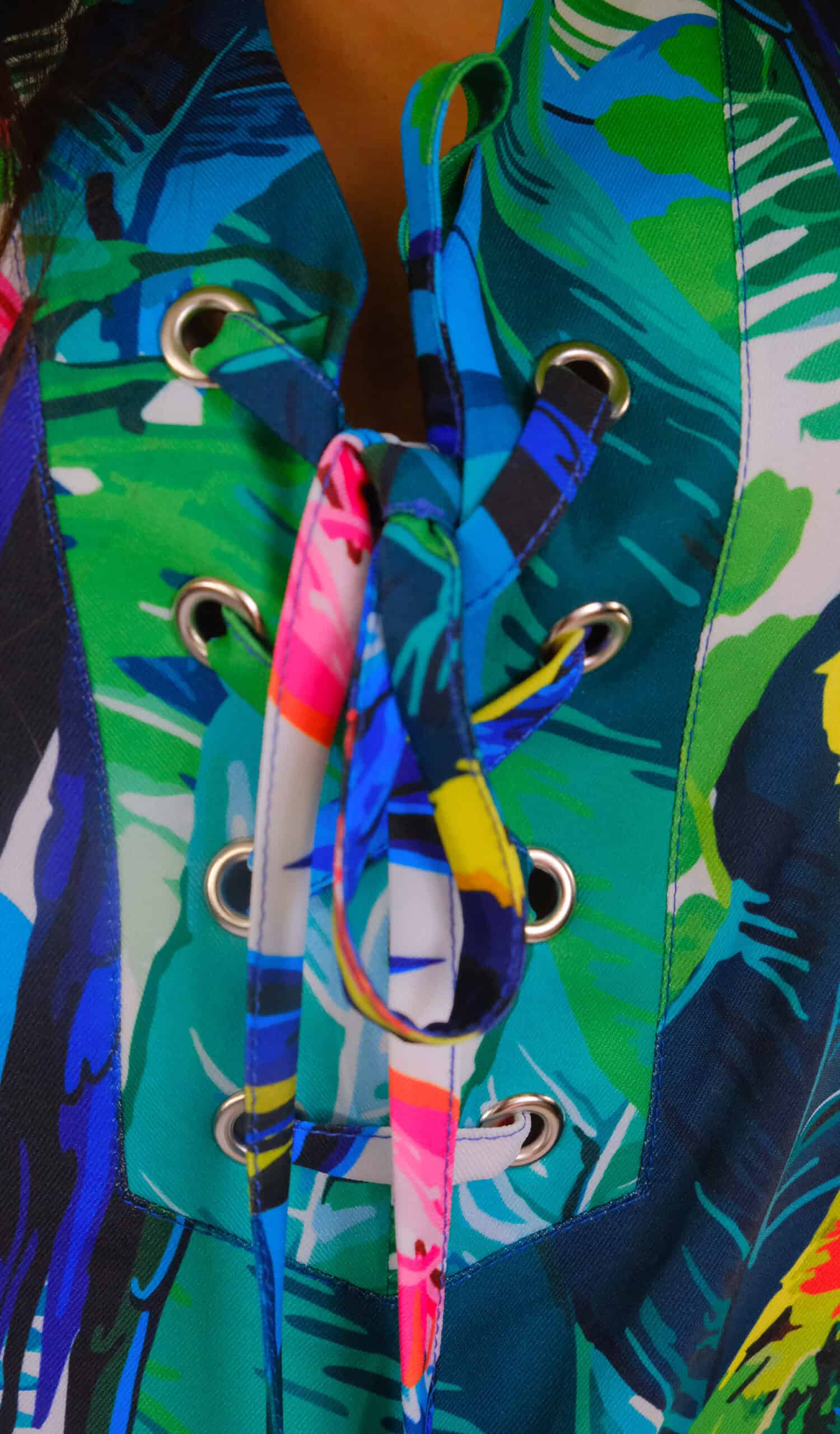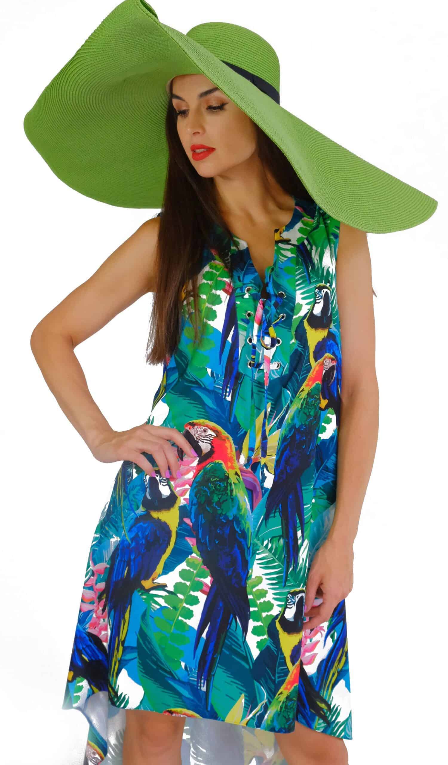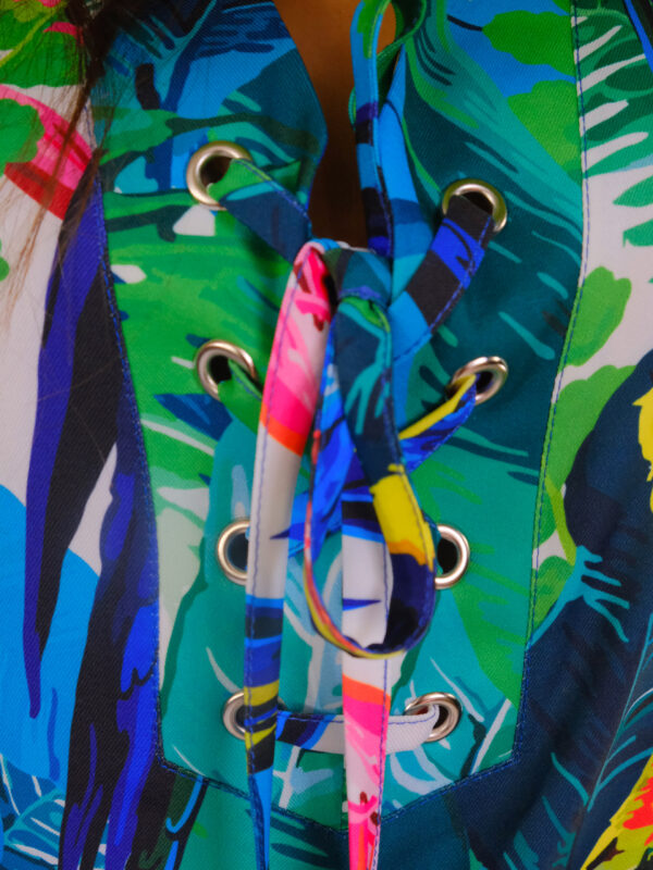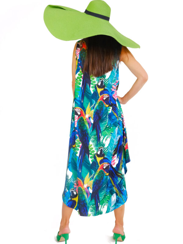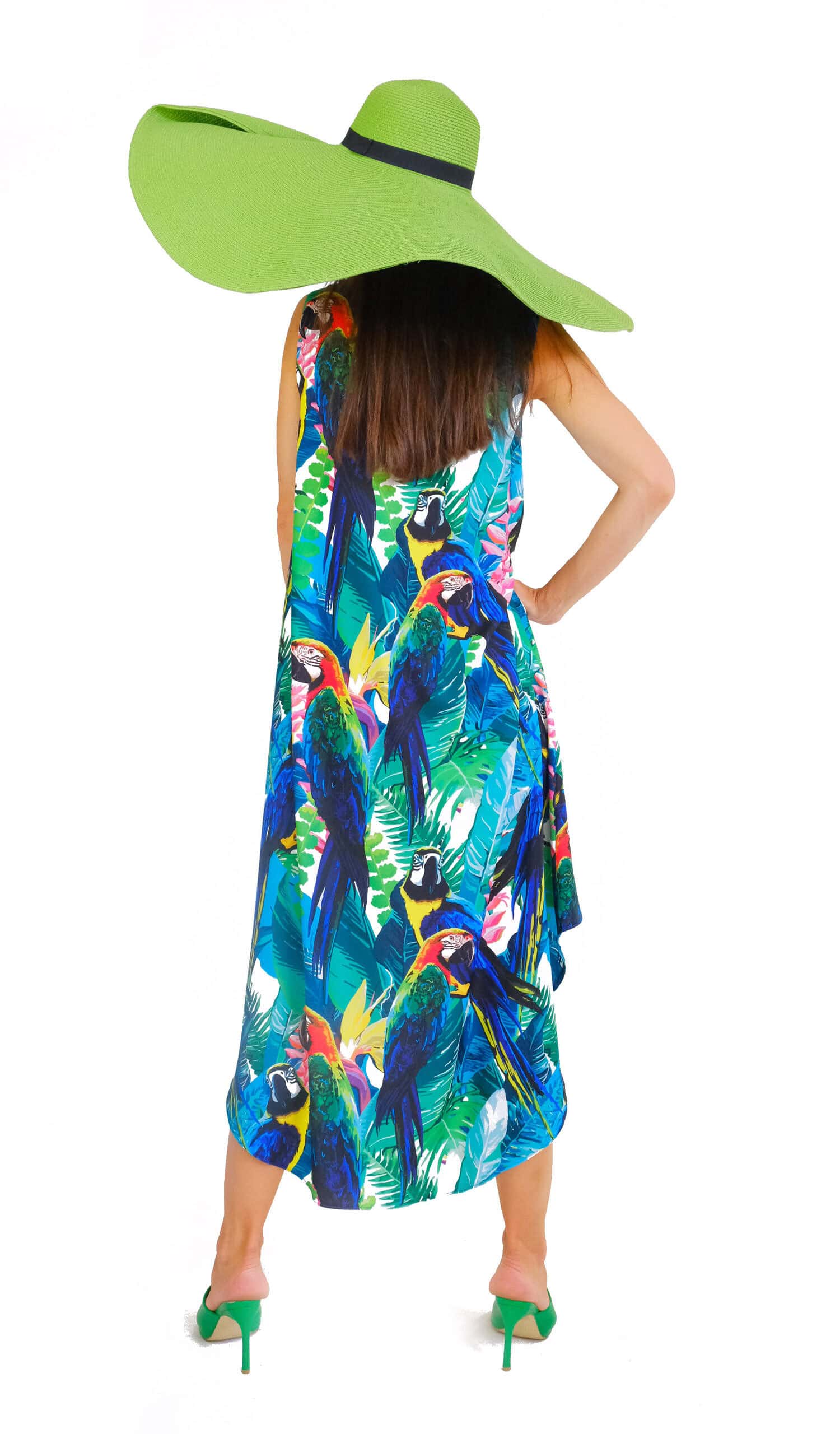 Šaty sú navrhnuté v rozširujúcom sa áčkovom strihu bez rukávov a v kombinácii s veselým vzorom sú stelesnením leta alebo dovolenky. Šaty si ľahko prehodíte aj na plavky na dovolenke a zároveň môžu poslúžiť skvele na letnú oslavu alebo dovolenku. Zaujímavým detailom je asymetrický strih keď je predný diel kratší ako zadný a vytvára dojem vlečky. Šaty majú krásny a farebný vzor ako vystrihnutý z lesného pralesa zvoľte k nim žiarivé doplnky v modrej, zelenej alebo žltej farbe pre skutočný letný look.