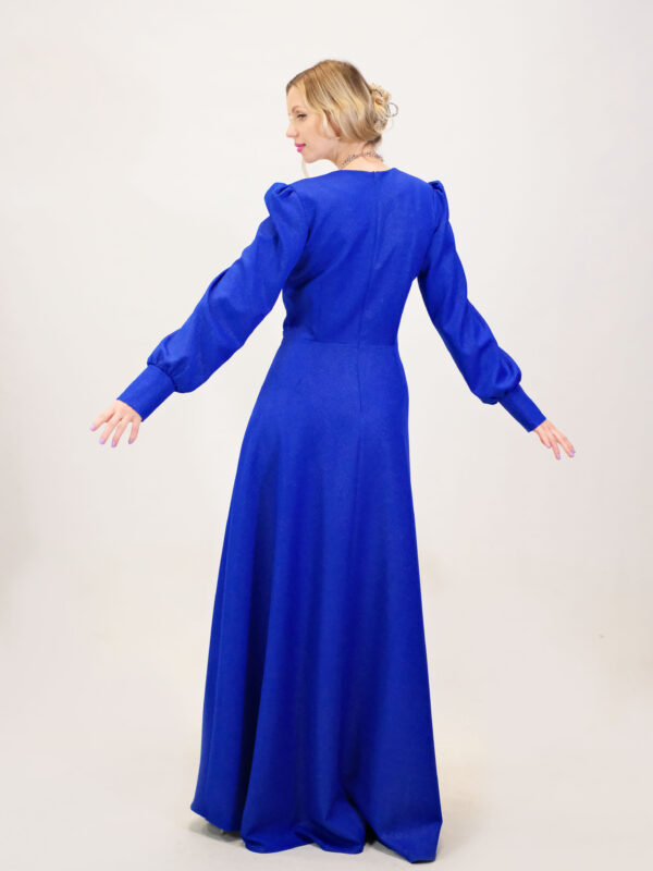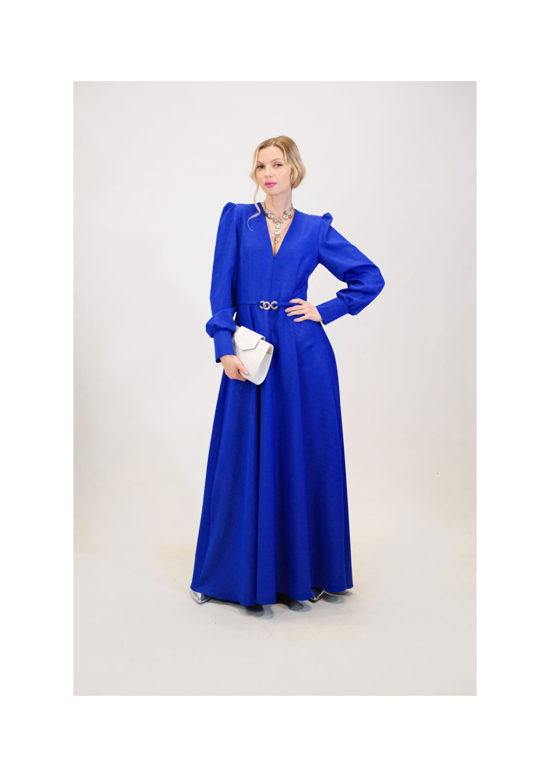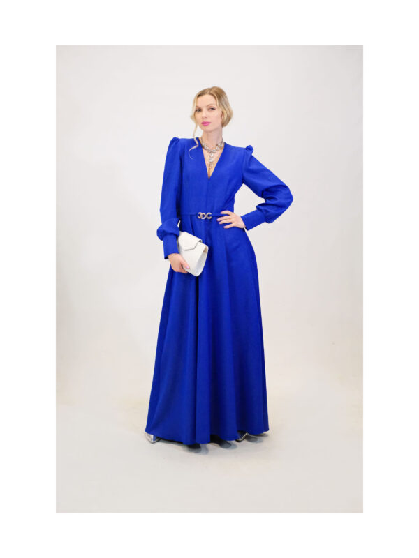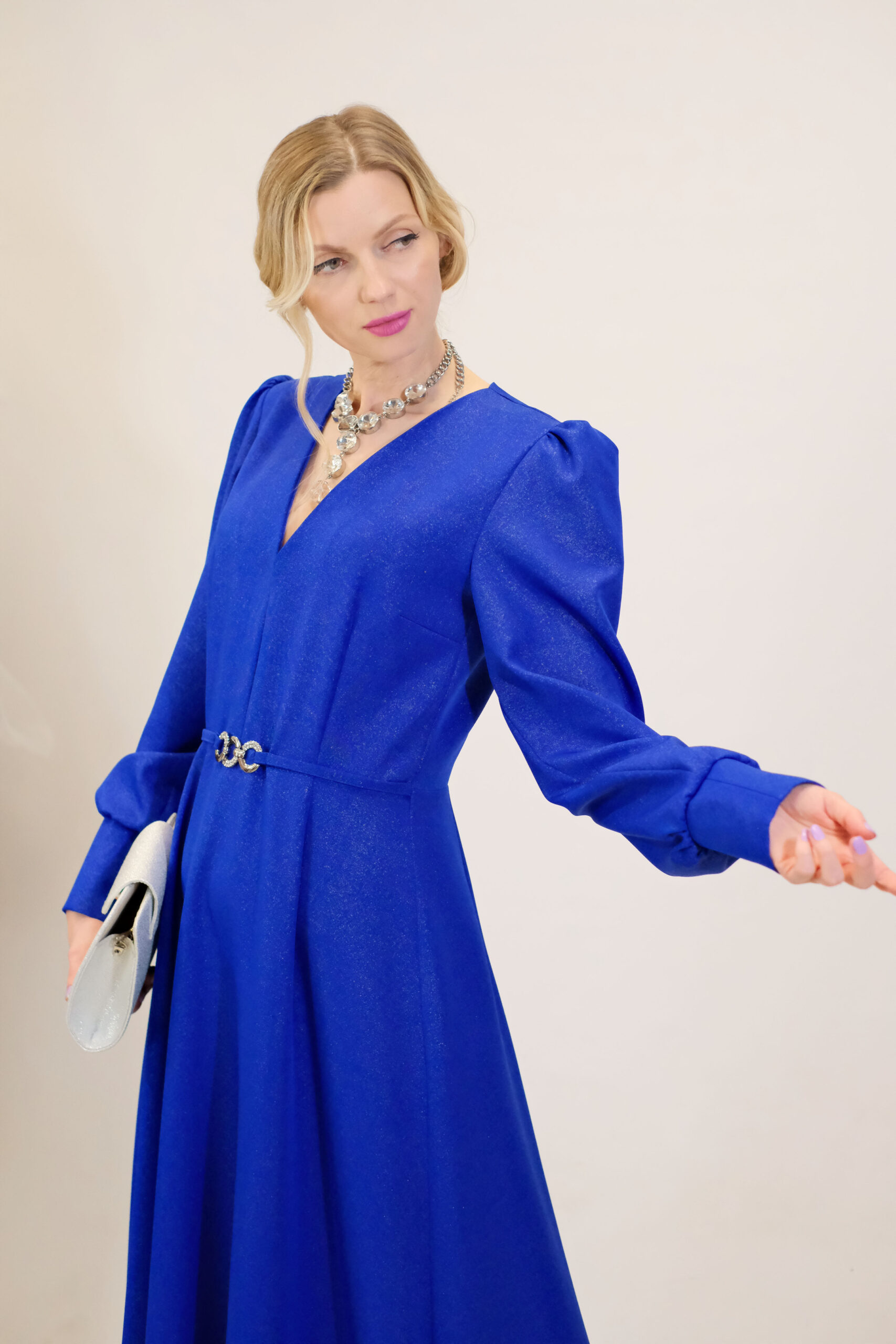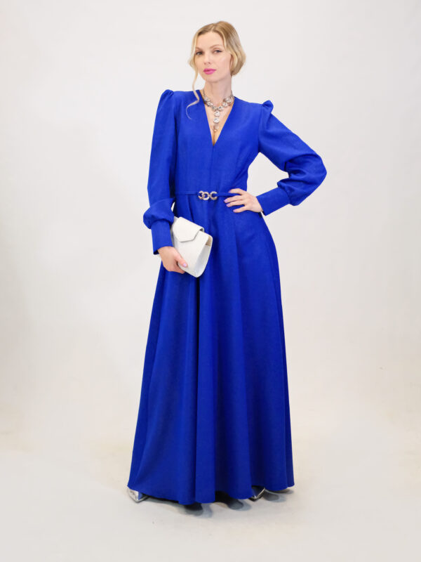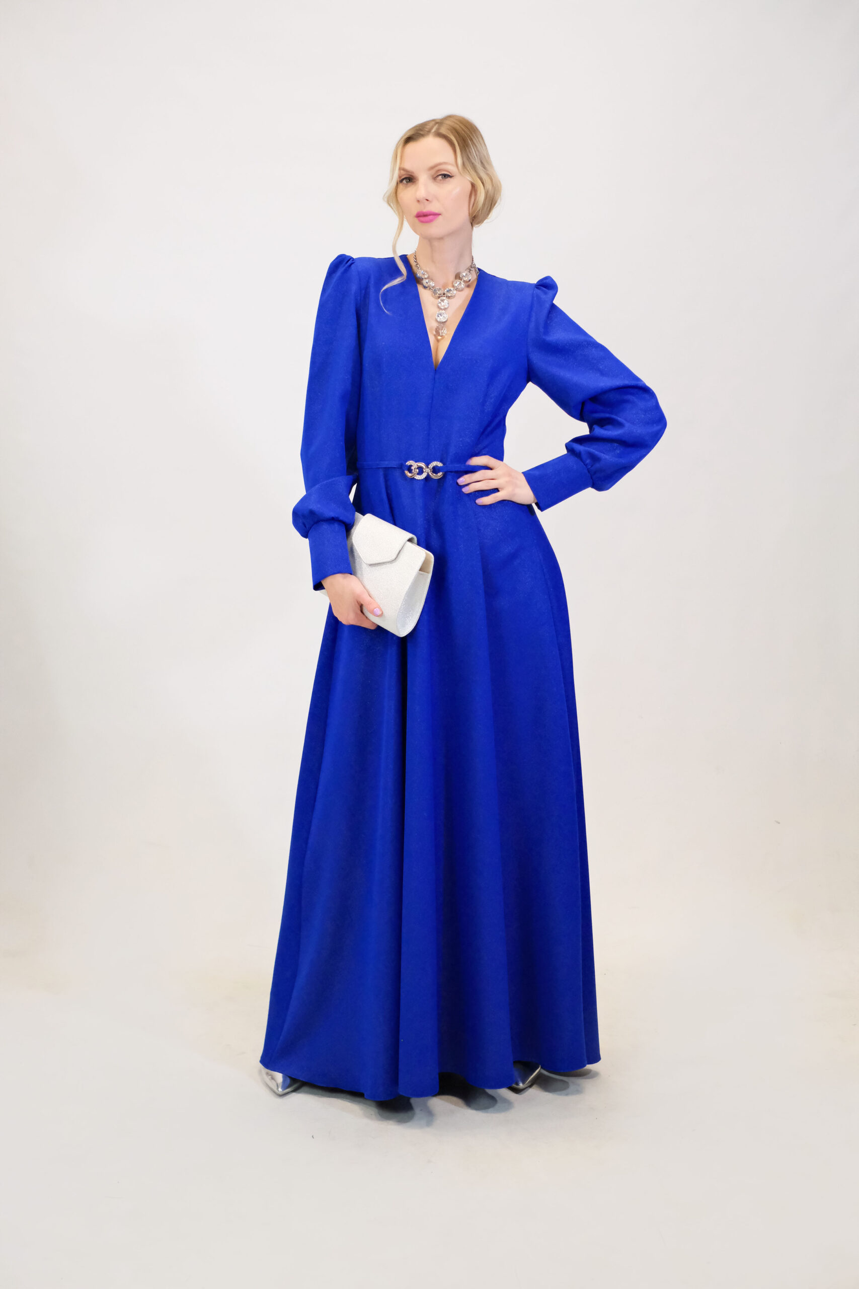 Šaty sú ušité v nádhernom prepracovom strihu s dĺžkou až po zem . Šaty sú navrhnuté v prenikavej modrej látke, ktorá je posiata striebornými trblietkami ako na nočnej oblohe. Šaty sú navrhnuté v strihu, ktorý sa Vám prispôsobí v hornej časti a áčková suknica Vám dodá voľnosť na pohyb aj tanec. Výrazným prvkom šiat je strieborný opasok v oblasti pásu. Šaty majú riasené rukávy na ramenách. Kombinujte so striebornými alebo metalickými doplnkami ako naša aranžérka.