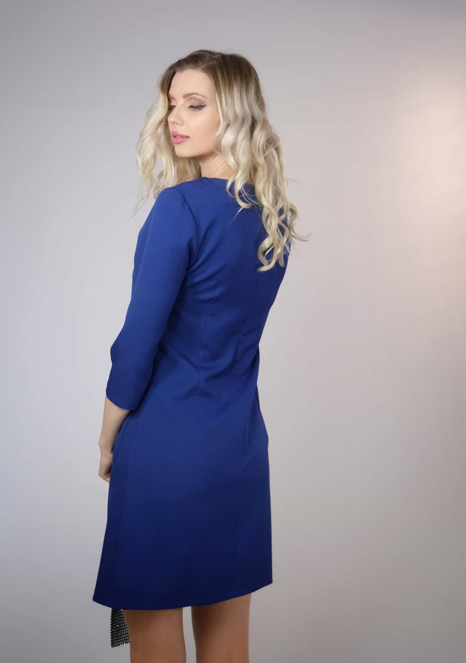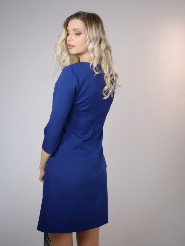 Šaty ušité v pohodlnom áčkovom strihu , ktorý výborne sadne na každý typ postavy. Šaty sa skvele hodia na bežné nosenie do officu a pri kombinácii so striebornými doplnkami aj na párty. Zaujímavým detailom je strieborná ozdobná spona vo výstrihu, ktorá šatám dodáva šmrnc. Tmavomodrá farba sa dá kombinovať s celým Vaším šatníkom.