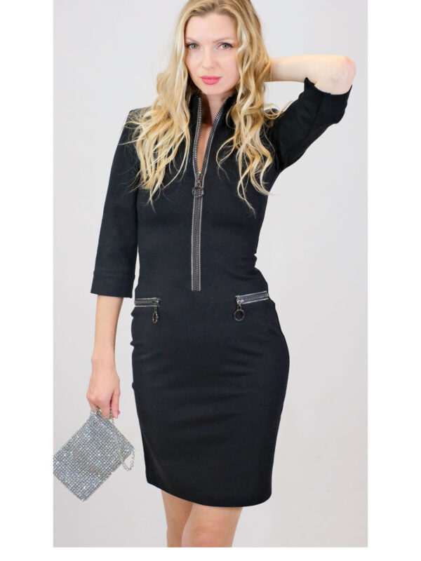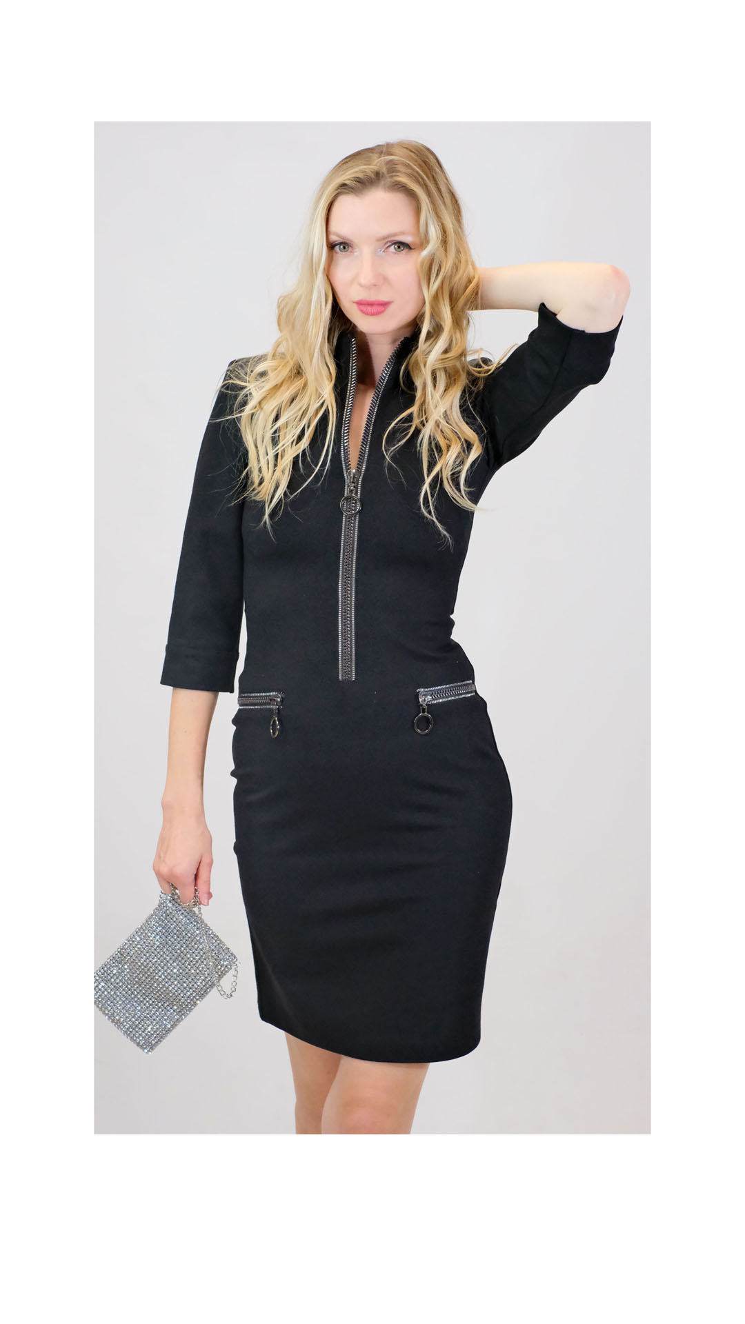 Šaty sú navrhnuté z elastického úpletu, ktorý sa prispôsobí vašej postave. Šaty sú ušité s výraznými zipsami, ktoré im dodávajú ležérny nádych. Šaty majú rukávy po lakte. Zaujímavým detailom je koženka na ramenách. Šaty sa dajú nosiť do spoločnosti, ako aj na bežný deň do práce. Šaty sú ušité v nesmrteľnej čiernej farbe, ktorá sa dá kombinovať s celým farebným spektrom doplnkov.