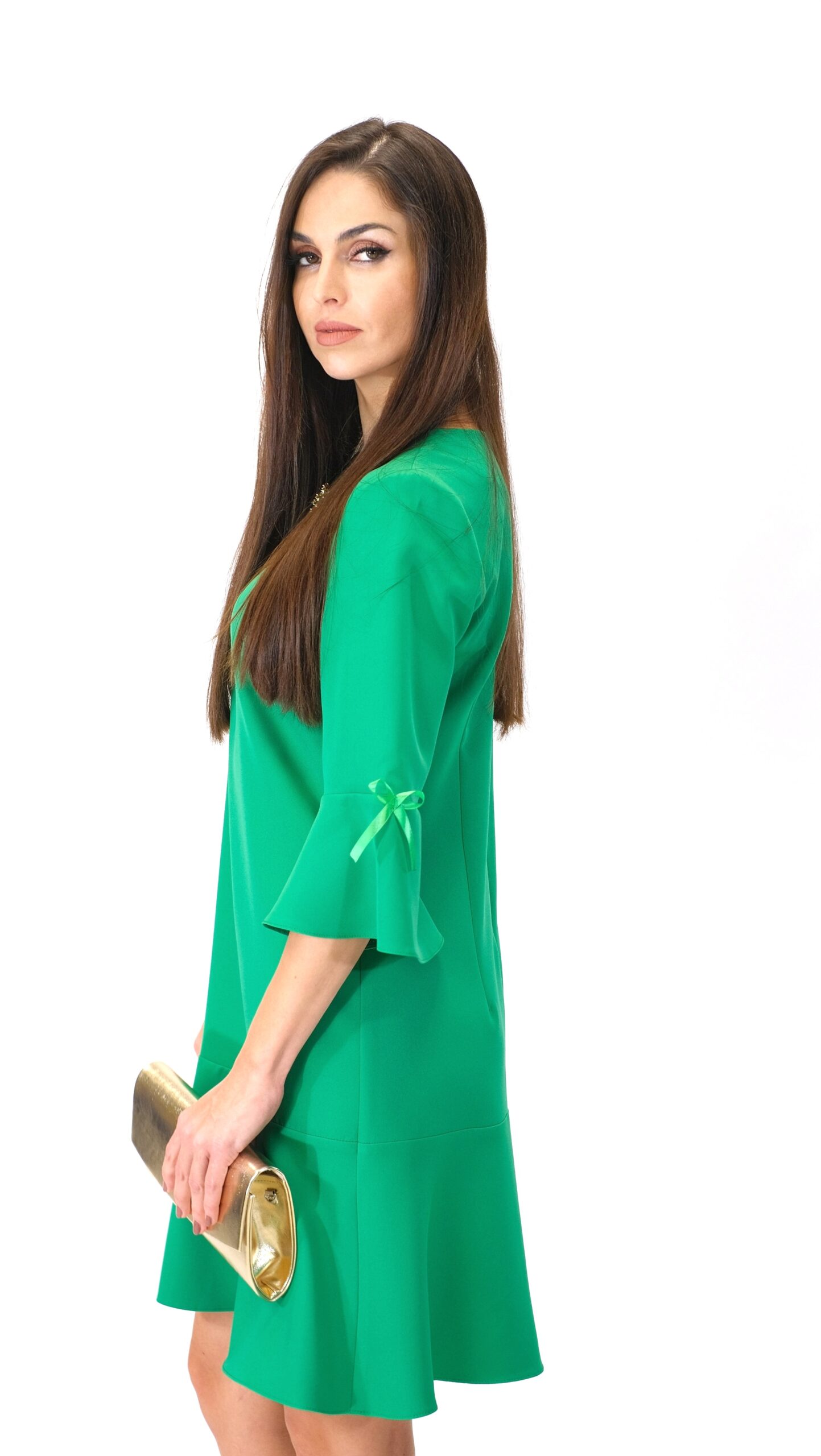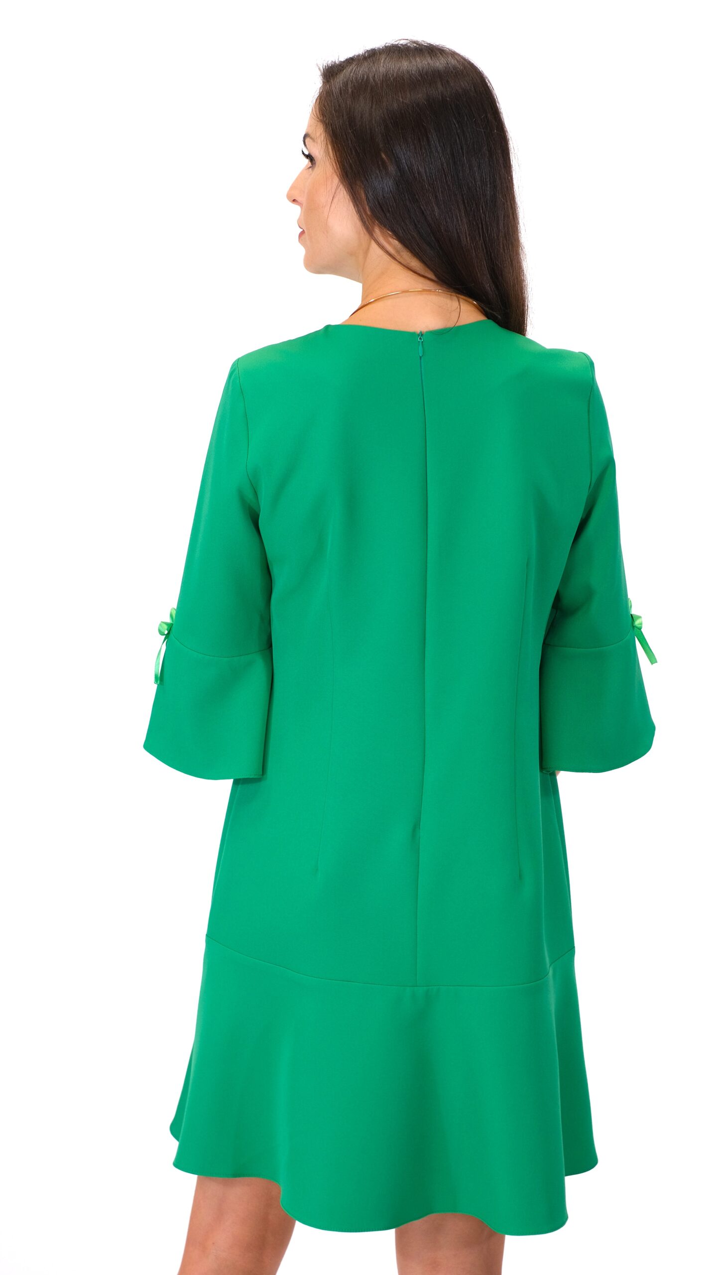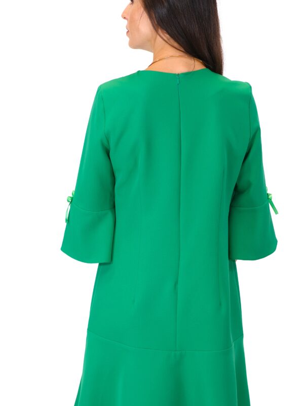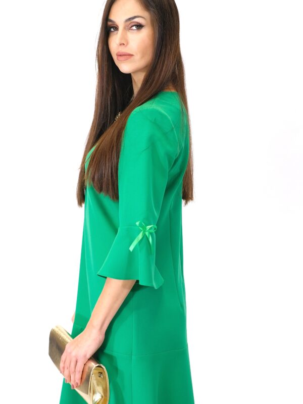 Šaty sú ušité v jednoduchom áčkovom strihu, ktorý výborne sadne na každý typ postavy. Zaujímavým detailom šiat je volánové zakončenie rukávov, čo im dodáva romantický nádych. Jednoduchosť strihu šiat necháva naplno vyniknúť žiarivej farbe ako napríklad trávovo zelená