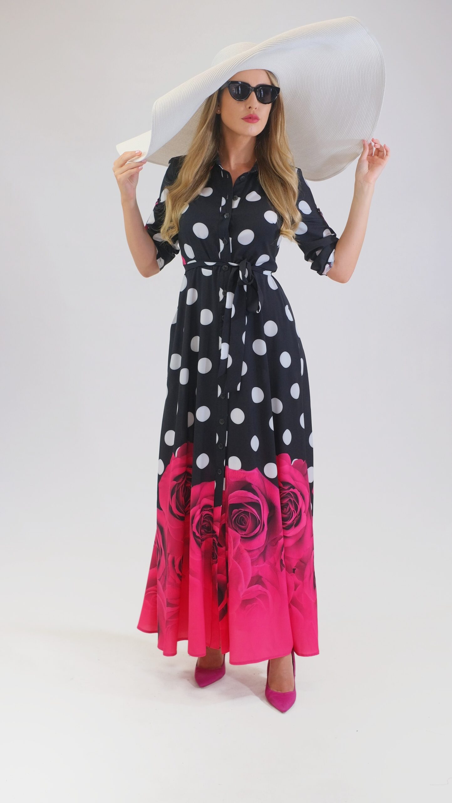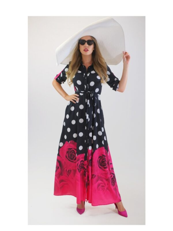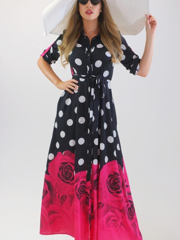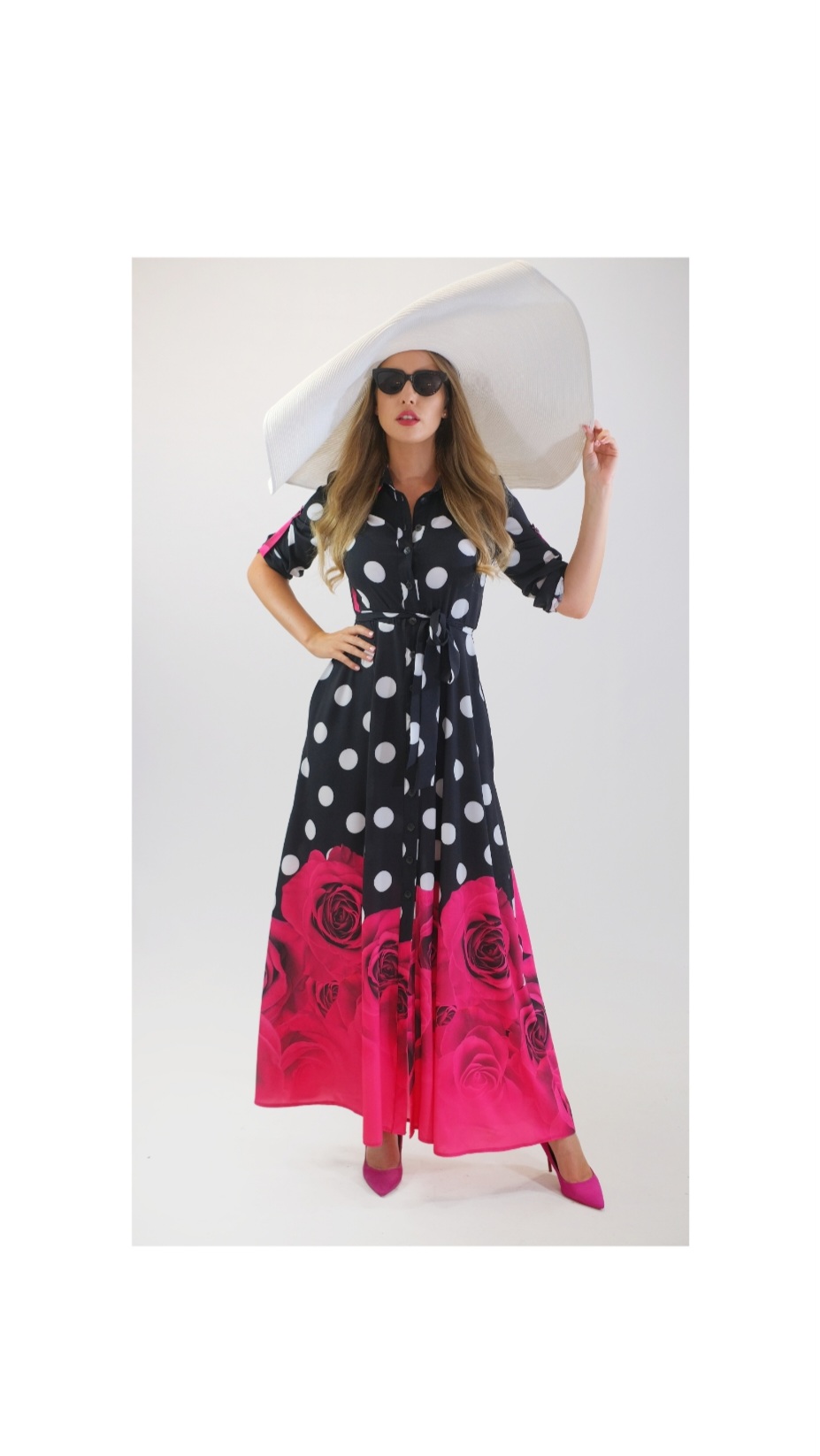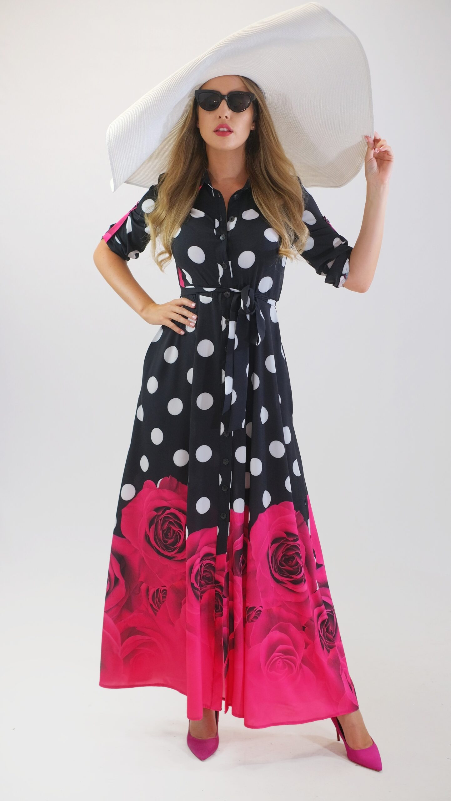Šaty sú ušité vo vašom obľúbenom košeľovom strihu, v ktorom sa budete cítiť komfortne kdekoľvek. Šaty sú navrhnuté kombináciou vzorov, kde prím hra nesmrteľná bodka, ktorá sa objavuje na mólach módnych návrhárov už niekoľko desaťročí a 3-D realistické ruže v nádhernej cyklaménové farbe. Šaty majú rukávy ktoré sa dajú vyhrnúť, čo im dodáva na komforte aj počas horúcich letných dní. Šaty môžete kombinovať s doplnkami ako naša aranžérka pre wow efekt. Šaty majú opasok z vlastného materiálu, ktorým si môžete zúžiť pás.