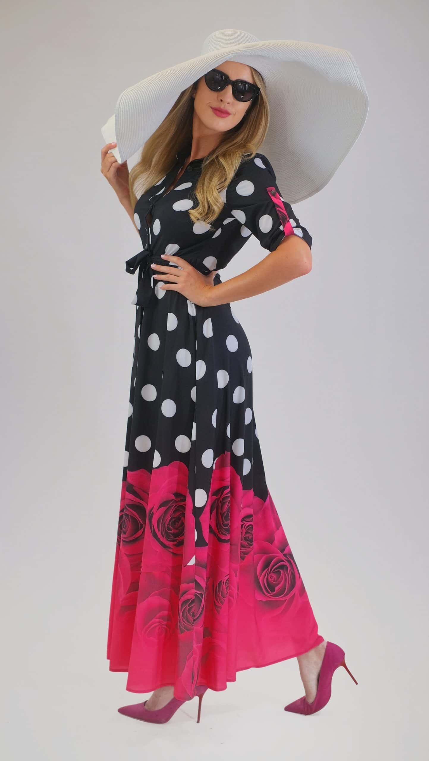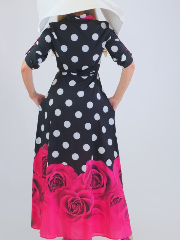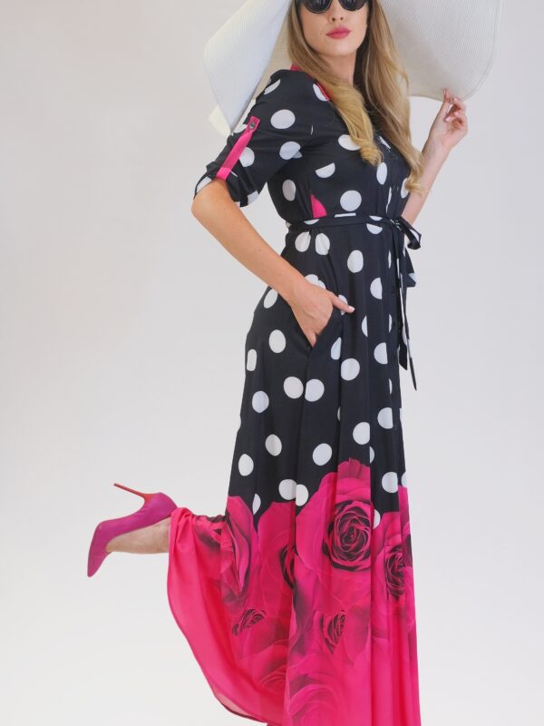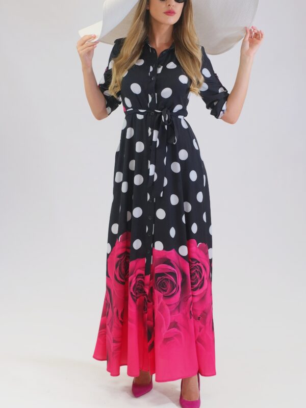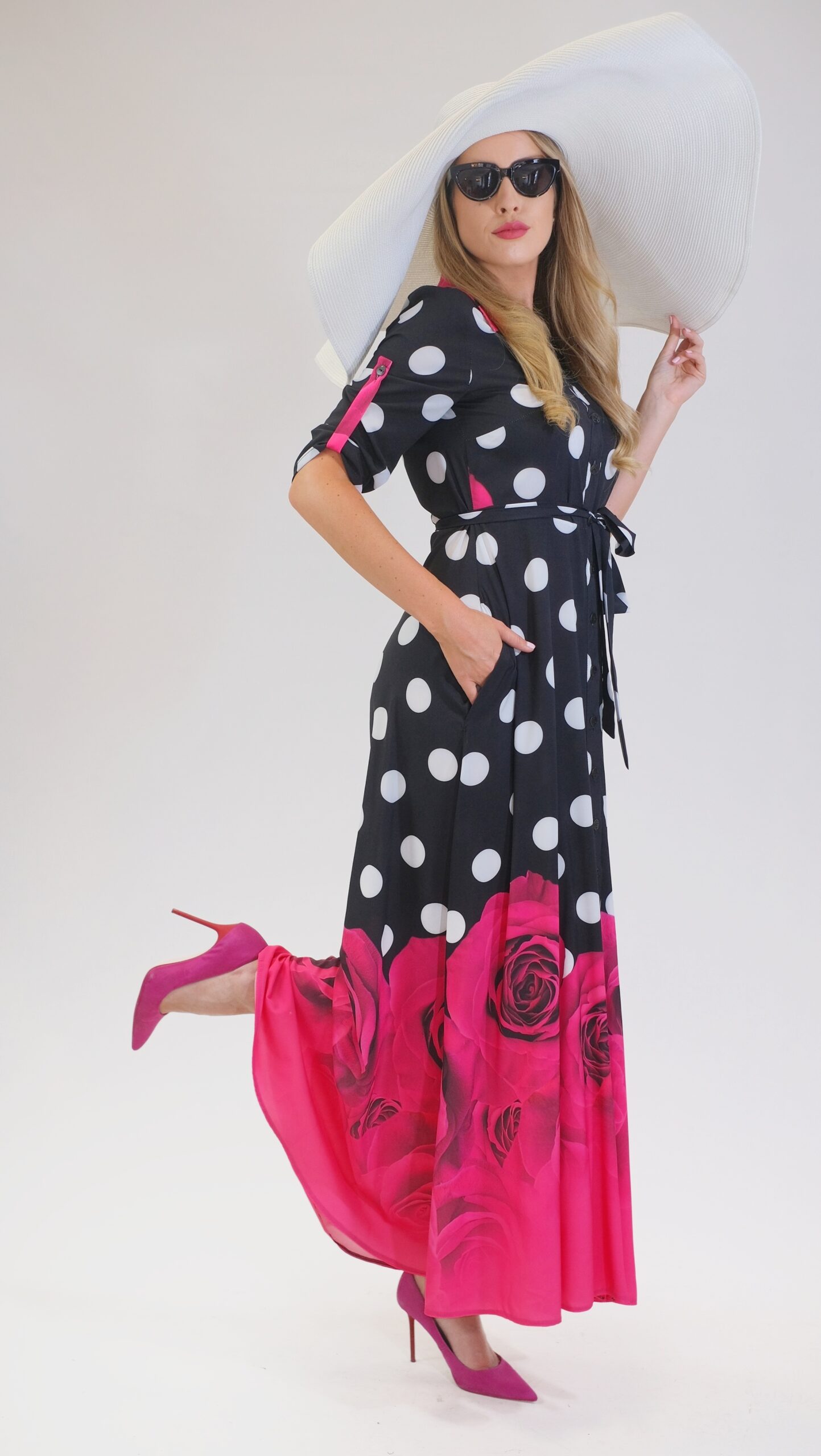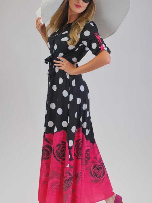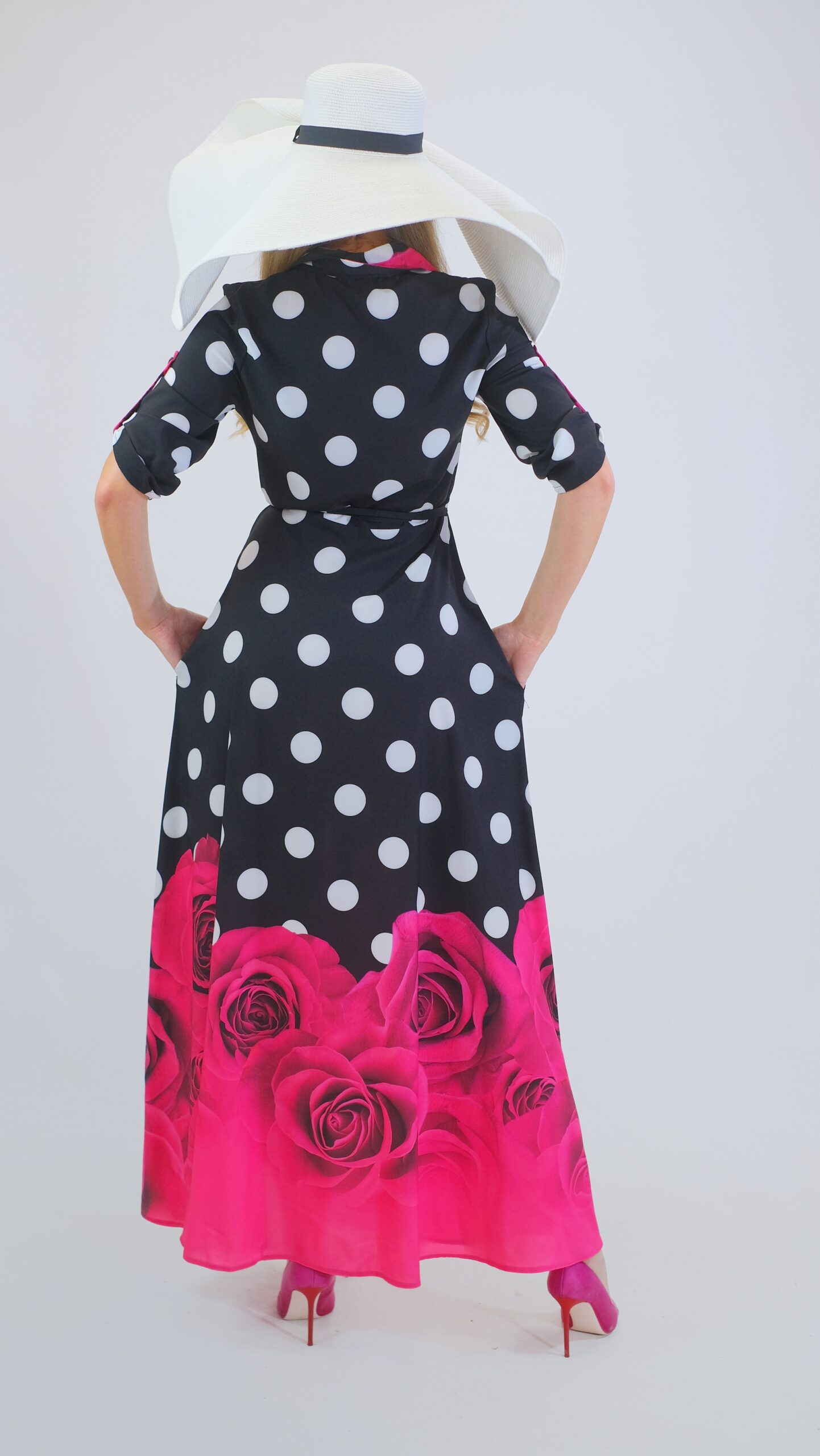 Šaty sú ušité vo vašom obľúbenom košeľovom strihu, v ktorom sa budete cítiť komfortne kdekoľvek. Šaty sú navrhnuté kombináciou vzorov, kde prím hra nesmrteľná bodka, ktorá sa objavuje na mólach módnych návrhárov už niekoľko desaťročí a 3-D realistické ruže v nádhernej cyklaménové farbe. Šaty majú rukávy ktoré sa dajú vyhrnúť, čo im dodáva na komforte aj počas horúcich letných dní. Šaty môžete kombinovať s doplnkami ako naša aranžérka pre wow efekt. Šaty majú opasok z vlastného materiálu, ktorým si môžete zúžiť pás.